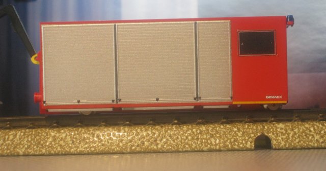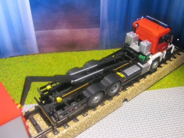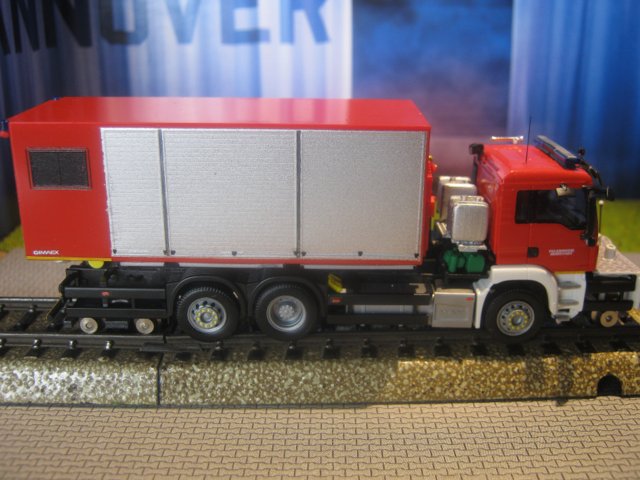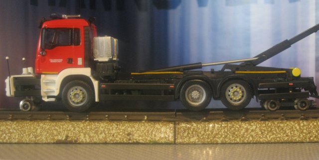 Der Wechselaufbau ist ne Herpa-kiste, die nur aufgepimpt wurde und mit zwei Achsen für die Schiene versehen wurde.