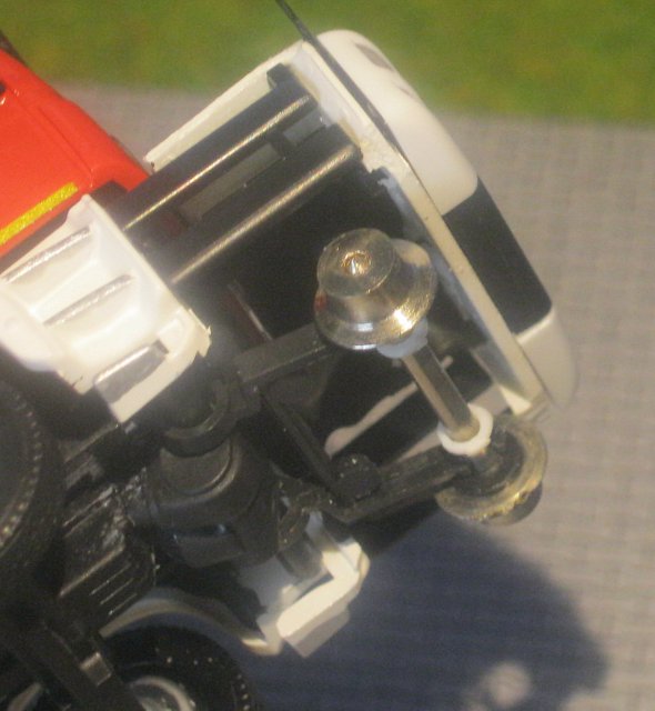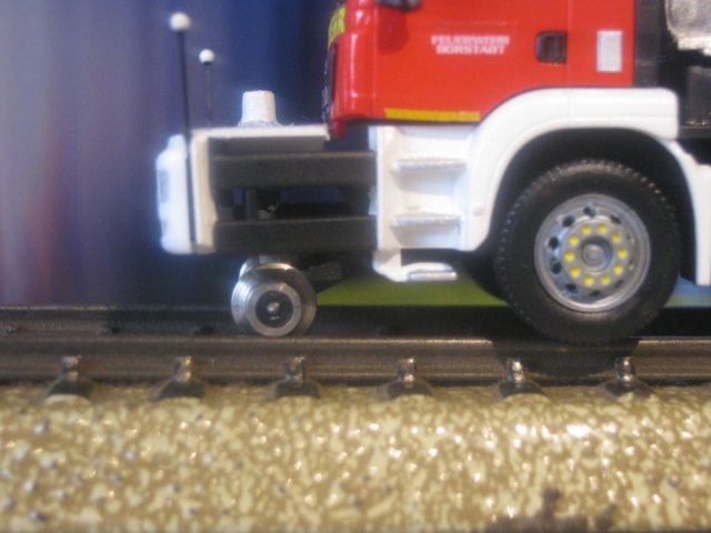 Ich bin bei den Zweiwegeeinrichtungen ein bisschen anders vorgegangen. Für die hintere habe ich ein Drehgestell des Eisenbahnwagen gekürzt, noramlerweise sind ja hier 4 Achsen und mit Vierkantprofil ausfahrbar gemacht.