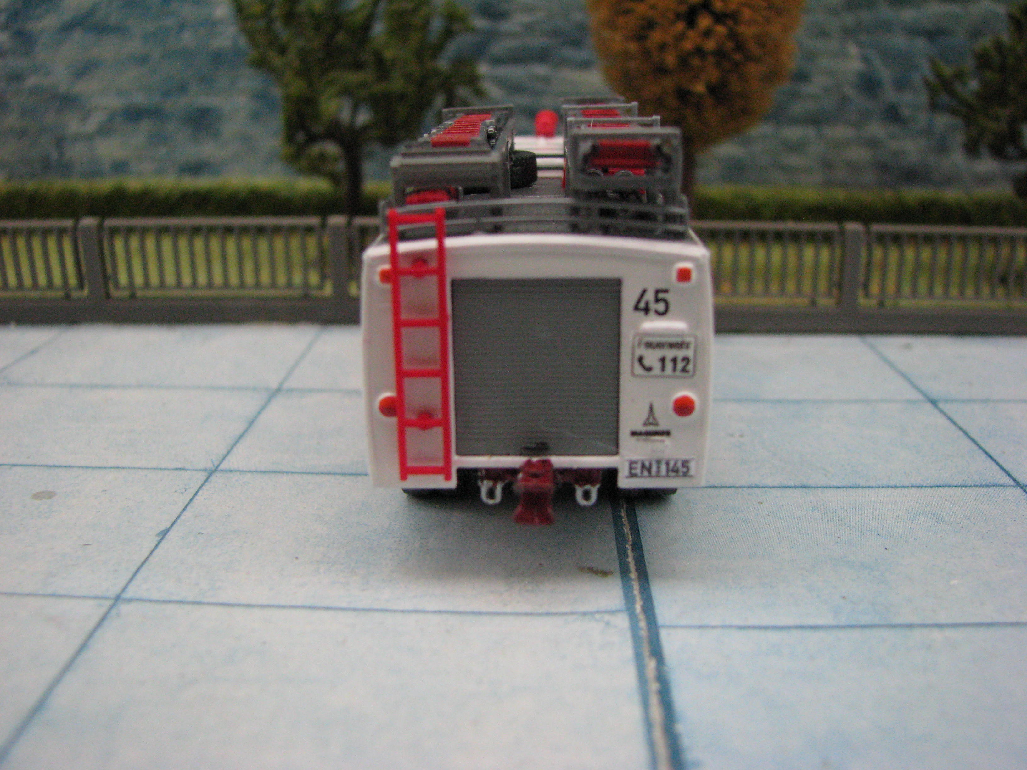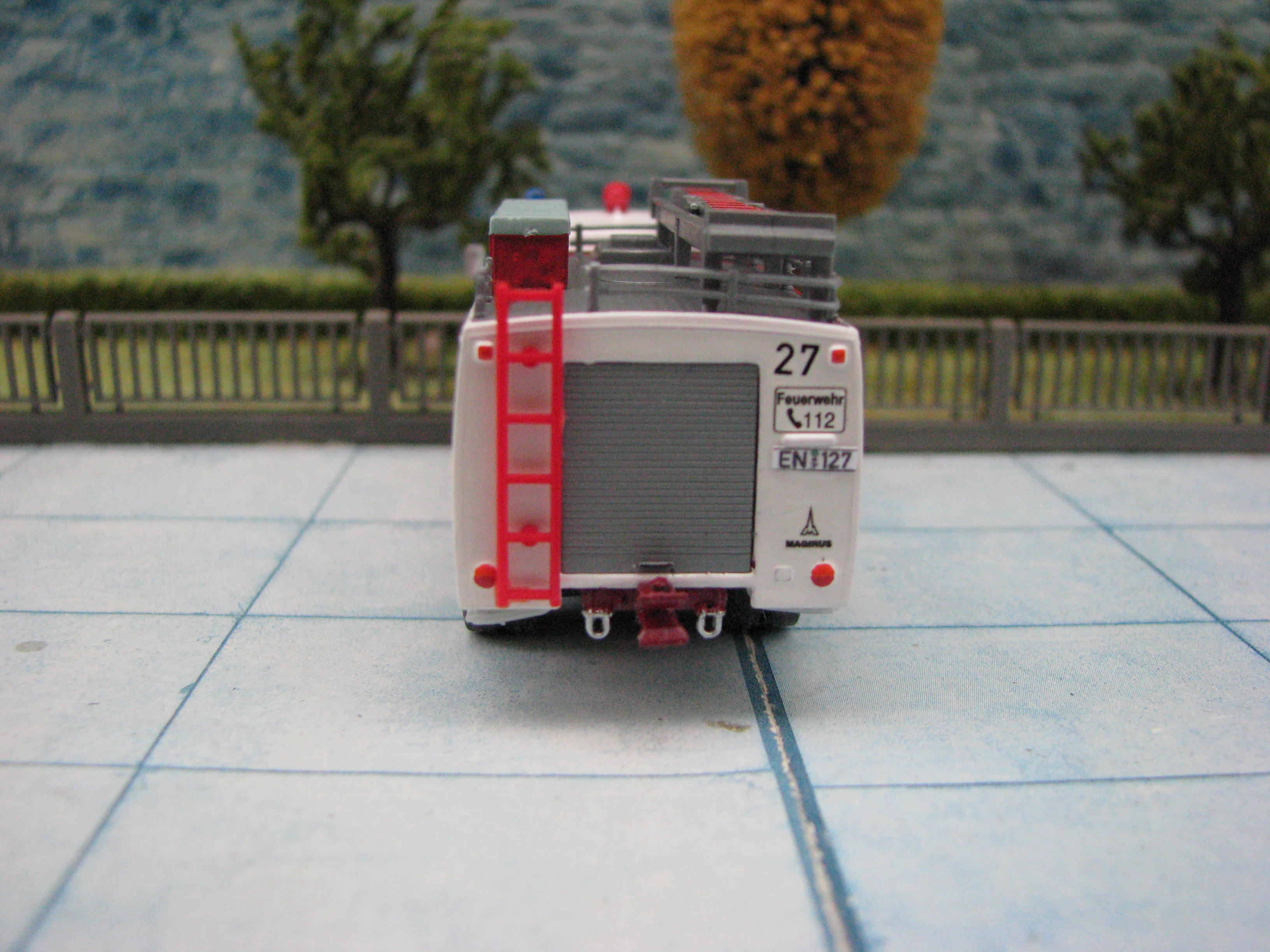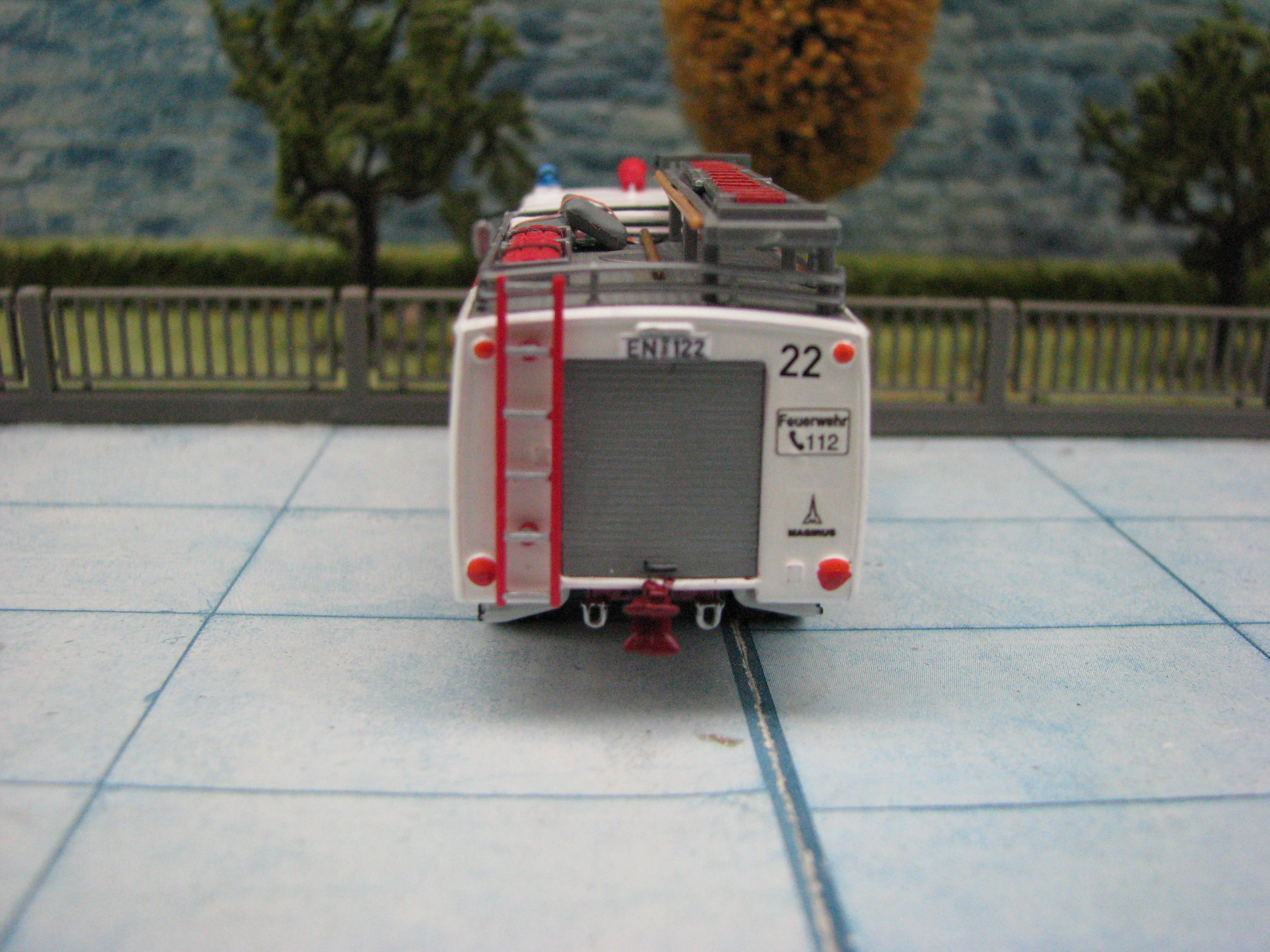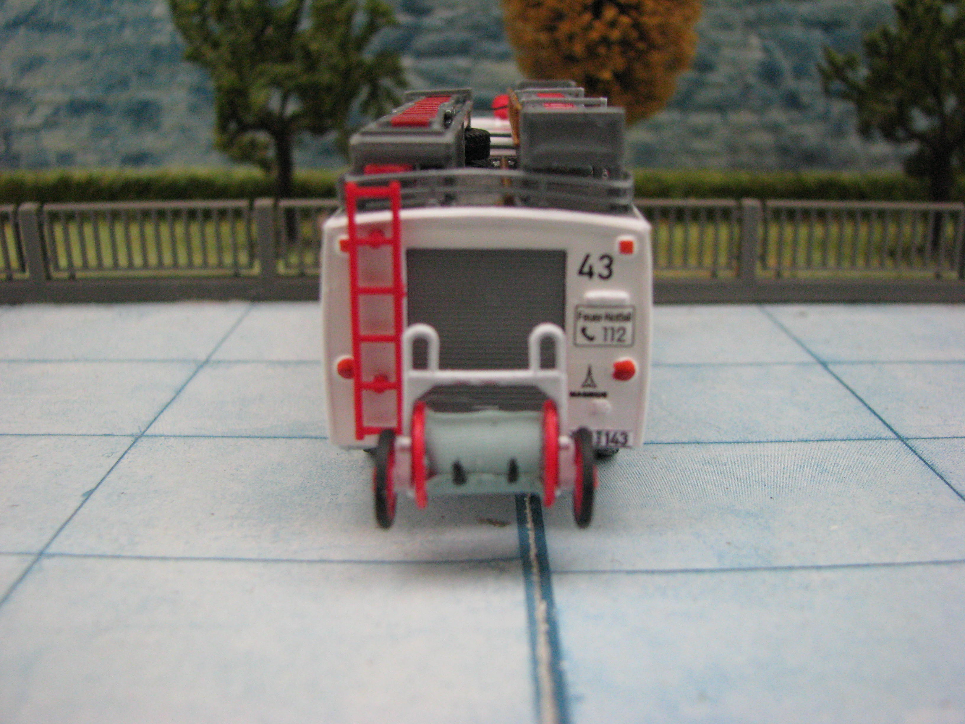 Das Rietze Modell wurde lediglich von seiner Bedruckung (Frechen) befreit und mit Decals, neuen Rückleuchten, Schlauchbrücken, Leitern, Einreißhaken sowie Sosi bestückt.