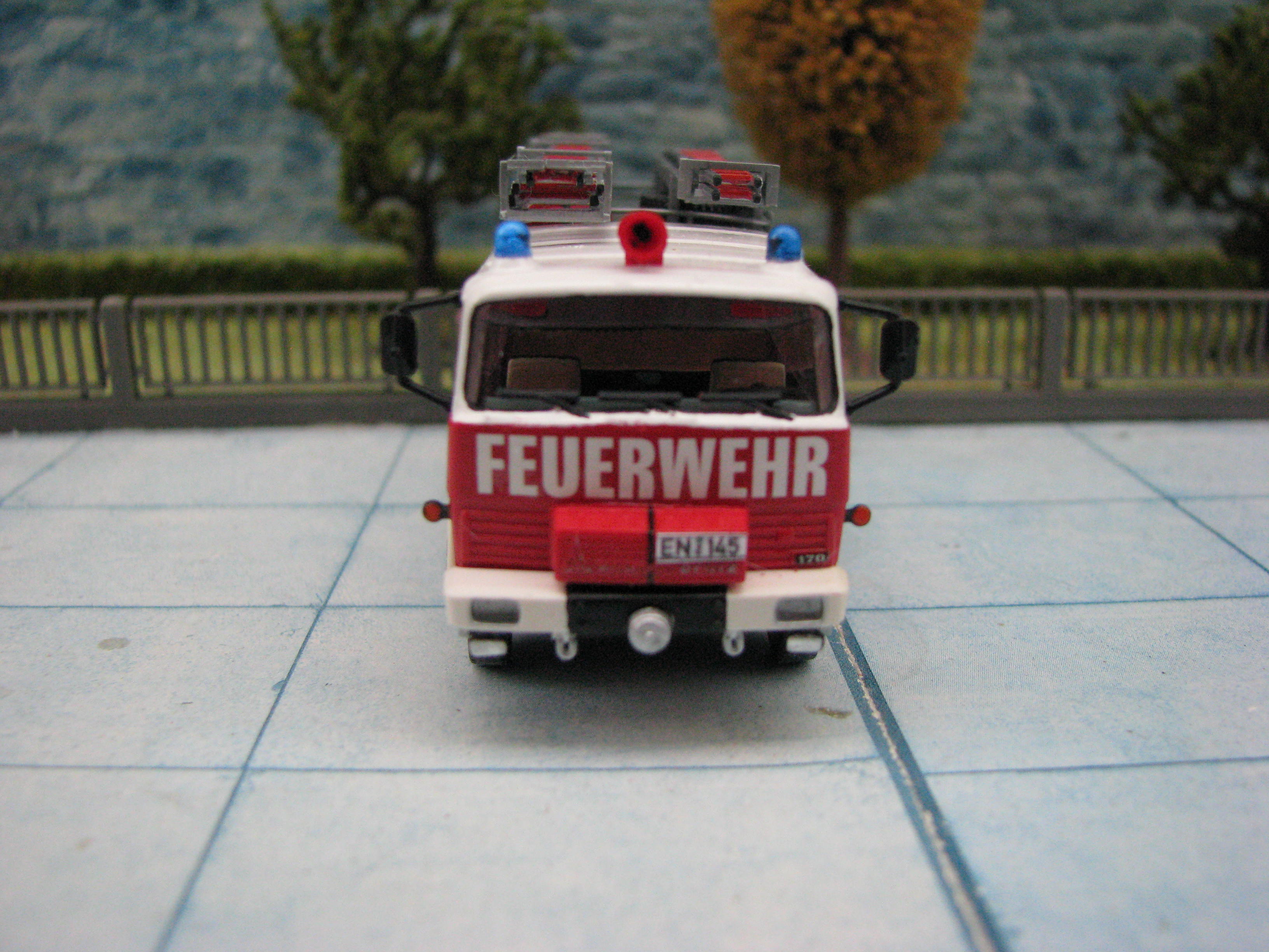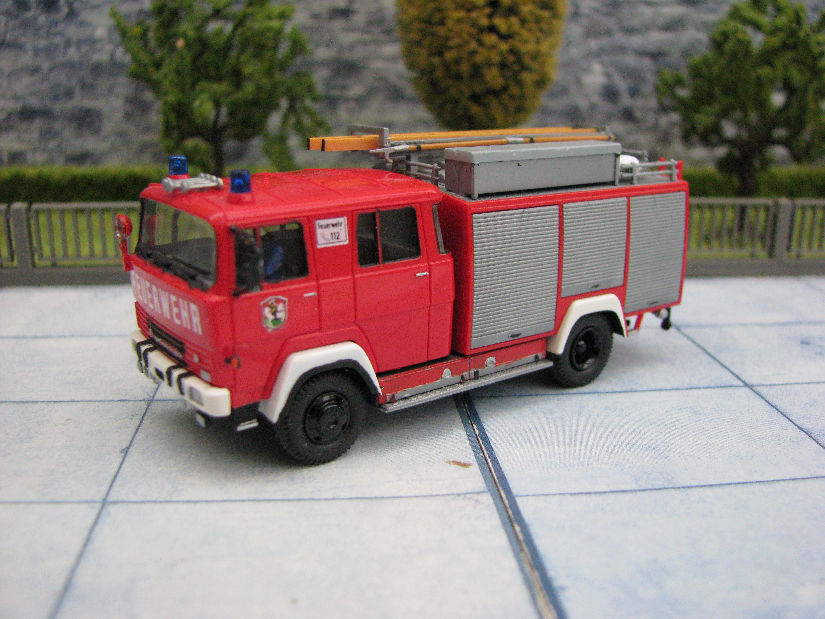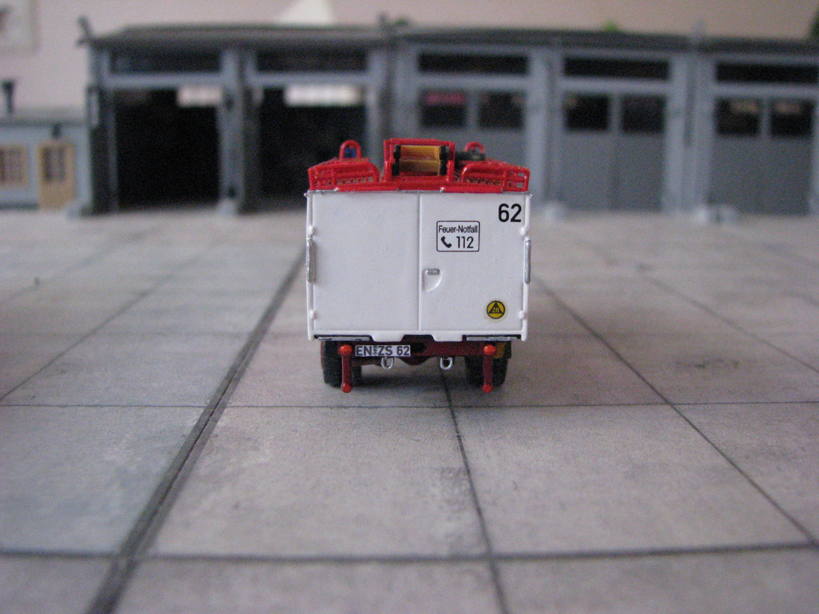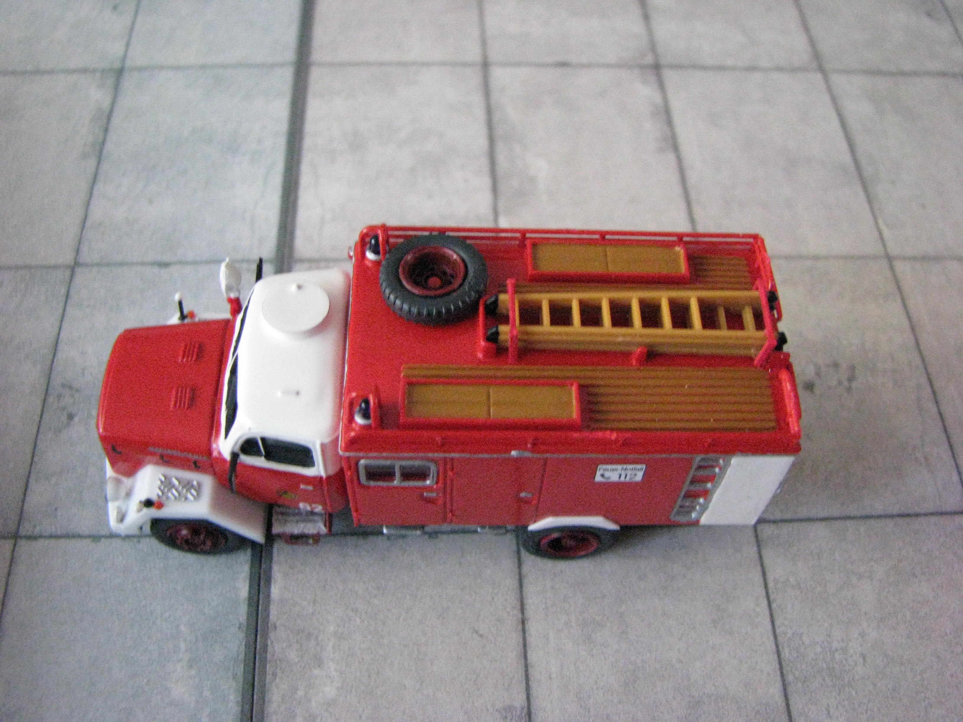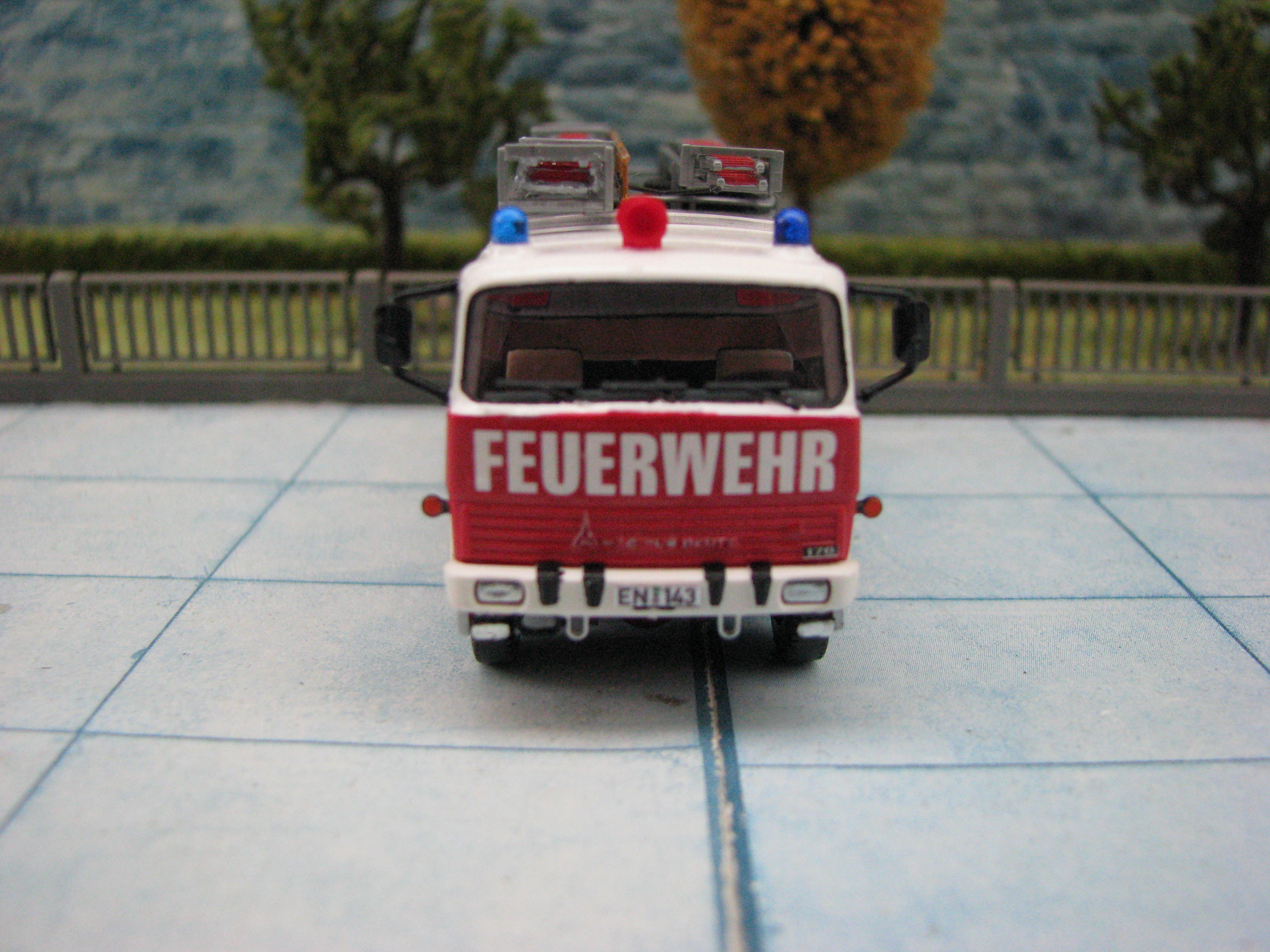 Das Rietze Modell wurde lediglich von seiner Bedruckung (Frechen) befreit und mit Decals, neuen Rückleuchten, Schlauchbrücken, Leitern, Einreißhaken sowie Sosi bestückt.