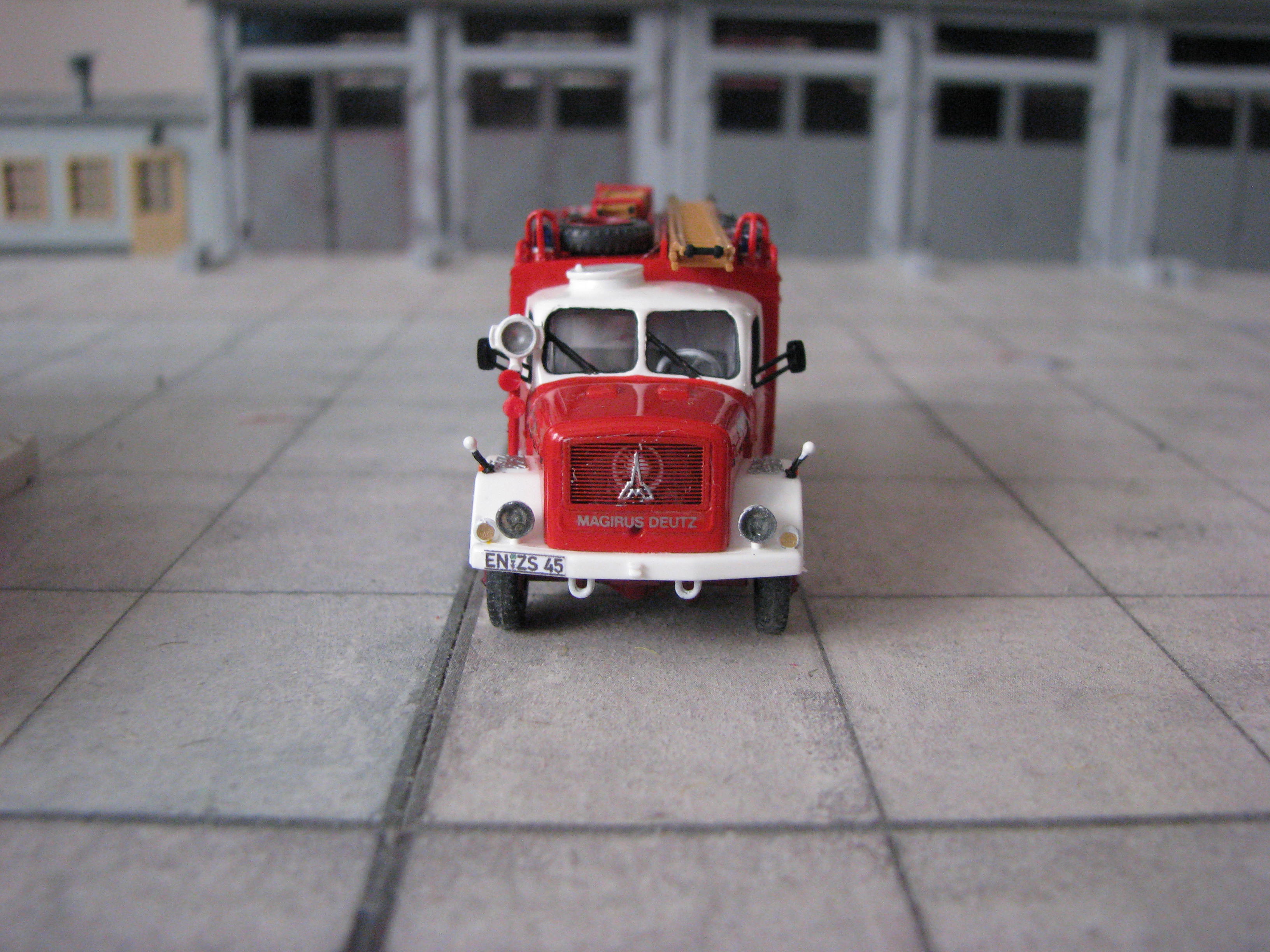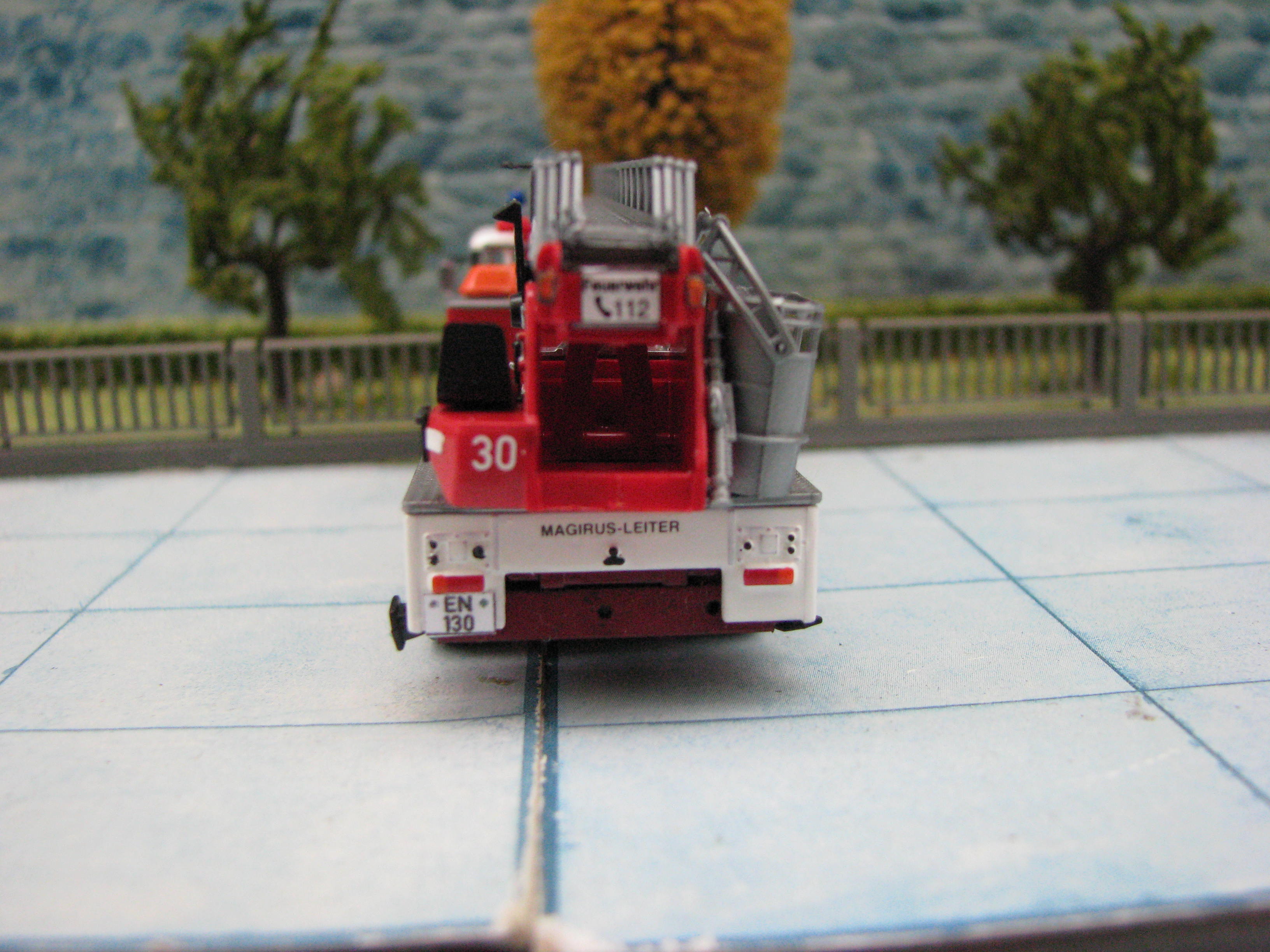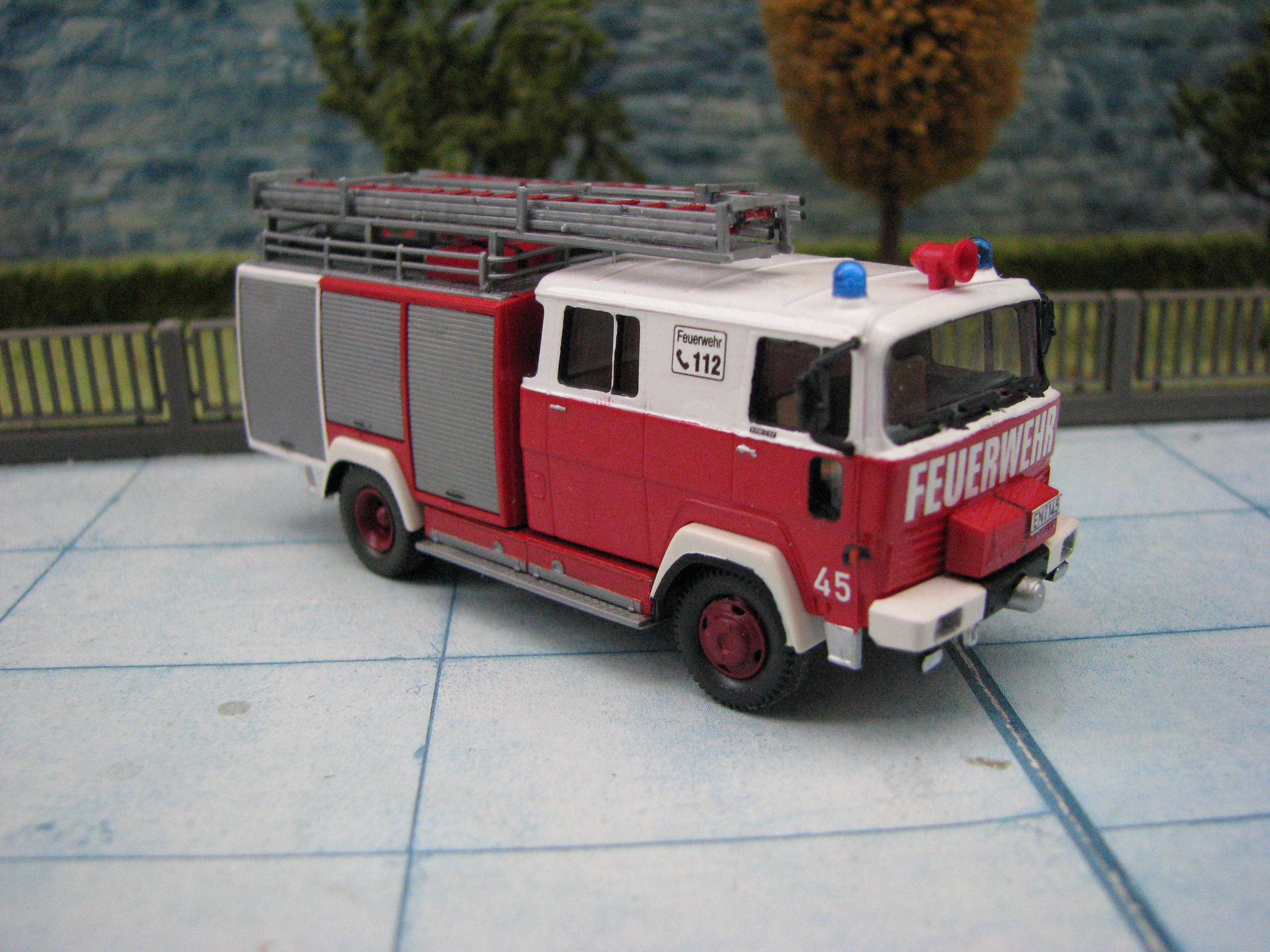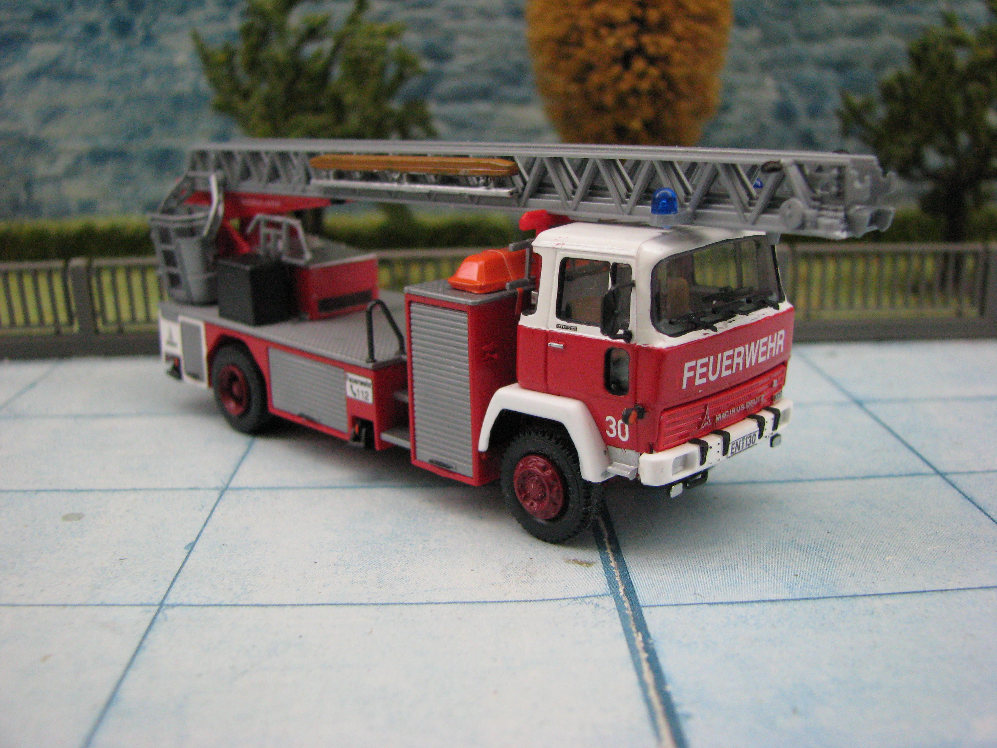 Das Rietze Modell wurde lediglich von seiner Bedruckung (Frechen) befreit und mit Decals, neuen Rückleuchten, Schlauchbrücken, Leitern, Einreißhaken sowie Sosi bestückt.