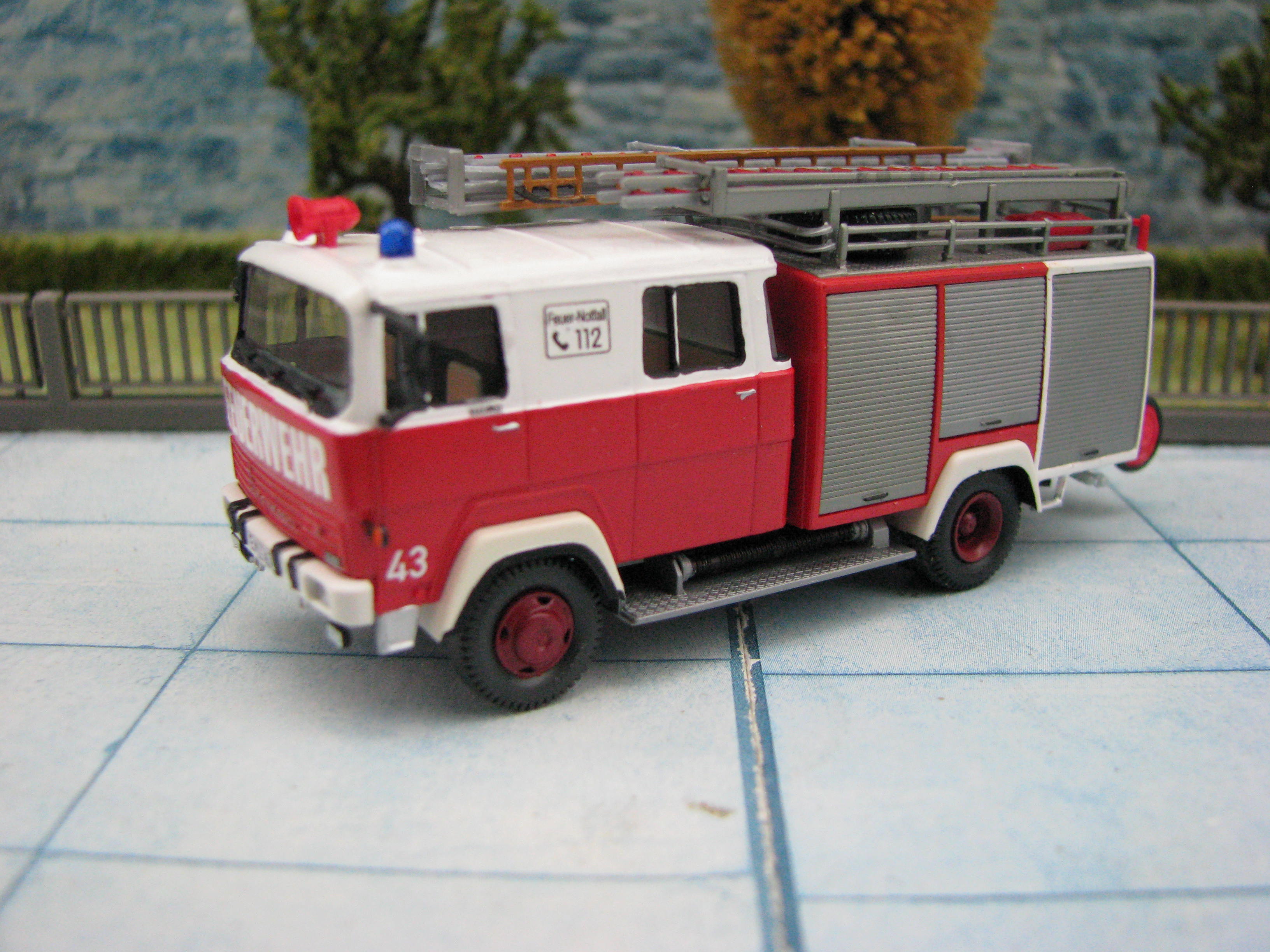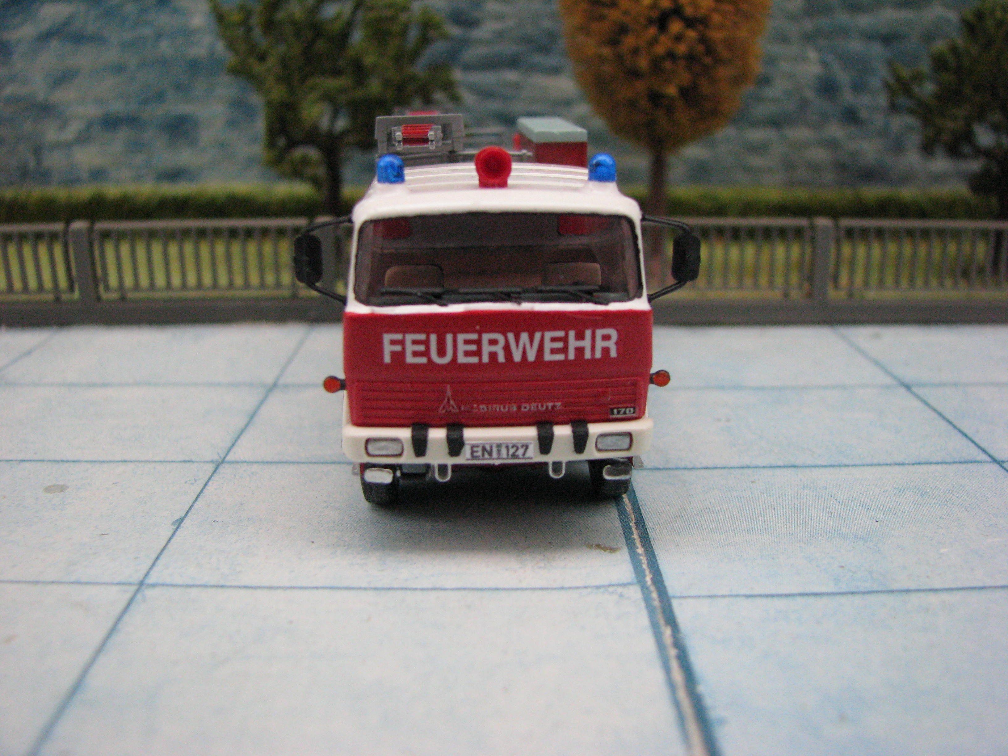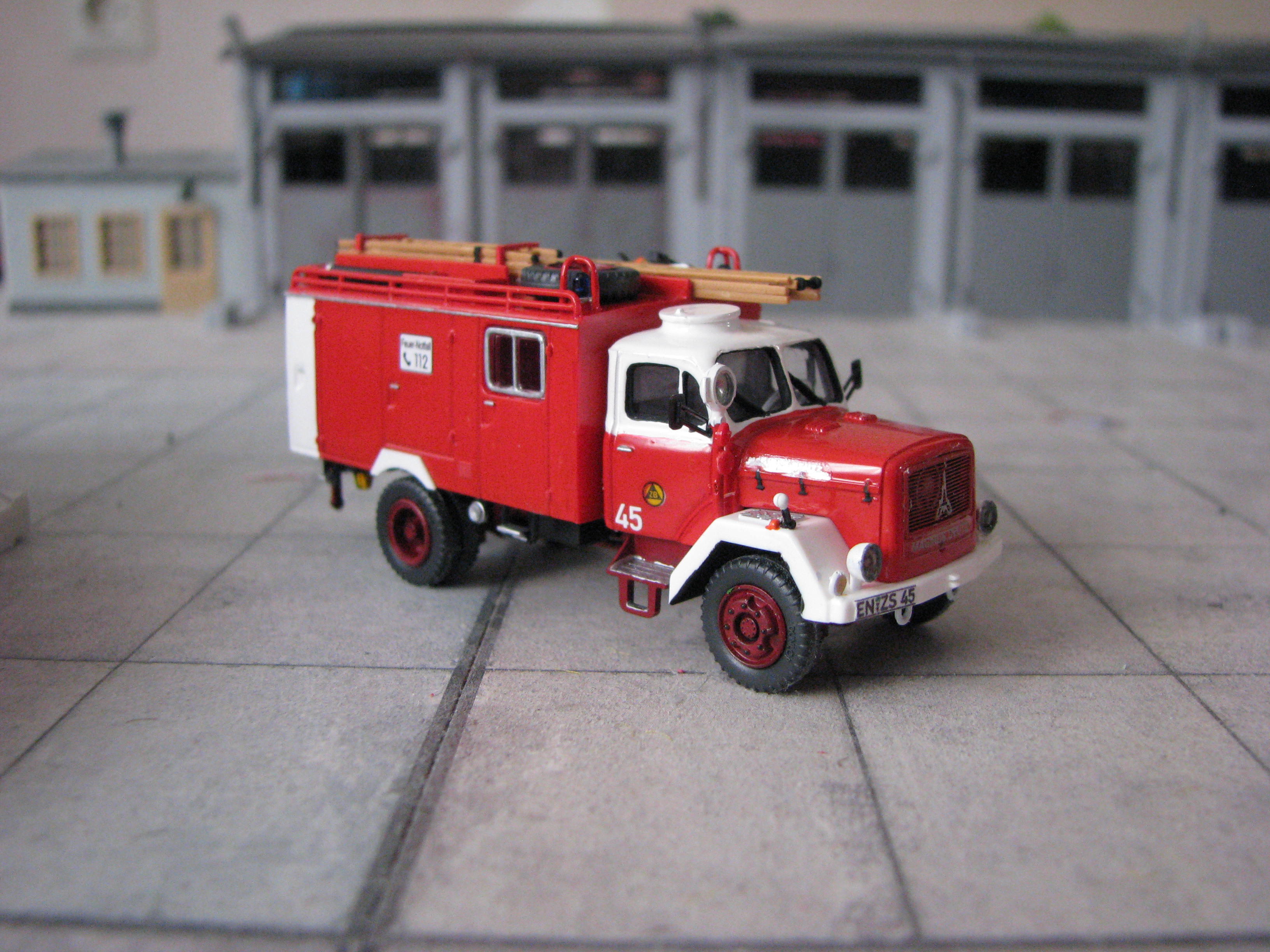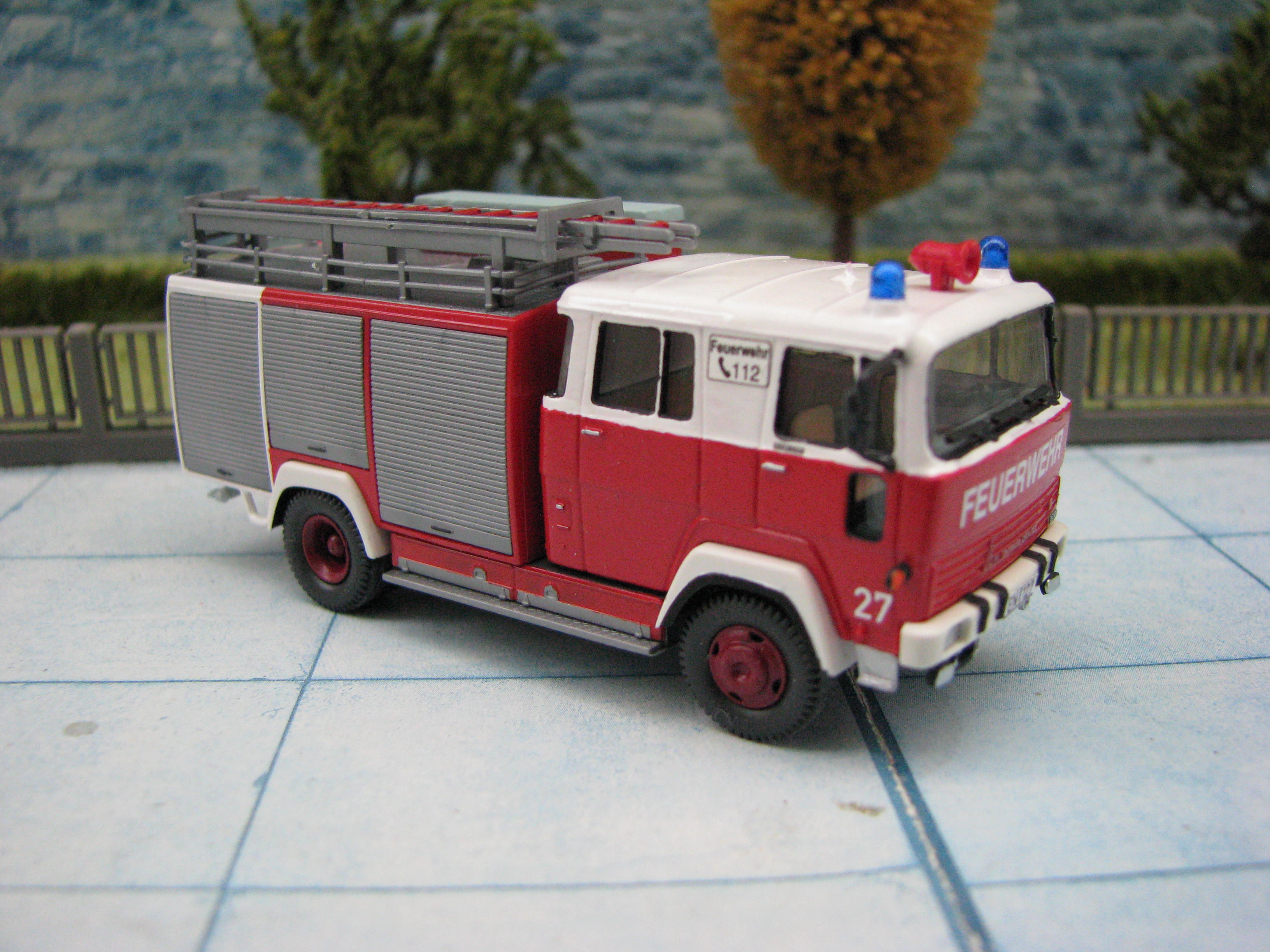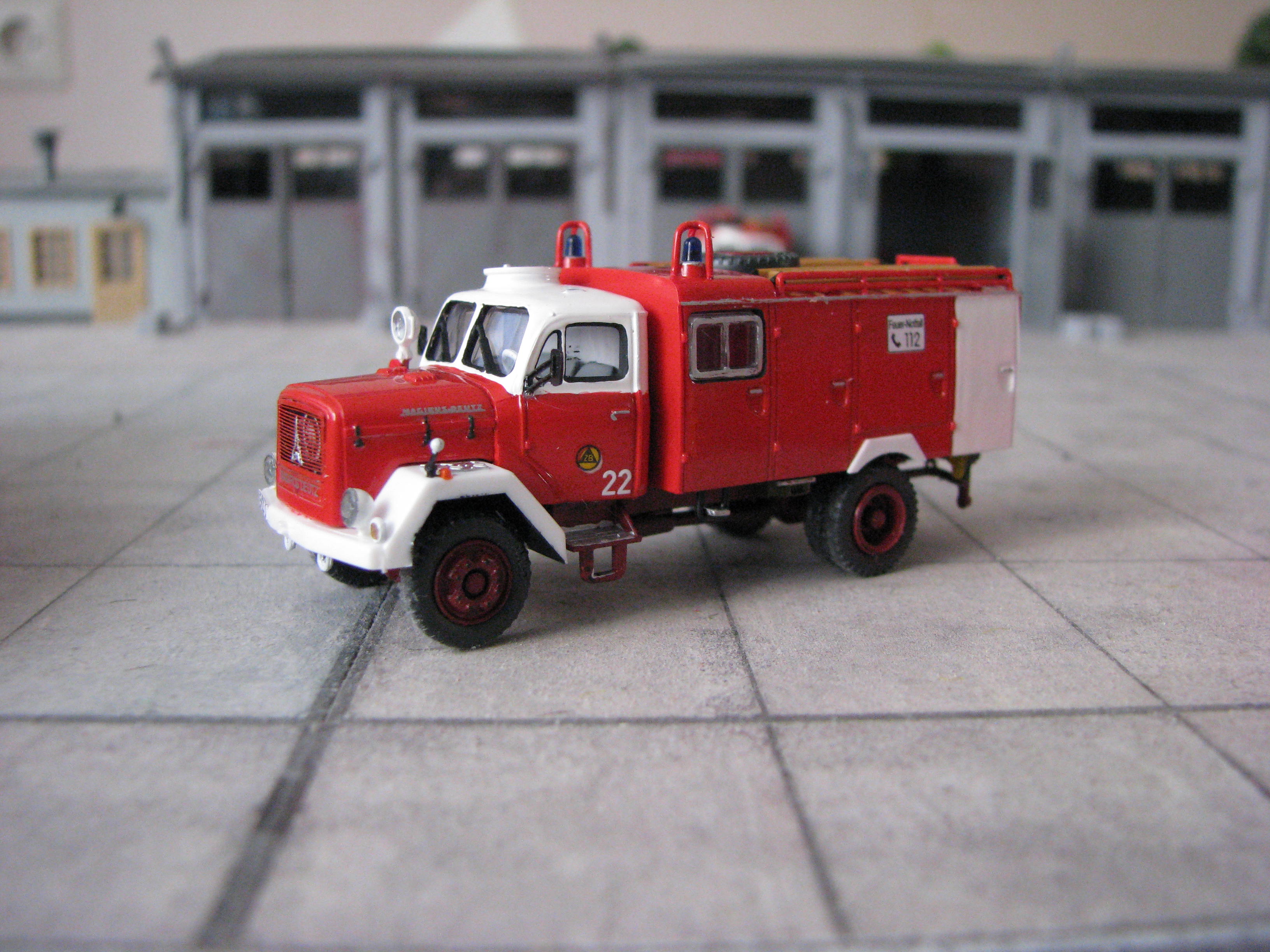 Das Rietze Modell wurde lediglich von seiner Bedruckung (Frechen) befreit und mit Decals, neuen Rückleuchten, Schlauchbrücken, Leitern, Einreißhaken sowie Sosi bestückt.