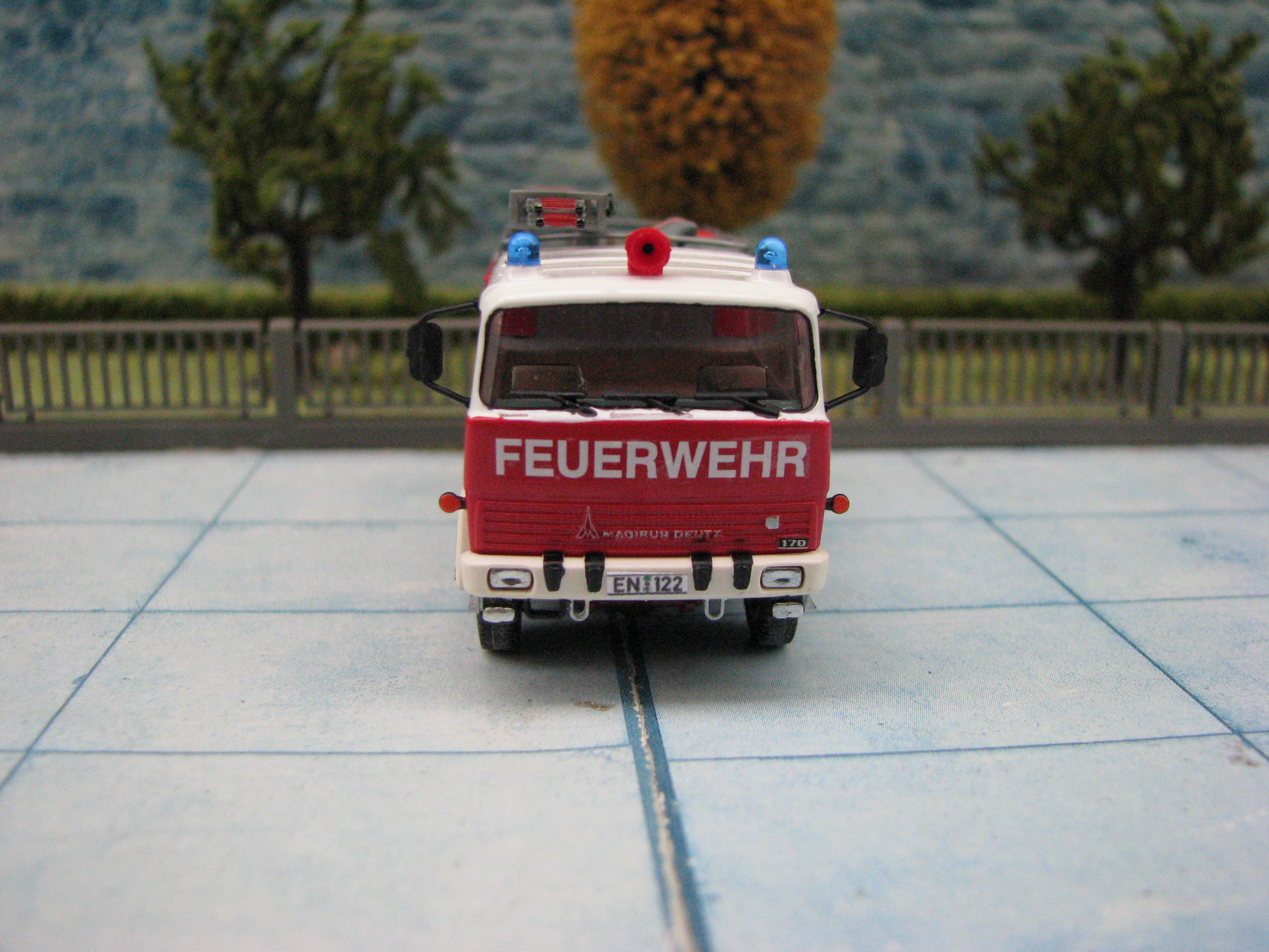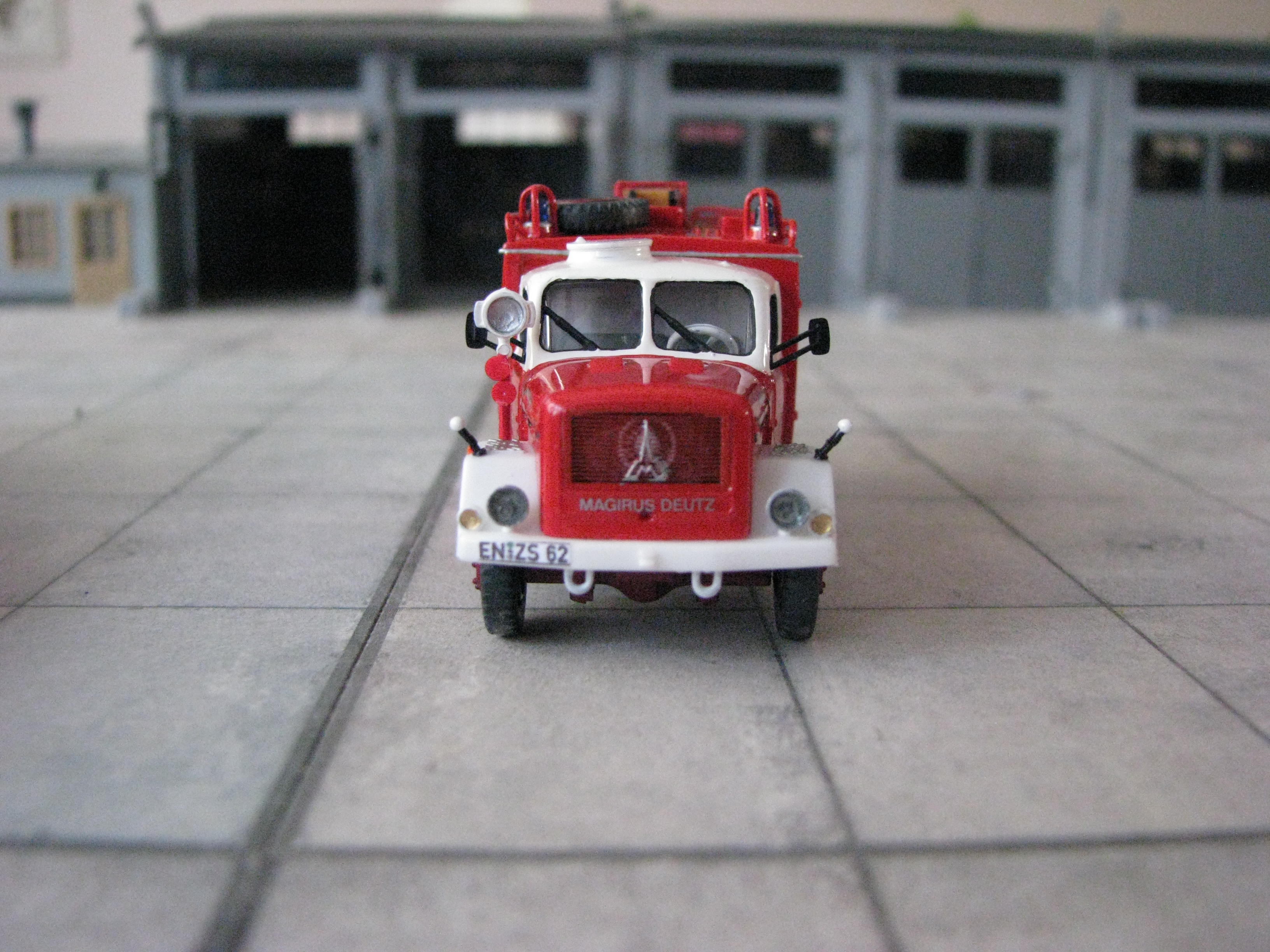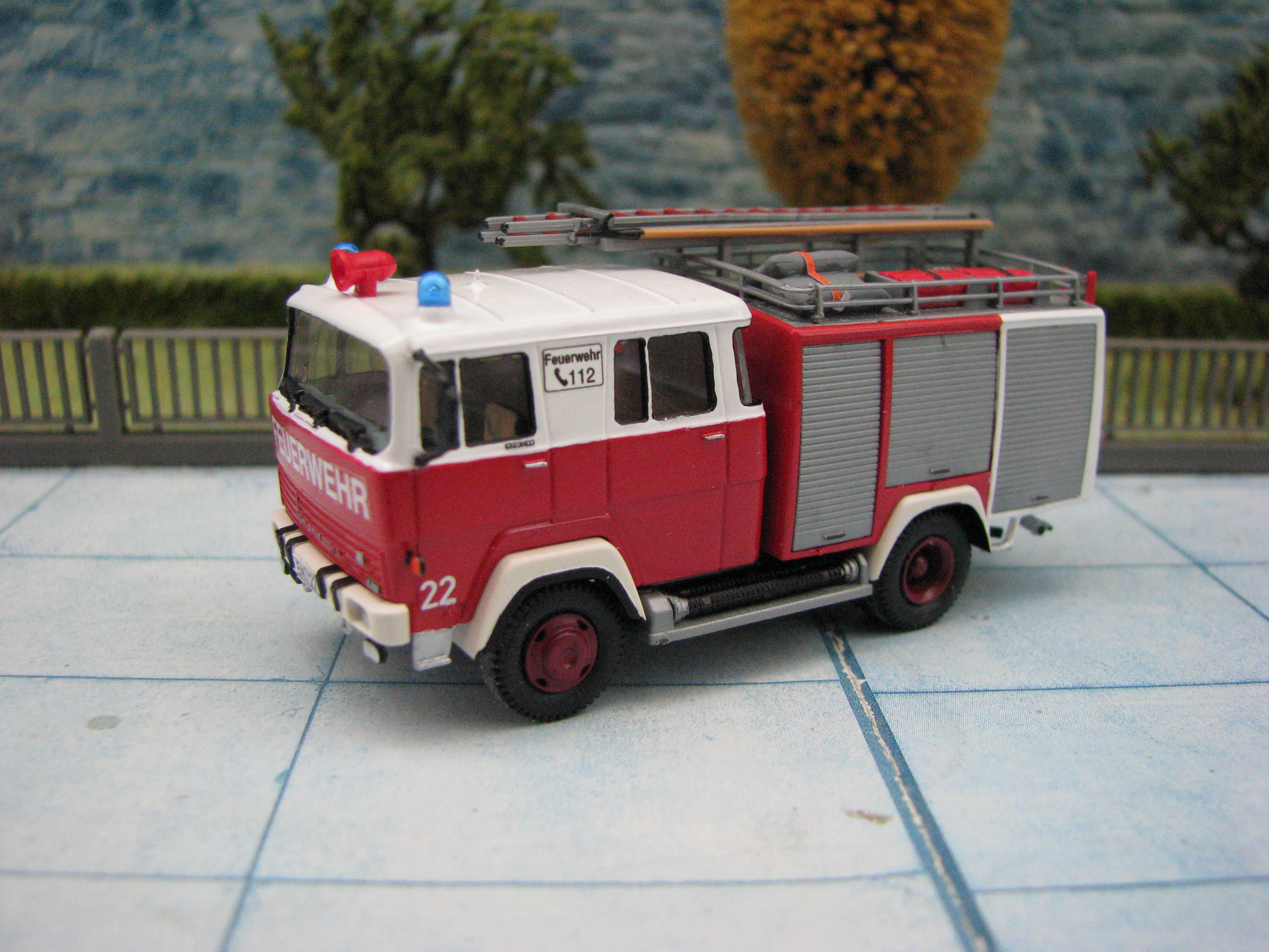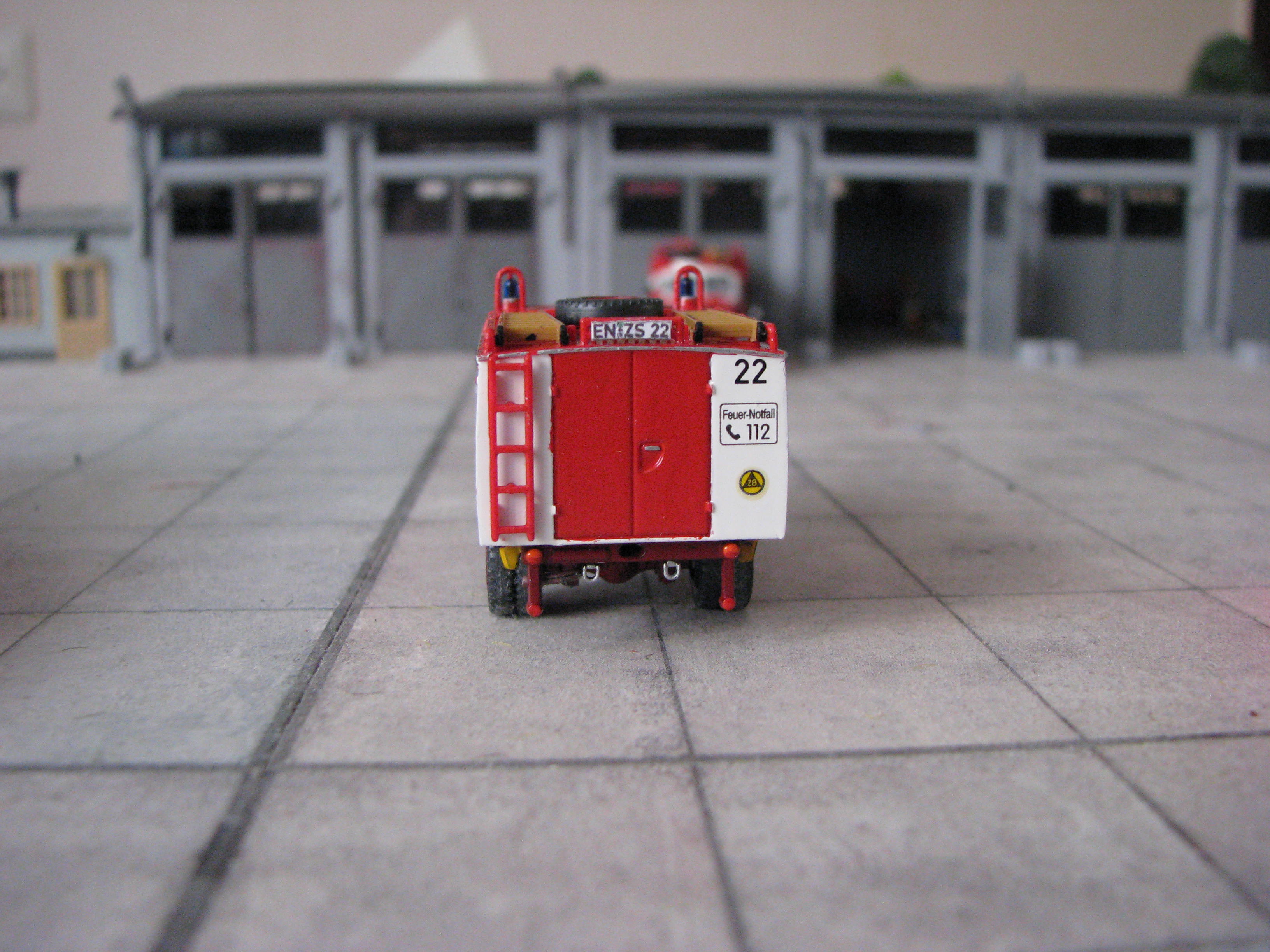 Das Rietze Modell wurde lediglich von seiner Bedruckung (Frechen) befreit und mit Decals, neuen Rückleuchten, Schlauchbrücken, Leitern, Einreißhaken sowie Sosi bestückt.