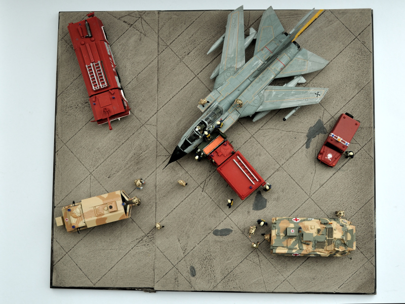 Im FW-Magazin 5/2010 gab es einen Bericht über die damalige deutsche Fliegerhorstfeuerwehr in Mazar-e-Sharif/Afghanistan, beim googlen bin ich dann noch über ein Bild gestolpert auf dem eine geübte Pilotenrettung zu sehen war. Das in Kombination ergab dann die Idee zu diesem Diorama, schließlich wird vor Ort sicher vergleichbares auch mal geübt.