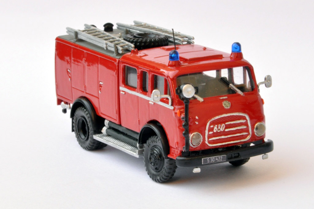 Das bekannte Roco-TLF-A 2000 Rosenbauer auf Steyr 680 wurde von mir zerlegt, in einigen Details ergänzt und danach mit dem Pinsel neu lackiert. Ebenso wurde das Fahrgestell mit einer Lenkung (Roco) versehen. Die Lackierung erfolgte in RAL 3004 (Kaminrot), danach mit Klarlack, alles mit Pinsel aufgetragen. Decals stammen von Decalprint.