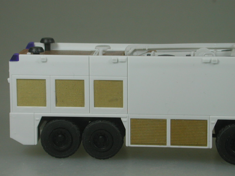 Im Grunde entspricht das TLF aus Mörfelden bis auf die Lackierung dem Frankfurter TLF 16-12. Für den Bausatz haben wir einen ganz neuen vorbildgerechten Aufbau gemacht. Vorbildgerecht ist die Aufbaukante hinten gerundet, wodurch das (neue) Geländer hinten etwas weiter nach innen rutscht. Besonders stolz bin ich auf die sehr feinen, nur 0,3 mm starken Messing-Ätzteile. Die Außenspiegel sind in der Größe der "Frankfurter Form" nachgebildet, die gegenüber den Standard-Spiegeln eine etwas größere Spiegelfläche hatten.