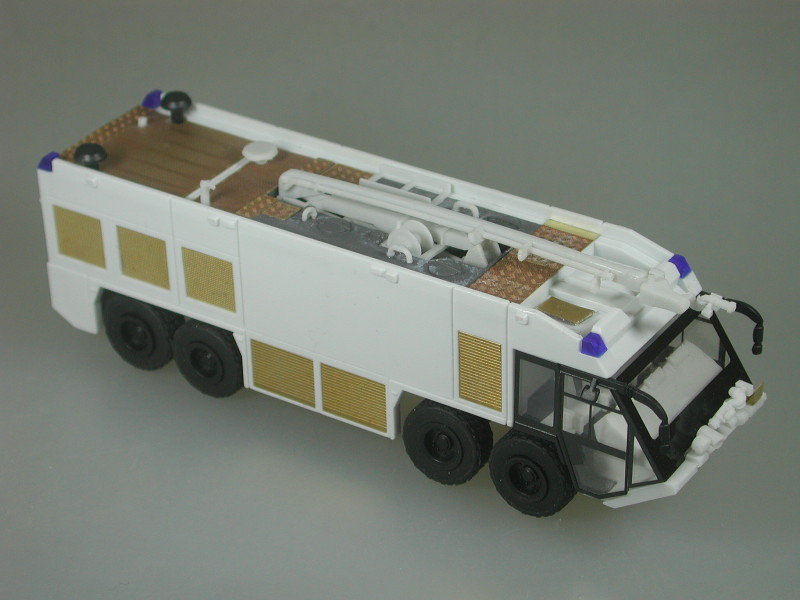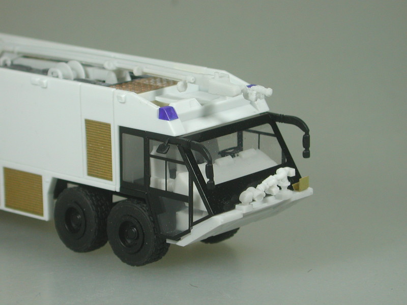 Bereits ab sofort ist das Modell des GFLF 100/12500/800-500-P nach dem Vorbild des Ziegler Z8 der Flughafenfeuerwehr Frankfurt verfügbar. Während Cursor die Karosserie, die Kabine und das Fahrgestell beisteuerte, stammt der filigrane Löscharm aus der PU-Teile-Produktion von RMM. Er kann zusammen gelegt wie auch ausgestreckt dargestellt werden. Die Inneneinrichtung wurde vorbildgerecht (Sitzanordnung, Sitzabstand und Sitzgestaltung) neu gestaltet. Dazu gehört auch ein neues Armaturenbrett. Die neue vorbildkonforme Frontschürze nimmt die neue große Frontlöschkanone und die Wärmebildkamera auf. Der besondere Gag bei diesem Modell sind die zahlreichen Ätzteile. Alle beim Original-Cursor-Modell als bedruckte Laserfolien aufgeklebte Dachteile, Rollläden und Lüftungsgitter stehen bei diesem Modell als feine Ätzteile zur Verfügung. Auch die großen Zahlen, die auf drei der Lüftungsgitter bei allen Vorbildern als Wechselschilder vorhanden sind, können vorbildgerecht in "Blech" weiß lackiert und individuell aufgeklebt werden. Die großen Reifen ohne die nur bei den Frankfurter SIMBA-Löschfahrzeugen übliche Reifendruckreguliereinrichtung lassen das Modell vorbildgerecht wuchtig wirken. Abziehbilder, die im Siebdruckverfahren hergestellt wurden, vervollständigen den Bausatz. Der Superbausatz des Z8-Frankfurt ist unter der Artikel-Nr. 05.002.052 erhältlich.