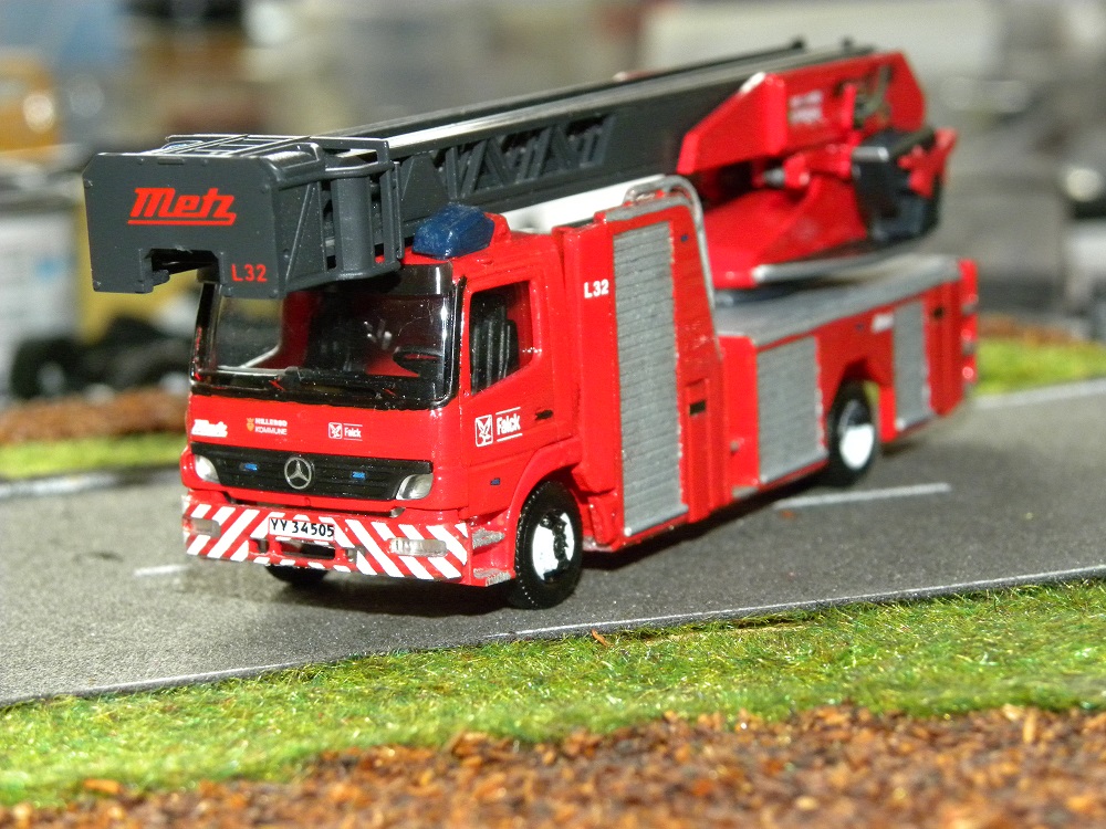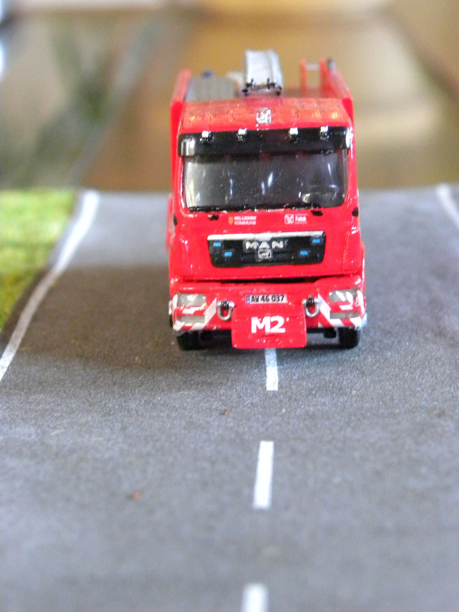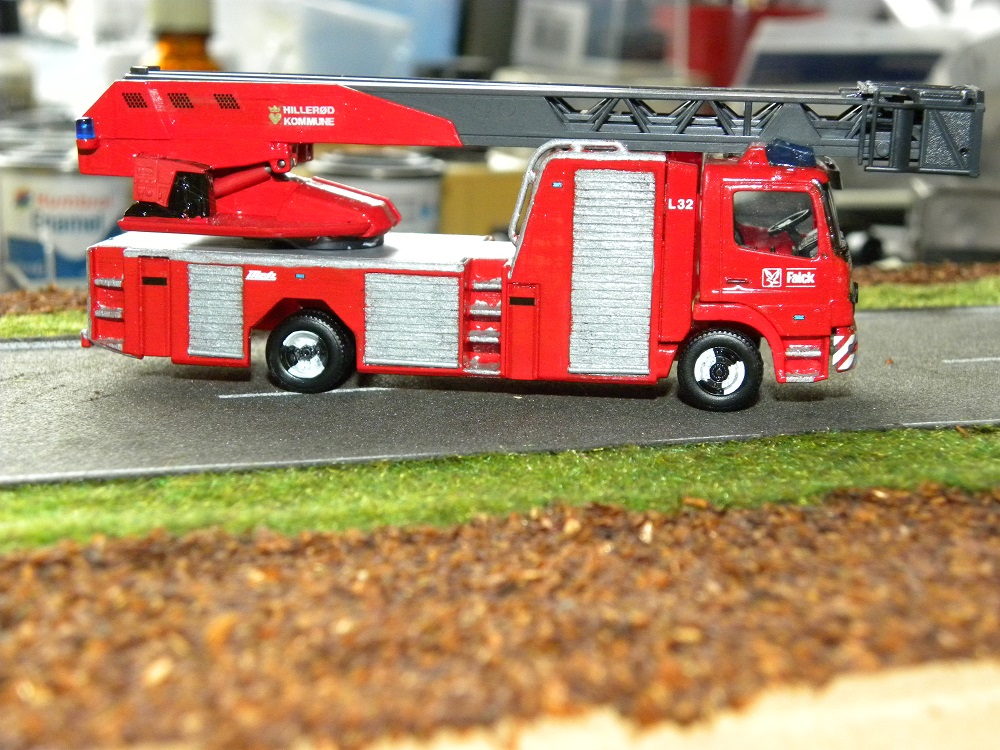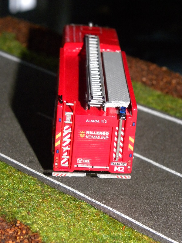 Der AT von Wiking diente als grundlage des Aufbau, nur auf dem Dach vollständig rein gemacht. Hinten habe ich den Aufbau mit Rolladen und auch mit Schlauchabgängen wie beim Original versehen. Nach dem Lakierung wurde es mit Decals versehen, und dann mit Dachbeladung ausgestattet. Der Materialkasten ist von DS-Design und der Leitersatz von Rietze. Die Aufstiegsleiter wurde mit Kabelteile abgeschlossen. Vorne wurde das Fahrerhaus mit einen Herpa Fahrerhaus ausgewechselt, und die Kotflügel einander angepasst, damit einen Strassenversion daraus werden konnte. Den Dachteil mit den Blaulichter wurde vom Wiking Modell übernommen. Auch der Aufbau wurde einen Strassenversion angepasset, d.h. der Bodenteil wurde geschliffen. Die Räder wurde dann ausgefüllt und entsprechend bemalt.