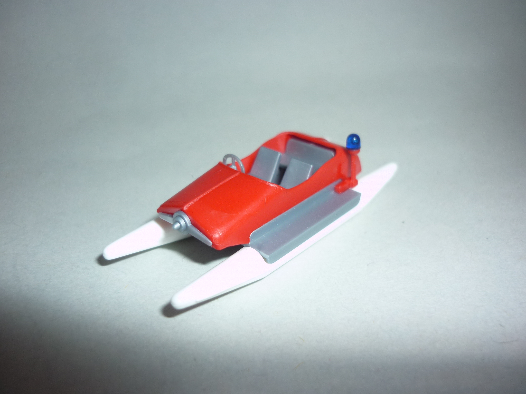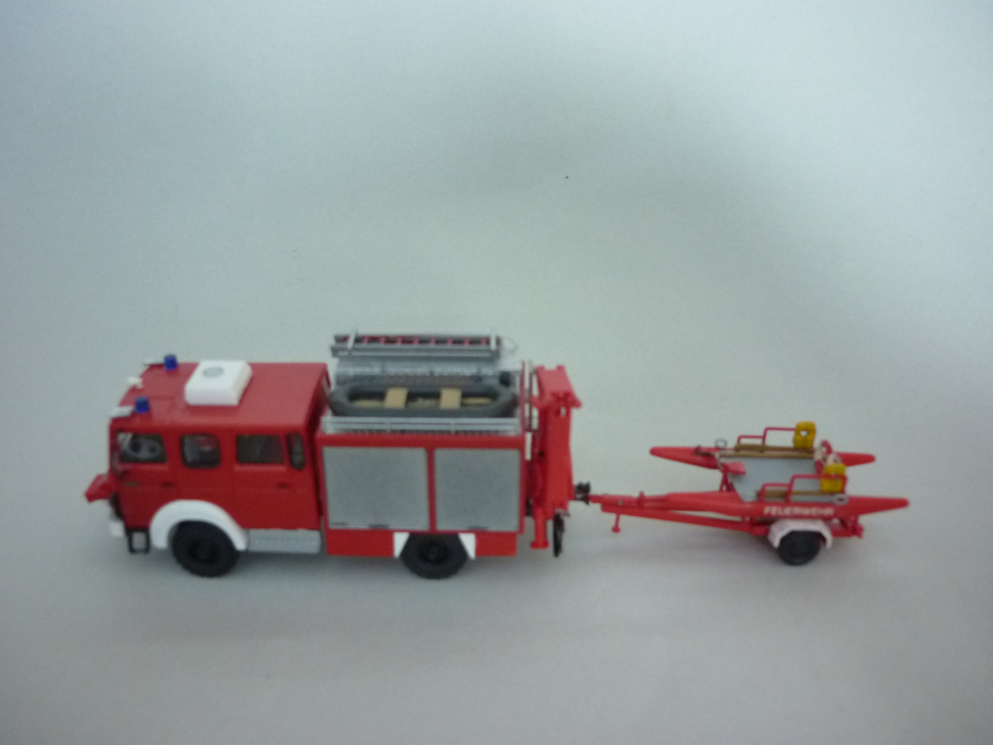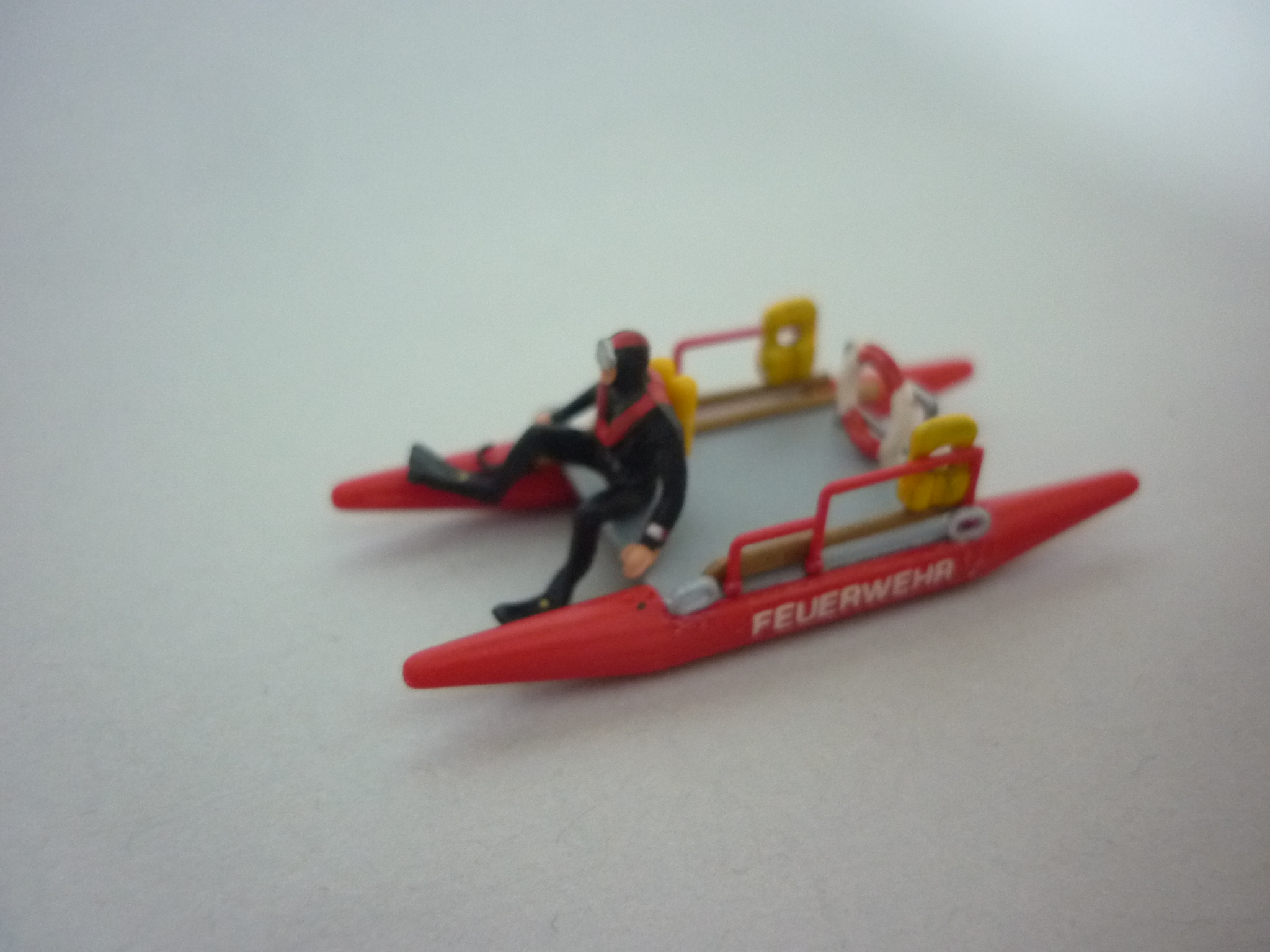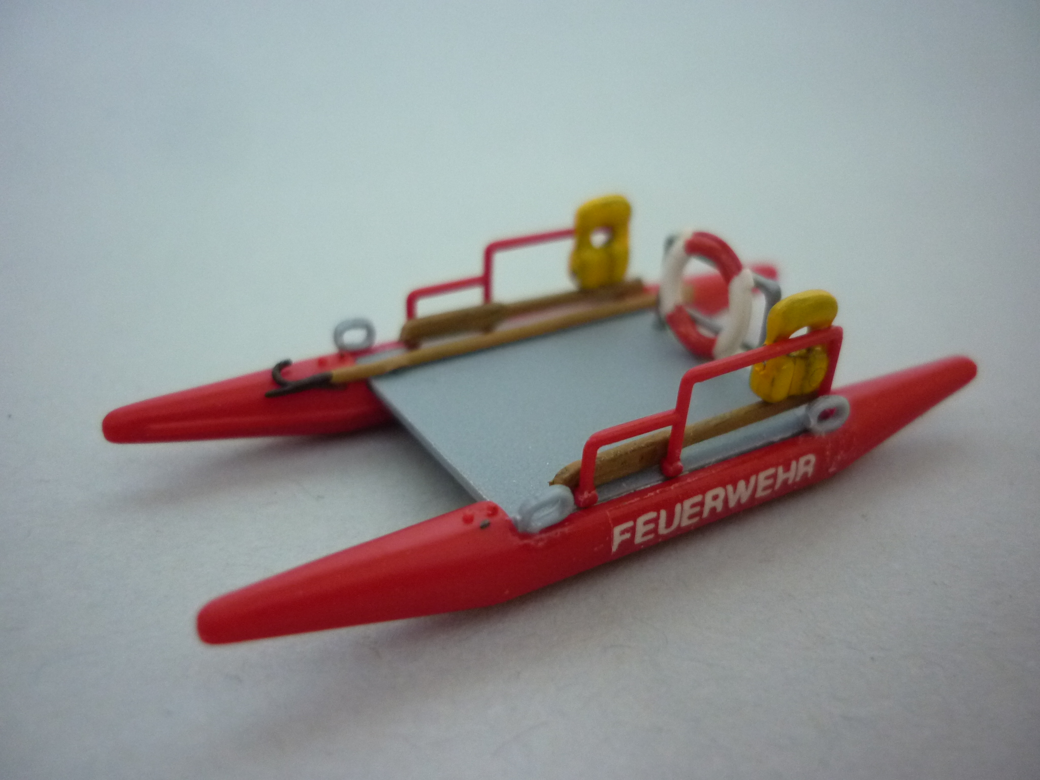 Vom eigentlichen Tretboot bleiben nur die beiden Schwimmkörper, ein Stück Roco Bastelplatte mit Struktur und die Geländer eins Roco Unimog Dreiachs TLF und schon ist das Wasser- und Eisrettungsgerät fertig.