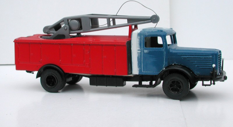 Der Umbau aus Preiser-Fahrgestell und Brekina-Heckaufbauten ist nicht auf meinem Mist gewachsen, sondern kam so aus der Bucht. Brekinas uralter, klobiger Metz-Leiterpark mußte allerdings weichen und wurde durch den der Roco-SDL ersetzt. Zur Verbesserung der Geländegängigkeit habe ich das Fahrzeug aber noch ein bißchen gekürzt. Die Peilstangen aus 0,3er Draht haben inzwischen auch weiße Kugeln am Ende erhalten, und dafür, daß das Auto beim Fototermin noch Rußspuren an der linken Seite hatte, wurde der Maschinist bereits vor den Chef zitiert