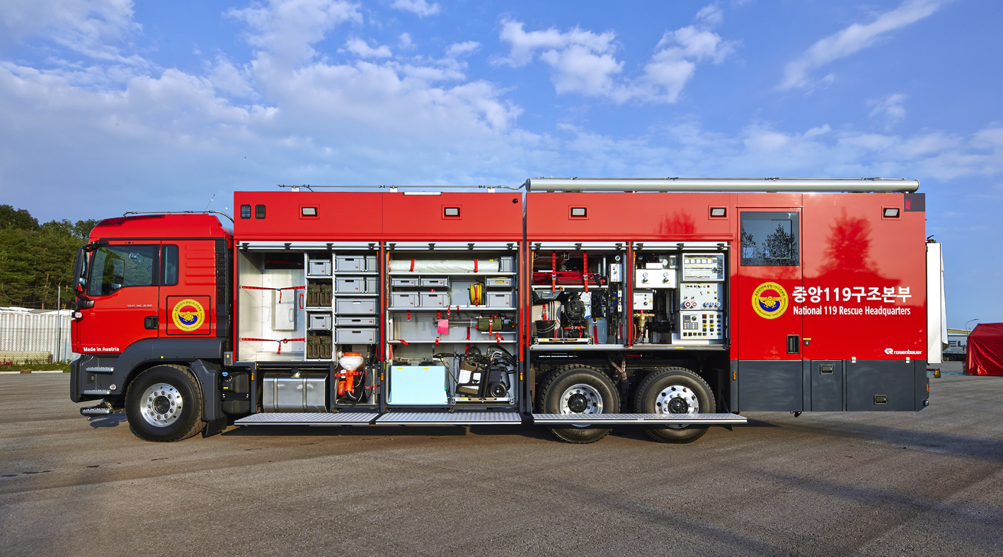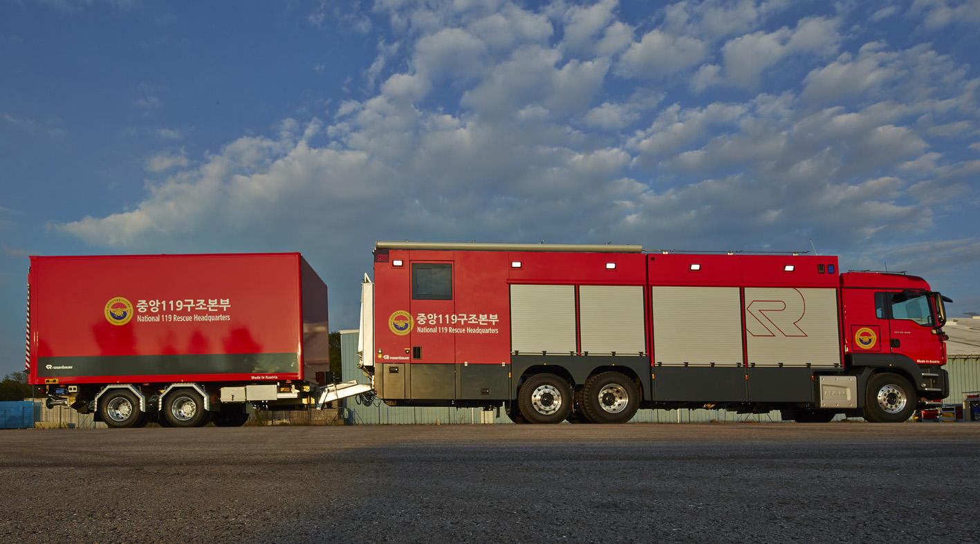 19 Meter lang ist das Gespann, das Rosenbauer in dreifacher Ausführung für das National 119 Rescue Headquarter in Südkorea gebaut hat. Es besteht aus einem dreiachsigen Fahrzeug mit Löschtechnik und Dekon-Einheit sowie einem zweiachsigen Anhänger mit weiterer Dekon-Ausrüstung. Das Fahrzeug ist ausgelegt, um in kürzester Zeit mit wenig Personalaufwand eine Dekontaminationsmöglichkeit für kleine und mittlere Anwendungen darzustellen. Die auf Rollcontainern im Anhänger transportierte Ausrüstung ermöglicht die Installation eines Massendekontaminationsplatzes für Großschadensereignisse. Beide Anwendungen decken den gesamten Reinigungsprozess von Grob- und Feindekontamination bis zur Nachbehandlung ab. Ausrüstung zur Reinigung von Menschen, Geräten und Fahrzeugen, welche gefährlichen Stoffen ausgesetzt waren, ist inkludiert.
