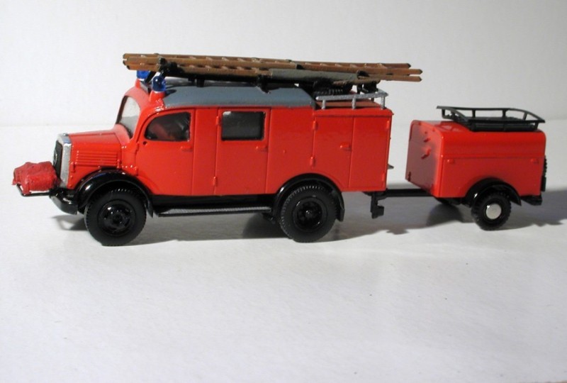 Für einen Freund baue ich gerade an einem Löschzug für seine Modellbahnanlage "Sackbachweiler". Der Ort liegt im Schwäbischen und hat ca. 40.000 Einwohner; gebaut wird der Löschzug, bestehend aus KdoW nicht mehr wie ursprünglich geplant '58 VW Typ 1, sondern '47 Mercedes 170 V, LF 8 '43 Mercedes L 1500 S, TLF 15 '54 Mercedes L 3500 und dem Prunkstück, DL 26 '36 Mercedes Lo 3000.
