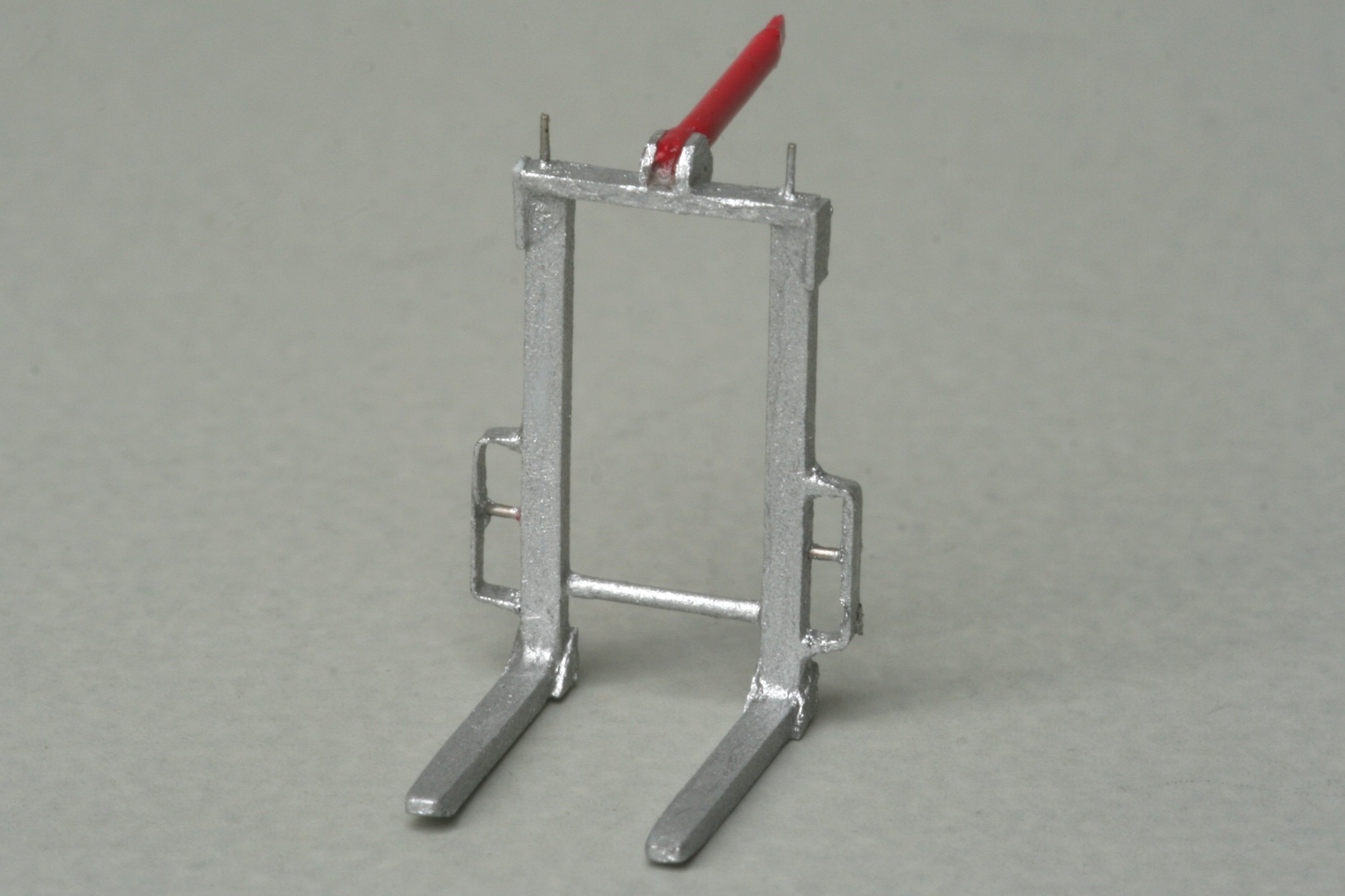 ich habe noch mal etwas um das LUF herum gebaut. In Hannover gibt es als Zubehör zum LUF 60 u. a. eine Hubgabel, die in zwei Aufnahmen an der vorderen Stoßstange eingehängt wird und deren Neigung mittels eines Hydraulikzylinders verstellt werden kann: Vorbild. Diese Gabel habe ich aus evergreen-Profilen angefertigt. Sie kann wie beim Original in die von Anfang an mit gebauten Aufnahmen eingehängt, aber auch jederzeit wieder abgenommen werden. Der Hydraulikzylinder fasst mit seinem Ende klemmend in eine Befestigung, so dass die Gabel in ihrer Position bleibt. Die Hydraulikschläuche dazu habe ich mir geschenkt, obwohl die beiden Kupplungen dafür vorne links am Modell verwirklicht sind. Aber mit den Schläuchen hätte ich die Gabel nicht abnehmbar bauen können, weil funktionierende Kupplungen im Maßstab H0 wohl doch nicht möglich sind :wink: .