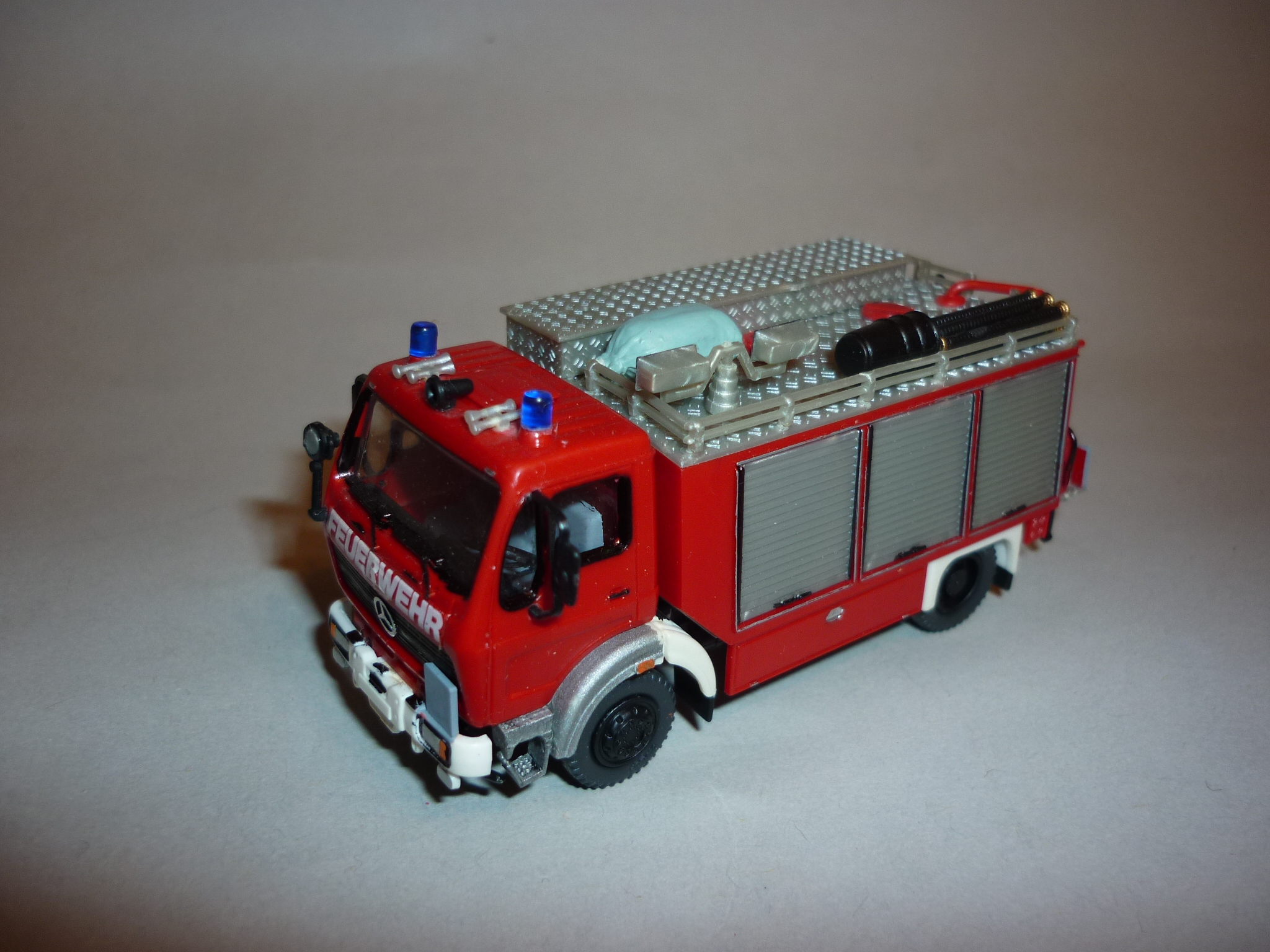 -Aufbau vom RW-Kran, vorne gekürzt und mit einem Kunststoff-Sheet verschlossen, Klappen von Merlau eingepasst, Dachkästen und Lattenroste vom Magirus RW-Öl, Tankkuppe vom AB-Saug