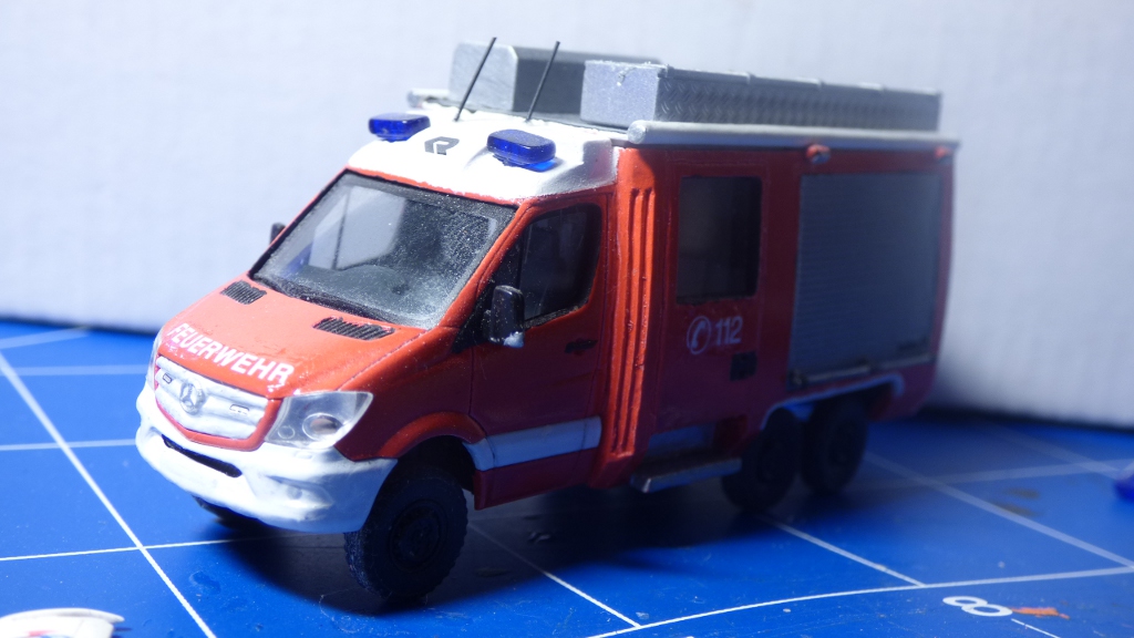 So nach dem die FW Nordstadt ihren 6x6- Sprinter bekommen hat, steht auch bei mir die Fertigung des Oberaigner Sprinter angelaufen. Basis ist ein Sprinter 2013 desen Fahrgestell eigentlich einem 2006er DoKa gehörte. Die Karosserie oberhalb der Stossleisten stammt vom 2013er Flachdachkasten. Das Fg wurde ein kleines Stück verlängert und weisst den kurzen Radstand auf. Dachaufsatz und Aufbau sind mittels Scratch-Bau entstanden, ebenso die bewegliche Hinterachse. Vorbild ist dieses Fahrzeug, allerdings leicht verändert.