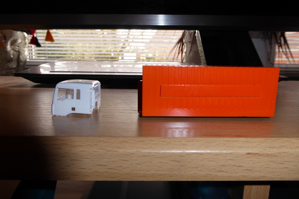 Wer kann hier aus dem Forum weiterhelfen. Die Kabine ist ein MAN ??? (Herpa, ohne Sonnenblende und Windleitblech), beim Container bin ich mir nicht sicher. Er ist größer als ein 20ft Container (ca 10mm länger als die von Herpa), aber auch kein 30er ?? Leider gibt es zum Letztgenannten keine Info zum Hersteller. Habe ihn mal auf einer Börse als Beigabe ergattert. Der Plastikstreifen wurde nachträglich angebracht, ebenso der Rahmen mit Hakenaufnahme (MAAG)