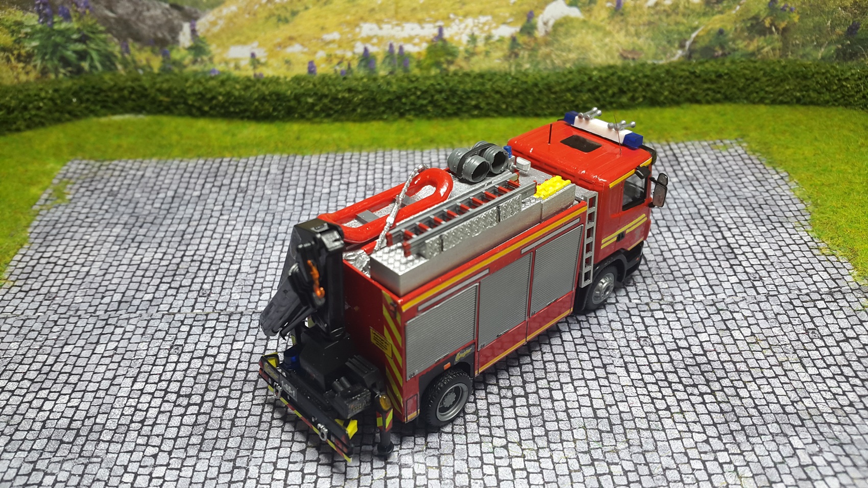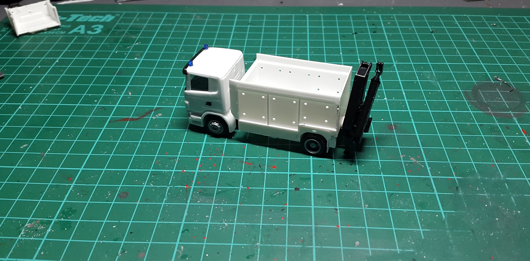 Die Blaulichtausnahmen am Dach des Fahrerhauses wurden Abgeschliffen. Aufbau und Fahrerhaus wurden mit Humbrol 19 Lackiert (Pinsel). Dachbeladung aus diversen Kleinteilen. Dachaufstieg aus einer Leiter von Roco. Dachverlängerung aus PS-Platte 0,5mm. Blaulichtbalken von DS-Design. Presser von Herpa. Seilwinde (DS-Design)
