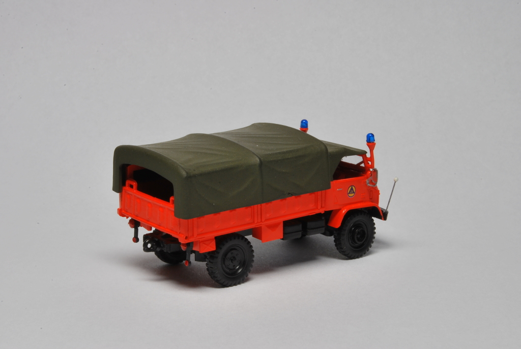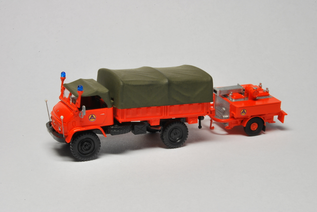 Doch nun zum Gespann: Das Zugfahrzeug vom Typ Unimog S 404 stammt von Roco und zieht einen Feldkochherd der Firma Progress-Werke aus Beständen des LSHD (Arsenal M). Alles schön in orange lackiert und mit kleineren Details aufgehübscht.