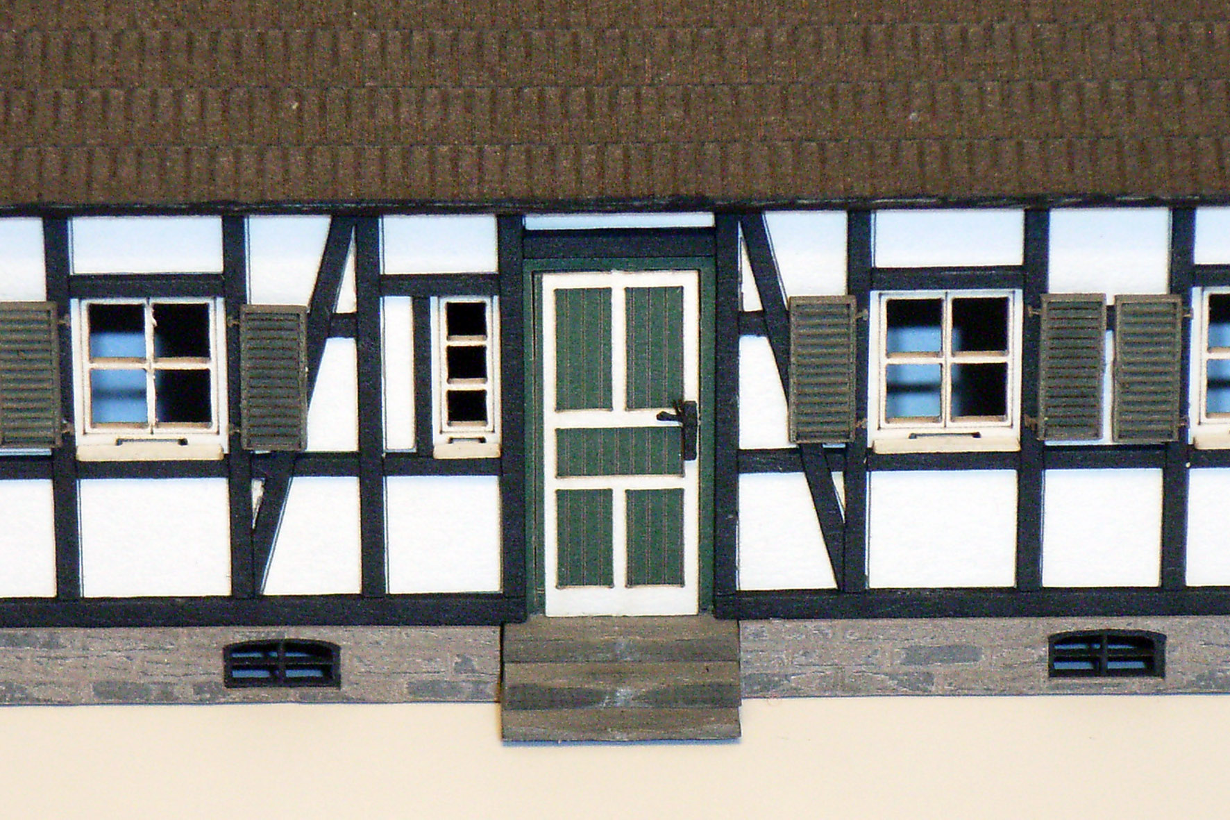 Die auf dem linken Bild neben der Eingangstür fehlenden Fensterläden sind pure Absicht: Hier wird später der Anbau mit den Nebenräumen des Museumscafés platziert - und ich konnte mit den so eingesparten Läden die defekten Exemplare ersetzen. :idea: