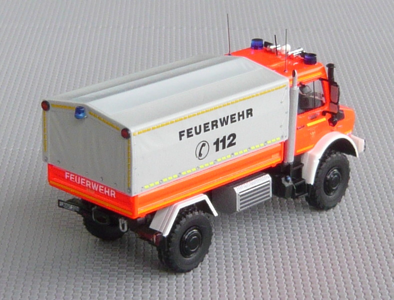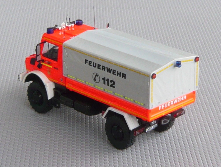 Der auf der Feuerwache 11 stationierte Unimog wurde primär für die Aufgaben des dortigen Kompetenzzentrums Hochwasserschutz beschafft. Die Watfähigkeit beträgt 1200 mm. Gleichwohl dient er für Transportaufgaben im Katastrophenschutz und wurde daher in einer schlichten und sachlichen Ausführung beschafft.