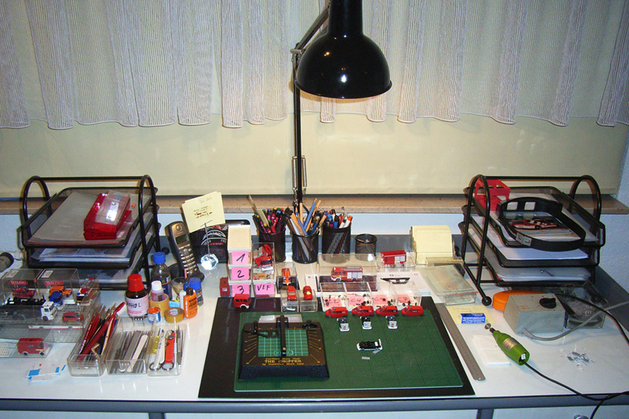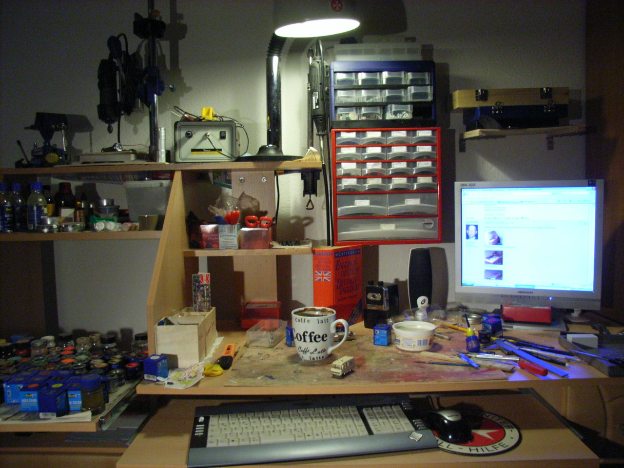 Ich arbeite eigentlich auch überwiegend am Schreibtisch. "Grobe" Sachen wie Sägen, Bohren, etc. werden im Hobbykeller erledigt. Lackiert wird draussen.