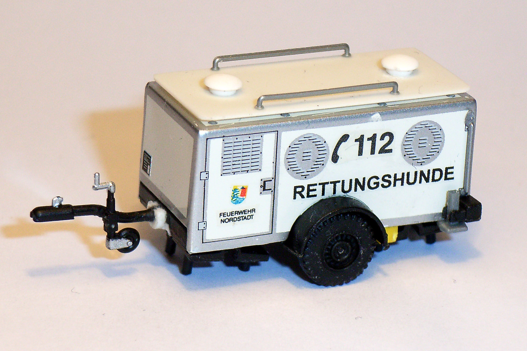 Als kleine Zugabe ist mir dann noch völlig überraschend der Transportanhänger der Rettungshundestaffel auf den Basteltisch gerollt. :wink: Dargestellt werden soll ein Anhänger der Fa. WT-Metall GmbH aus dem Jahr 1996. Und obwohl ich aufgedruckte Details eigentlich ablehne, muss ich im Falle des VK-Modells sagen dass es ganz nett anzusehen ist. Mit ein paar Verfeinerungen/Veränderungen wirkt es gar nicht mehr spielzeughaft: