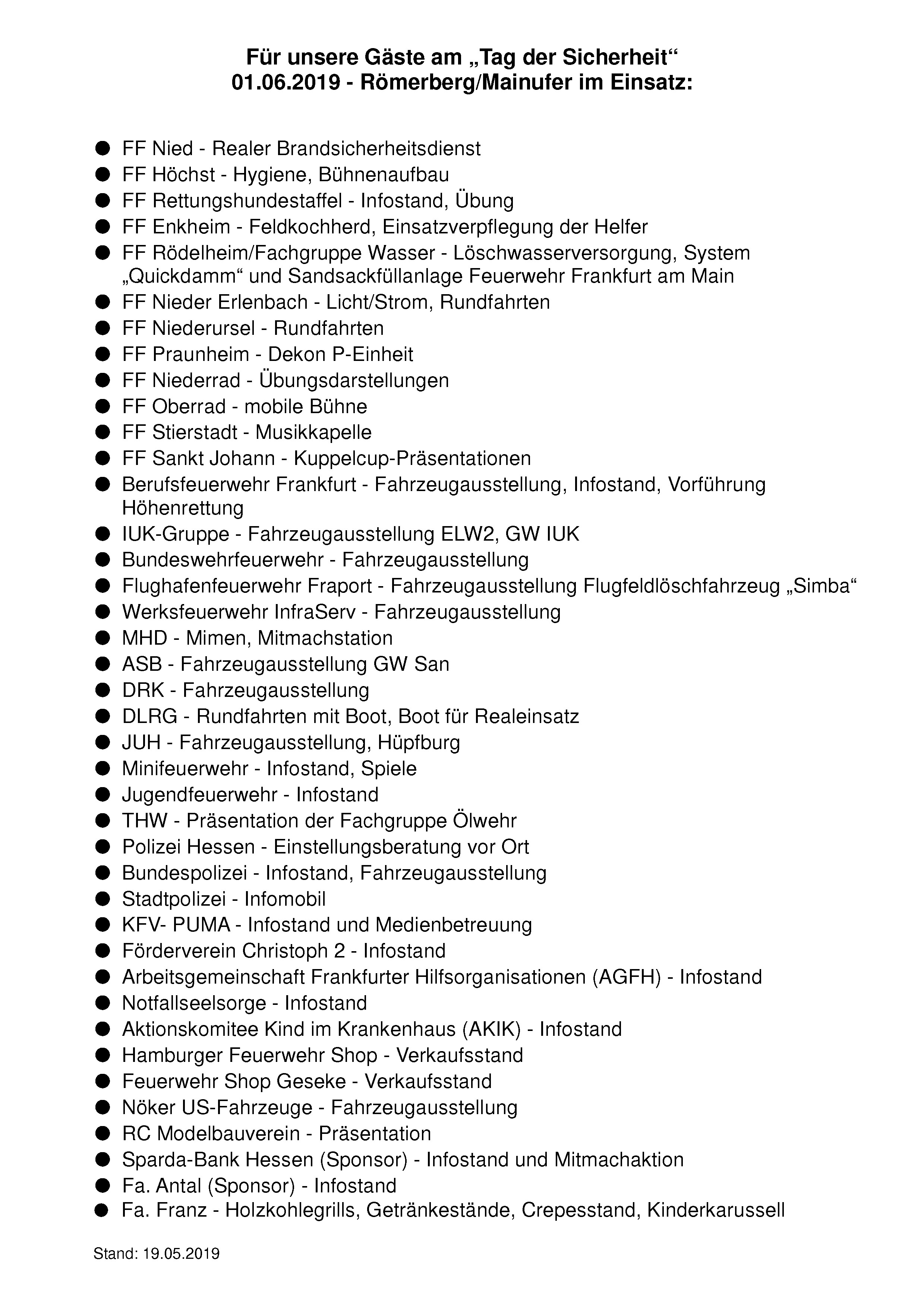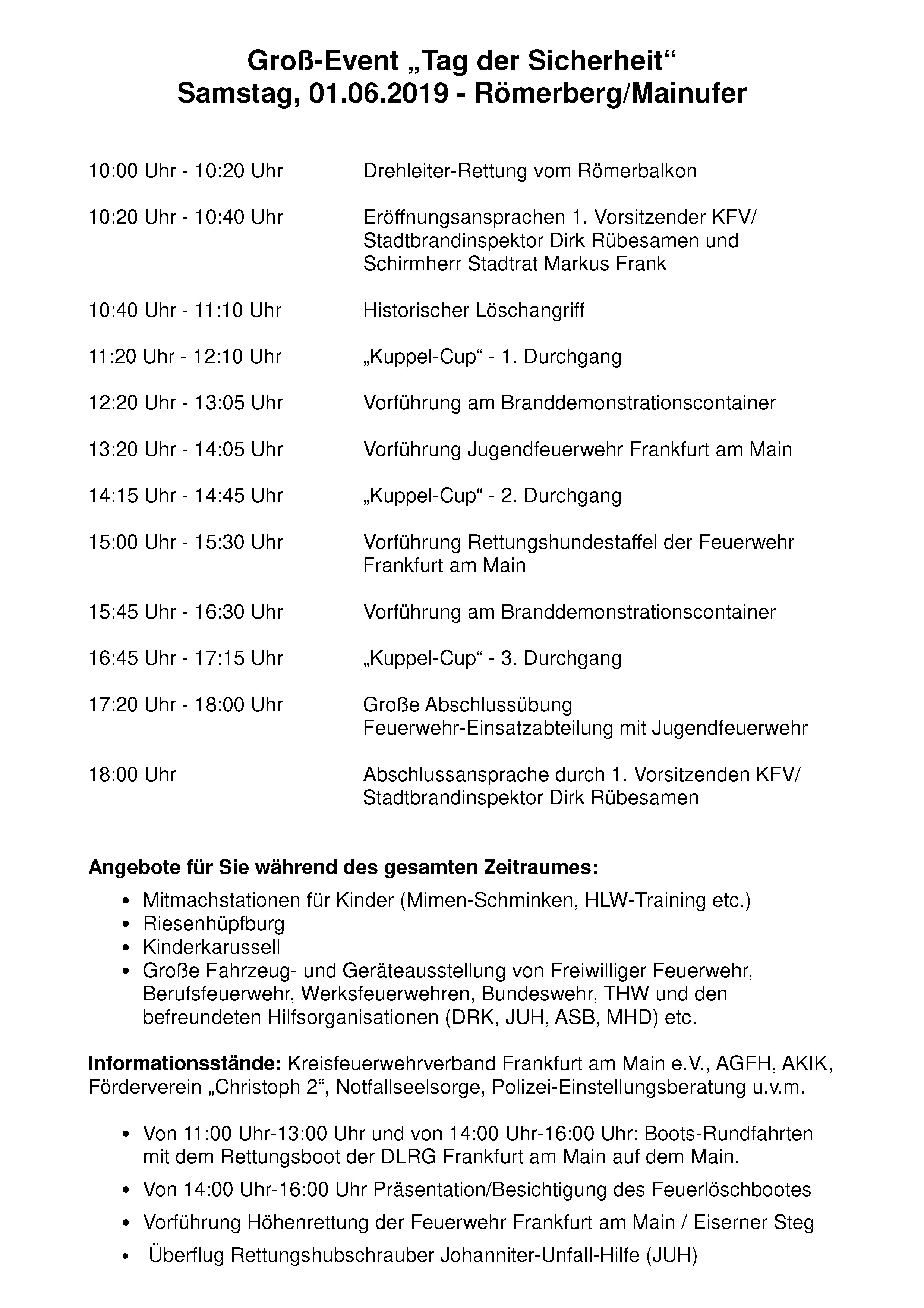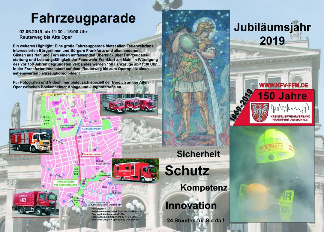 Anlässlich dieses Jubiläums findet zahlreiche Veranstaltungen statt, unter anderem am 2. Juni 2019 eine große Fahrzeugparade durch die Frankfurter Innenstadt!KFV hat geschrieben:Der Kreisfeuerwehrverband Frankfurt am Main ist der Zusammenschluß der Feuerwehren der Europastadt Frankfurt und zählt derzeit über 2000 Mitglieder. [...] Mitglieder des Verbandes sind derzeit die 28 Freiwilligen Feuerwehren bzw. Feuerwehrvereine, deren 28 Einsatzabteilungen, die Berufsfeuerwehr Frankfurt am Main, die Stadtjugendfeuerwehr, die Stadtminifeuerwehr, die Alters- und Ehrenabteilung sowie die Musikabteilung und die Ehrenmitglieder. Zudem eine Betriebsfeuerwehr und zwei ehemalige Freiwillige Feuerwehren sowie seit dem 15.03.2008 die Frankfurter Rettungshundestaffel.