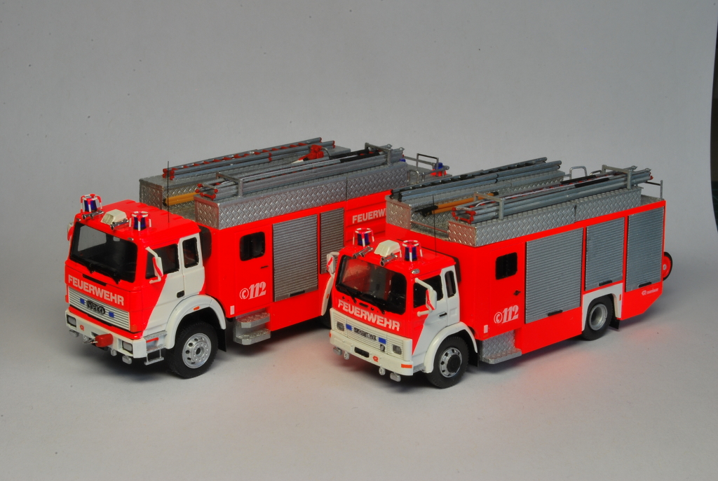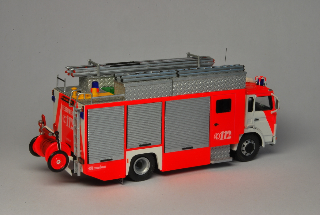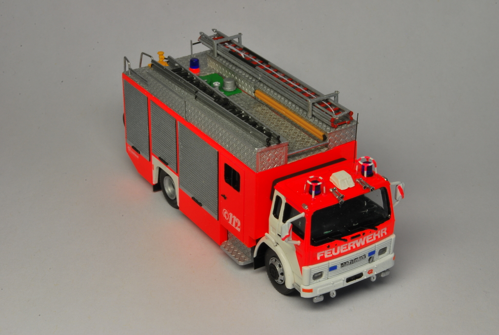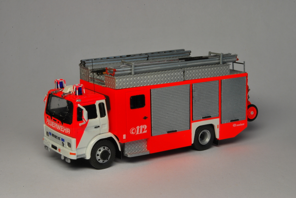 Auch bei diesem Aufbau handelt es sich um einen Fräßteile-Bausatz von TBM. Die Kabine stammt - genauso wie die Räder - von Roco. Das Fahrgestell dürfte von einem alten Roskopf Modell (MB LN2 / Ziegler GW-G2) sein. Komplettiert wurde das HLF 16 unter anderem mit folgenden Teilen: