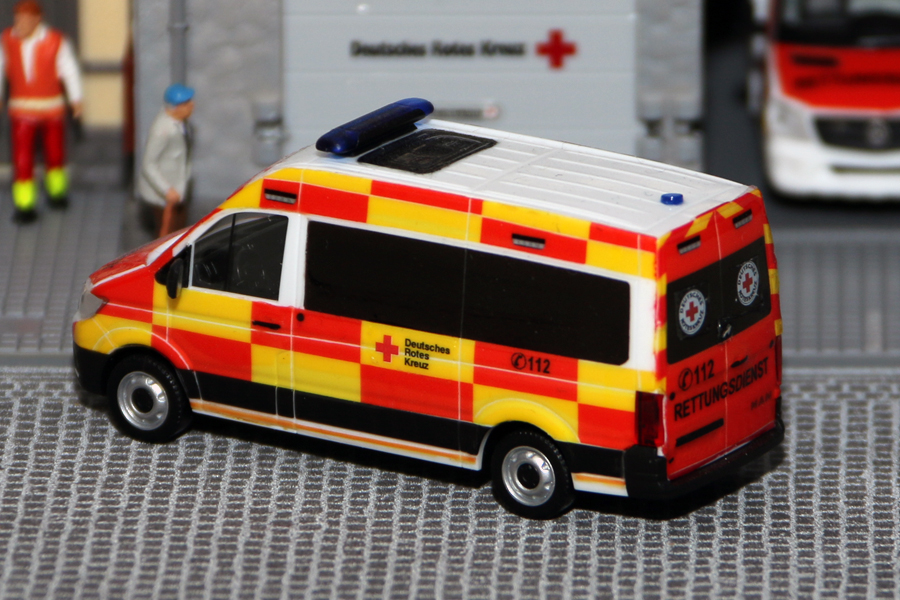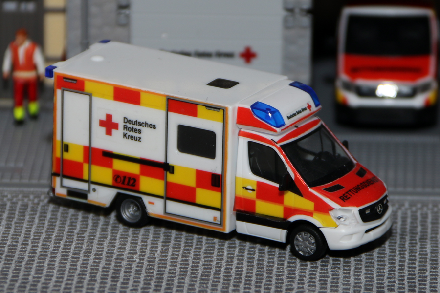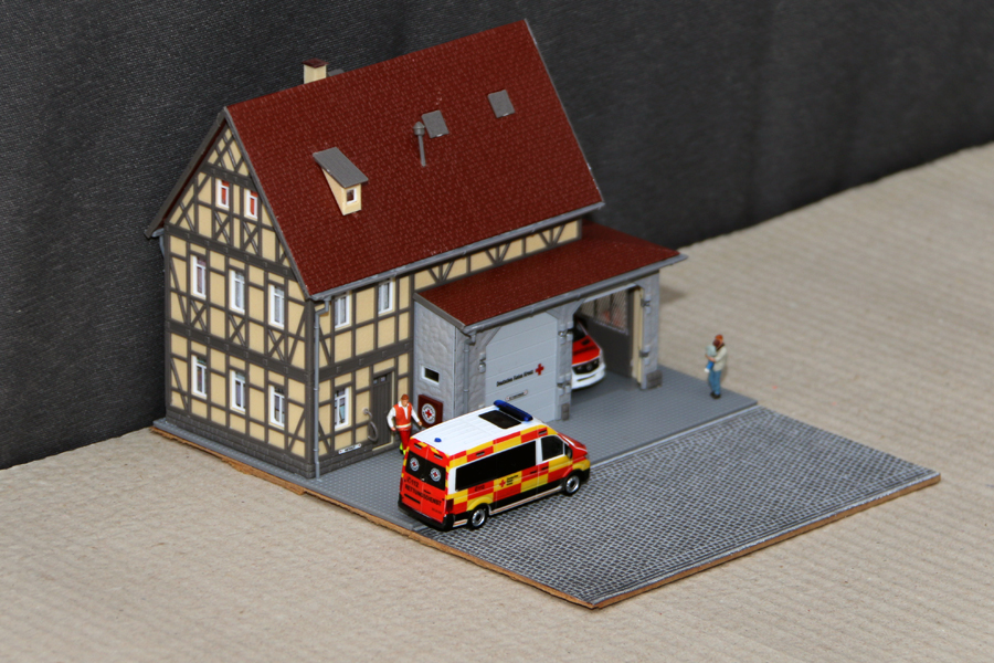 Die Rettungswache wird durch das DRK betrieben und von dort werden ein RTW sowie ein KTW eingesetzt. Die Fahrzeuge stammen von Herpa aus der Mini-Kit Serie und wurden mit Decals von Ralf Wiesner versehen.