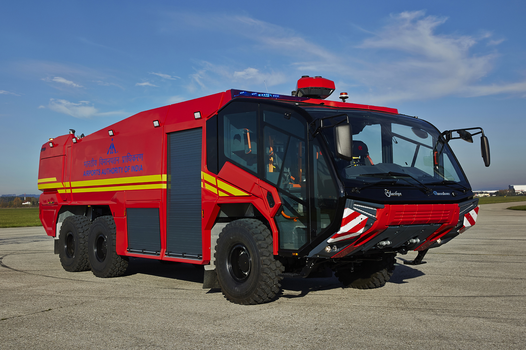 Höchstgeschwindigkeit von 120 km/h verleiht. Über ein 8-Gang-Automatikgetriebe lässt sich das 36,6 t schwere Einsatzgerät zügig durchschalten und unter 30 Sekunden von 0 auf 80 km/h beschleunigen. Mit diesem Vortrieb erreicht der PANTHER auch den entferntesten Punkt der Landebahn in Tampere in der von der ICAO, der internationalen Zivilluftfahrtorganisation, vorgeschriebenen Zeit, nämlich unter drei Minuten.