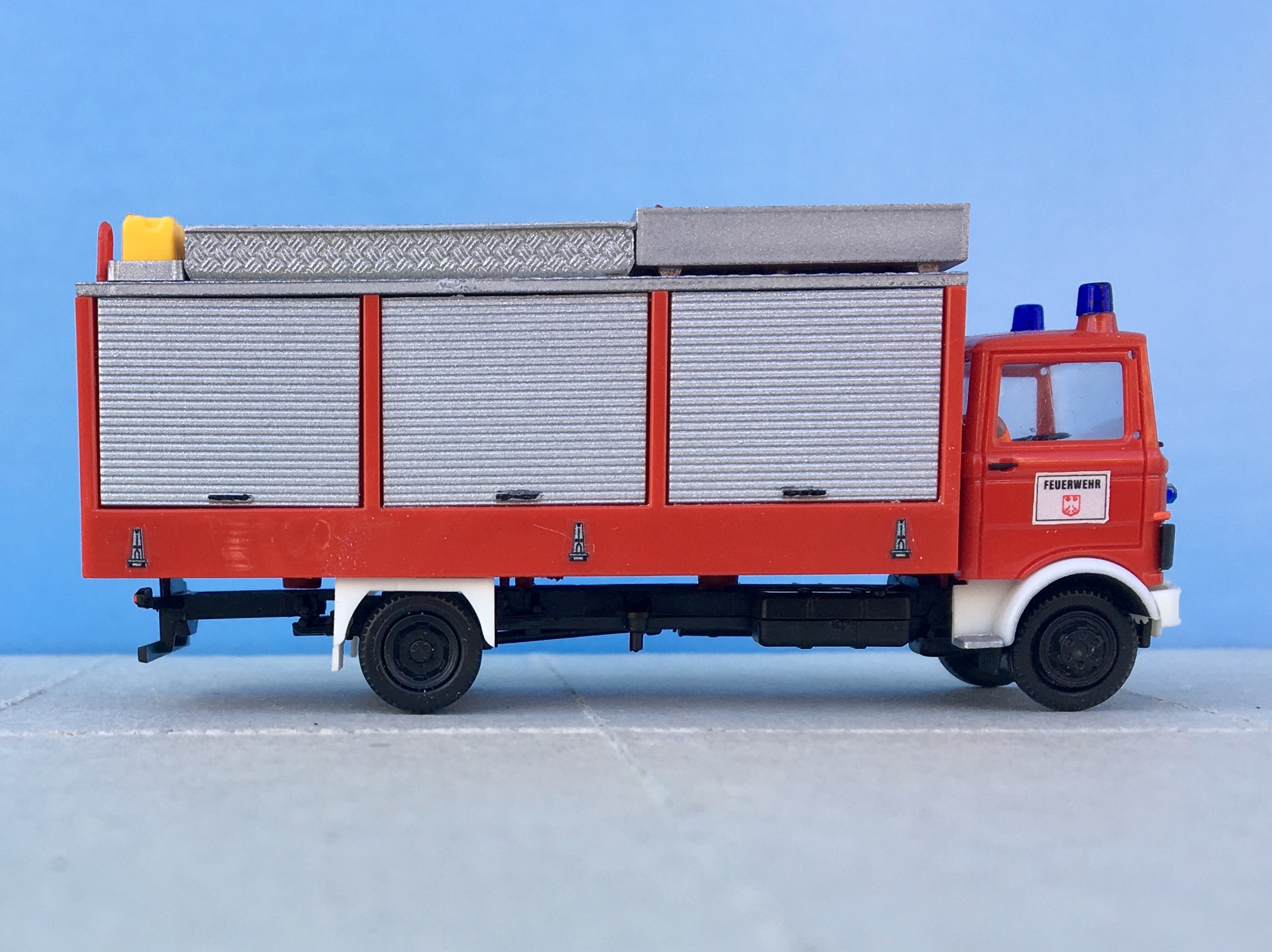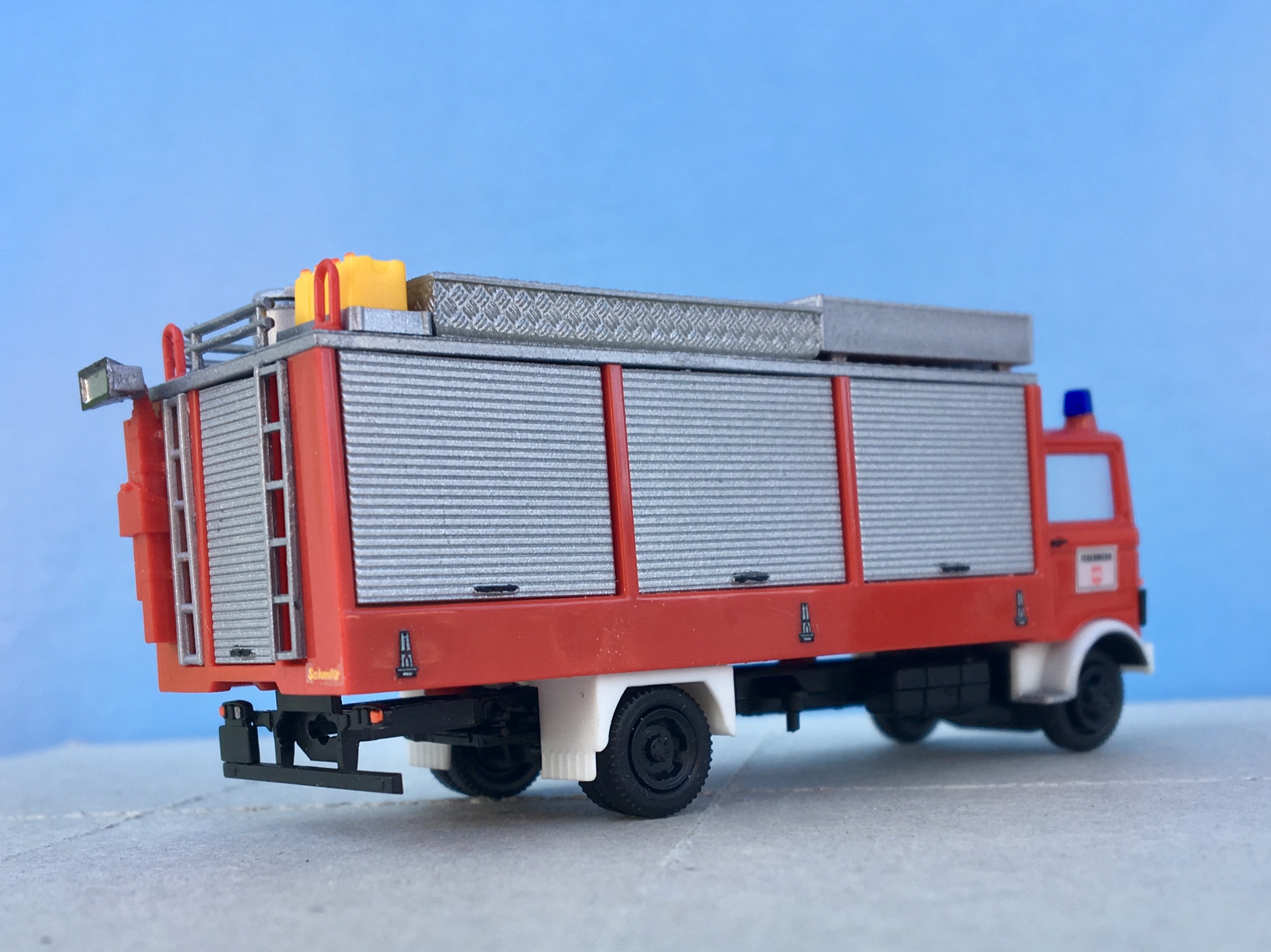 Das Modell entstand aus der Kabine und dem (gekürzten) Fahrgestell des MAN-Kofferwagens "Wasserrettung" (Brekina #45028) sowie dem Aufbau von Preisers Eckhauber-Gerätewagen der FF Nußloch mit den Falttüren von Reinhard Merlau - alles wie immer unlackiert! Der Radsatz ist von Albedo, der Preiser-Lichtmast wurde auf drei Strahler erweitert. Die Propellerrolle der Seilwinde, die vollständige Türbeschriftung und die Kfz-Kennzeichen "GB" folgen noch.
