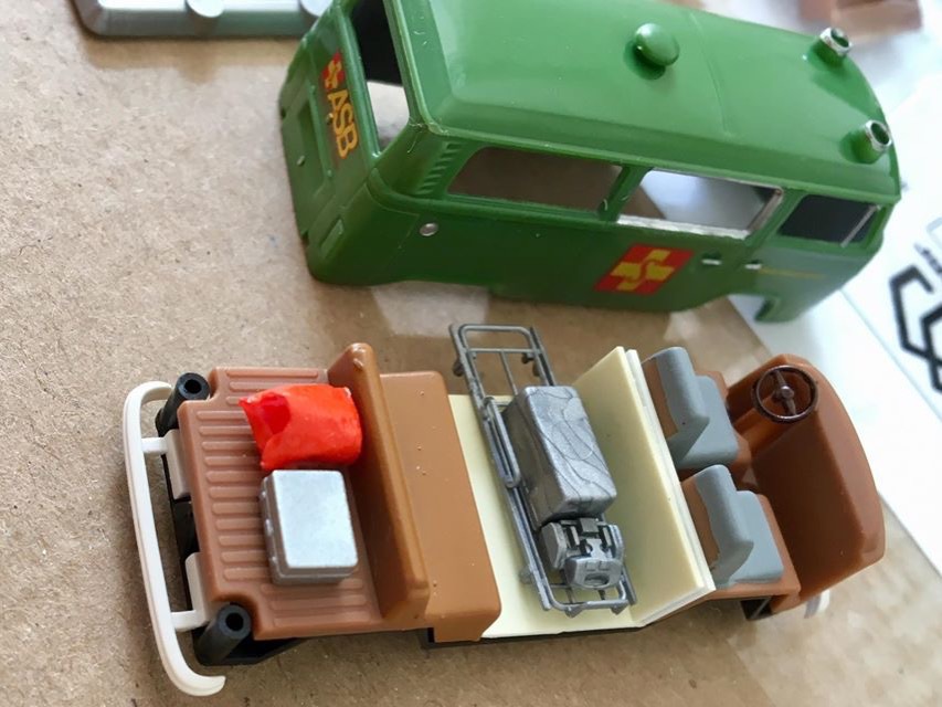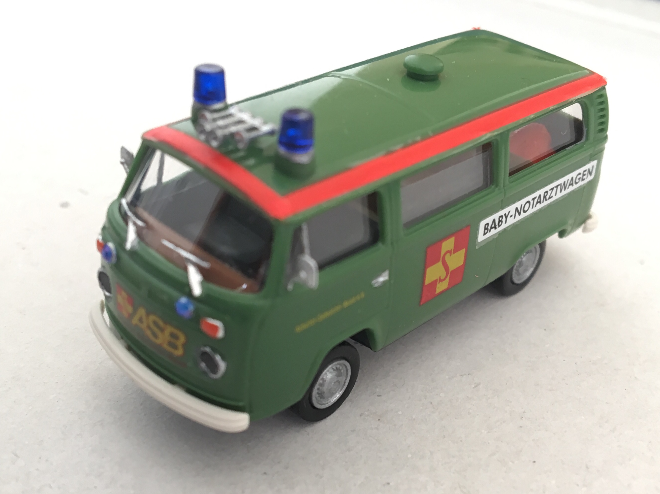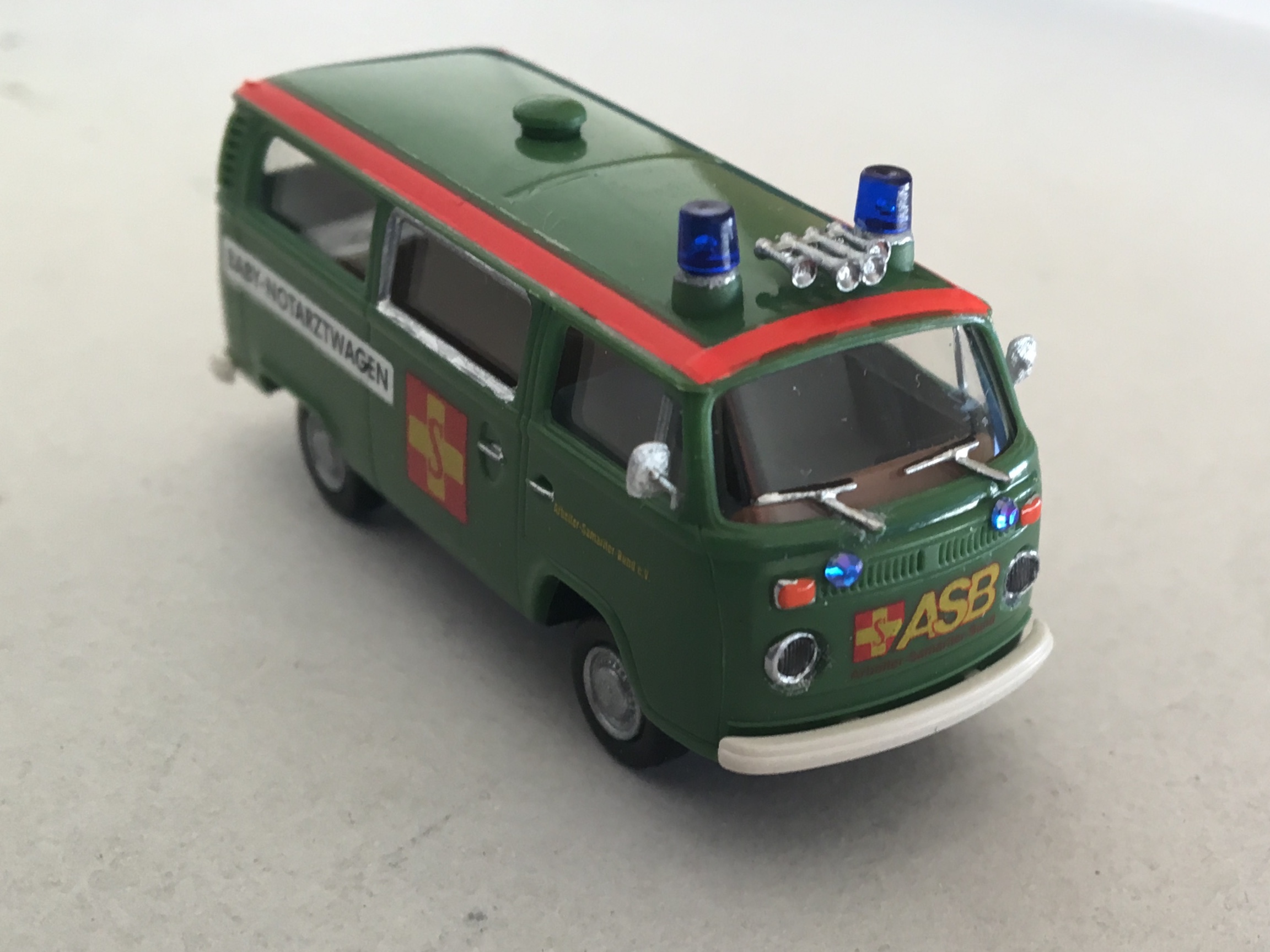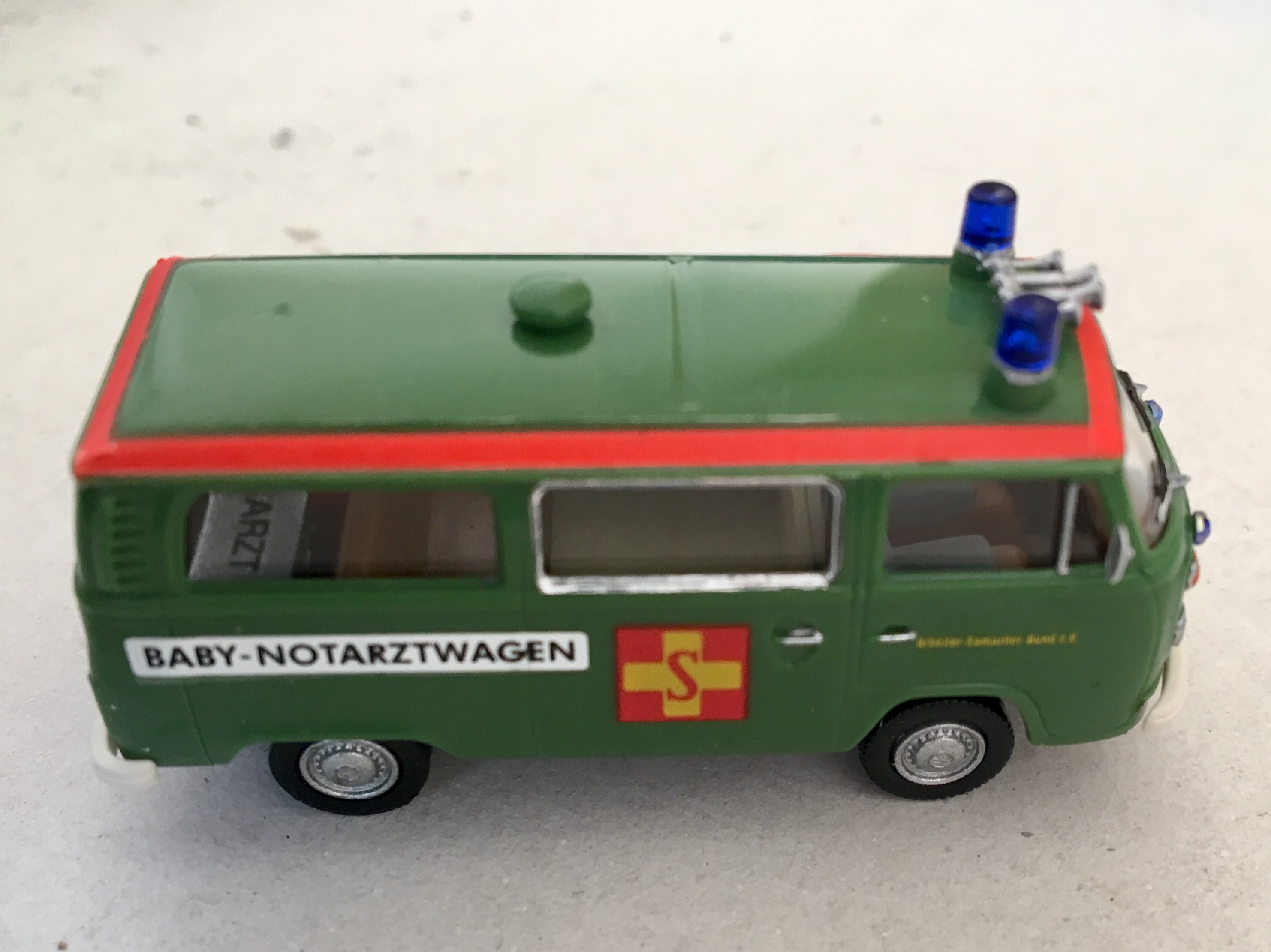 Der Brekina-Bully wurde mit etlichen Kleinteilen, Decals und Chrom-Pinselstrichen aufgehübscht. Hervorzuheben sind die Decals des Hannoveraner Baby-NAW sowie die super Fanfaren von "Remember" Lars Müller! Die Inneneinrichtung wurde nur stilisiert, da das Herzstück eines Baby-NAW - der Inkubator - gerade separat für den "Außeneinsatz" auf Dioramen entsteht. Hier hoffe ich noch auf eine zündende Idee, aus welchem Bauteil die transparente Haube wie auf dieser Abbildung entstehen könnte: