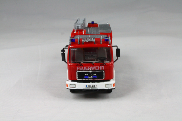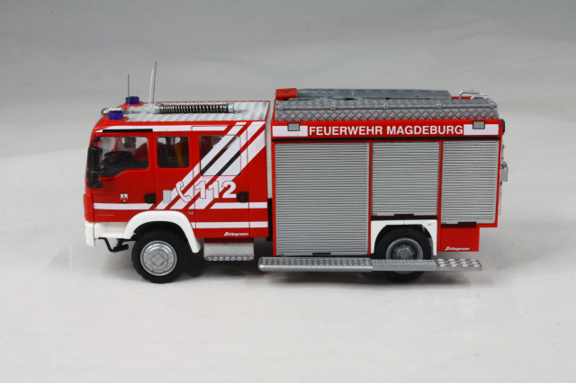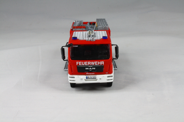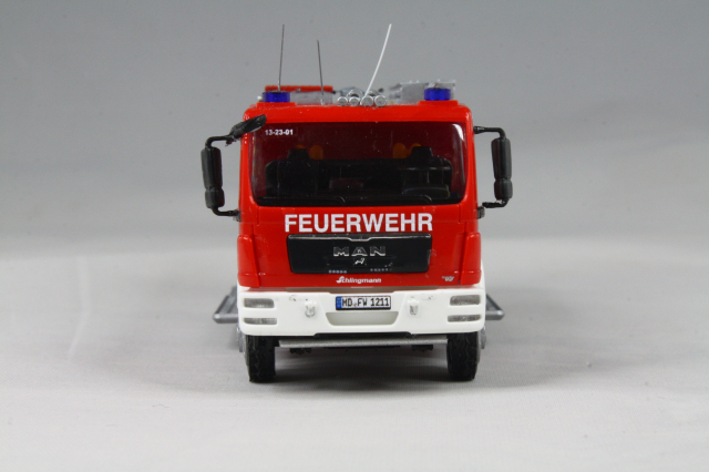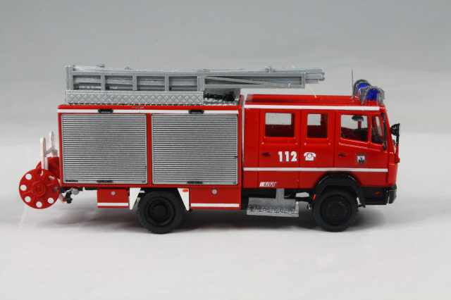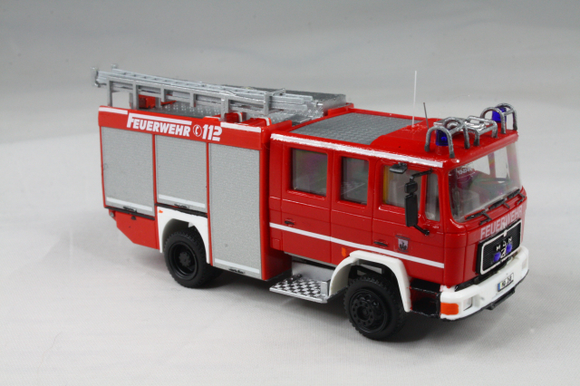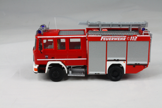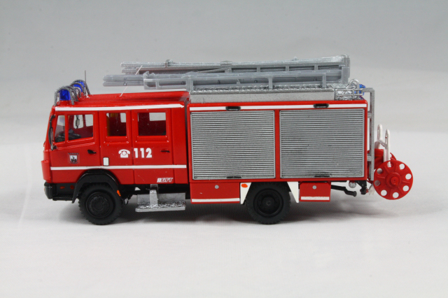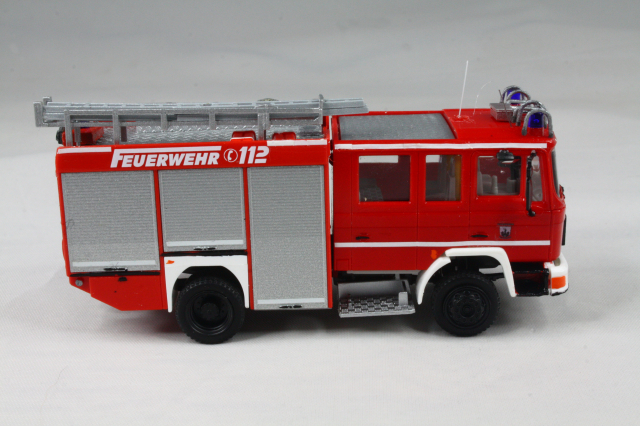 Der Aufbau entstammt den LF 16 SK Modellen von Busch. Der kommt dem Original sehr nahe. Er wurde um die weißen Streifen ergänzt, auf dem Dach die Position der Leiter geändert und die Schiebleiter entfernt. Zudem fanden Schlauchbrücken von Preiser Platz. Mit einer Platte wurde die Halterung für einen Dachmonitor angedeutet. Die Heckkonsole wurde lackiert und bekam einen Triblitz verpasst. Abschließend noch diverse Decals und unter den vorderen Geräteräumen die Andeutung eines ausfahrbaren Trittbrettes aus Busch Hochwasserstegen.