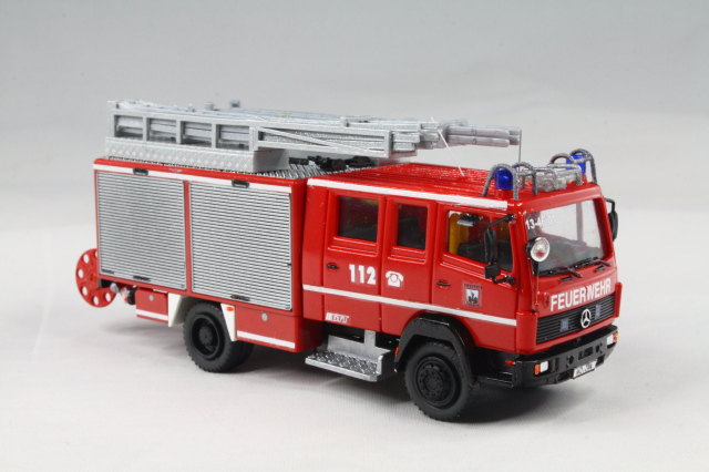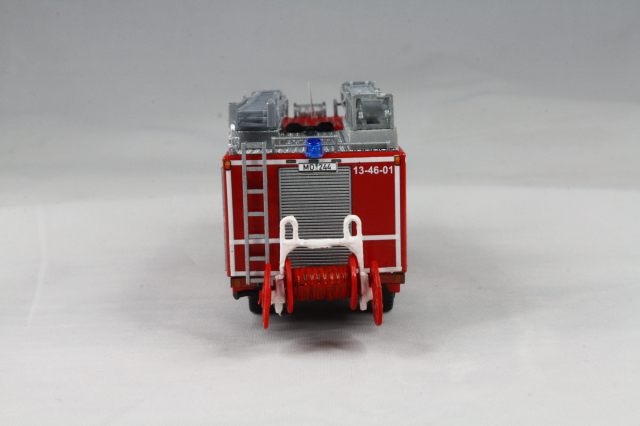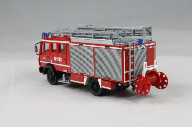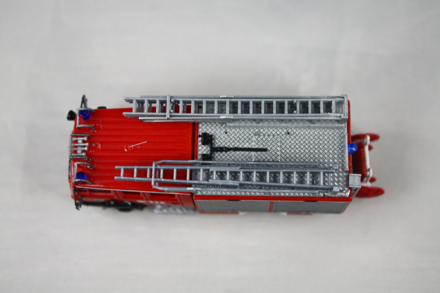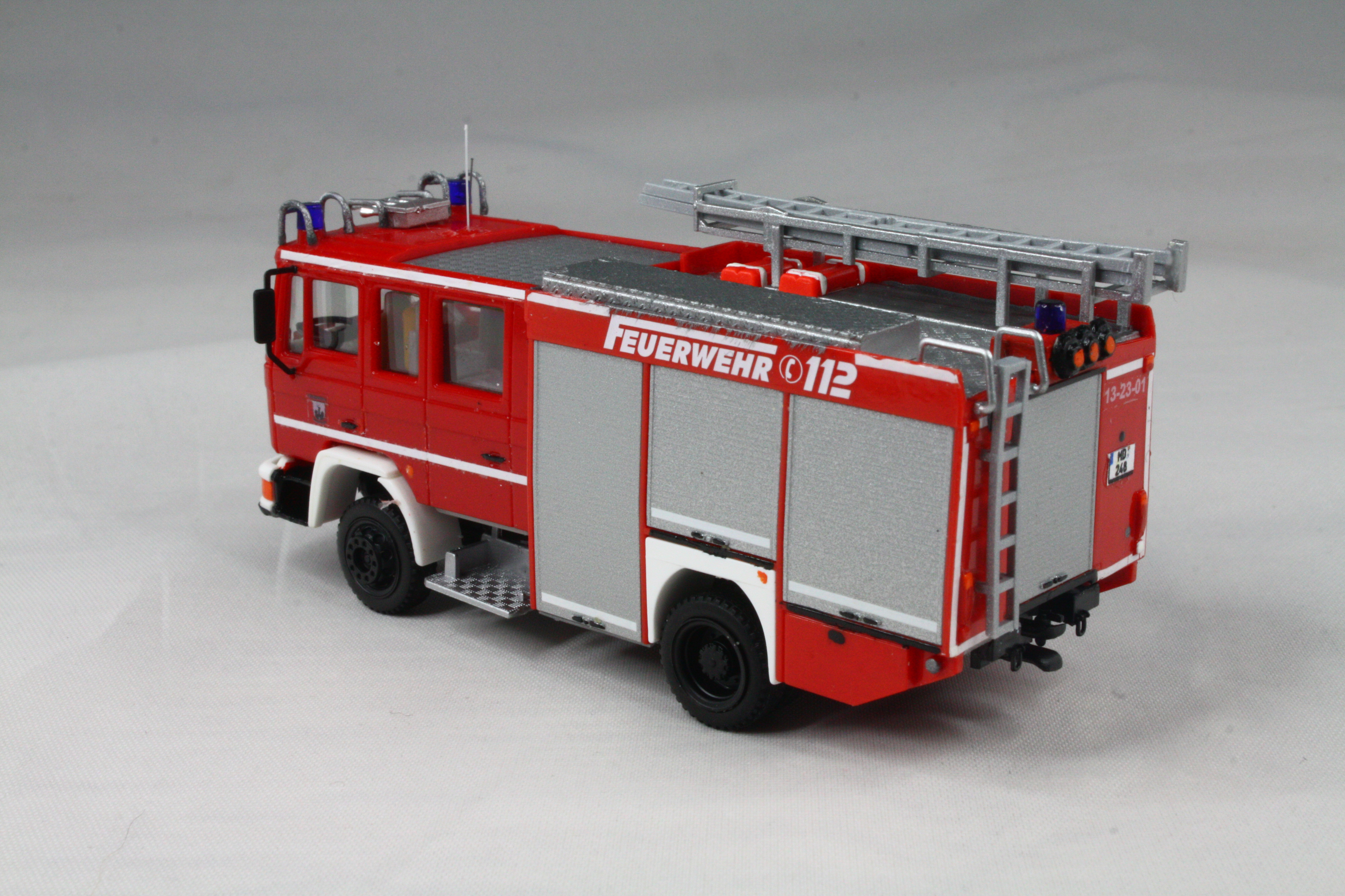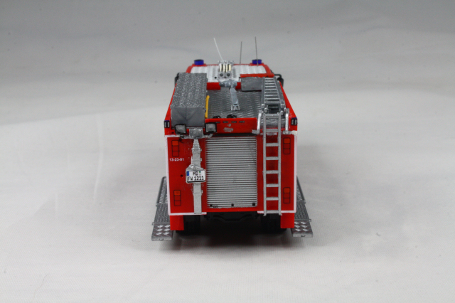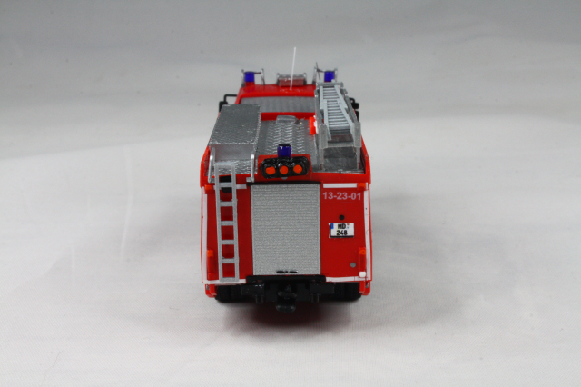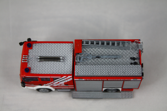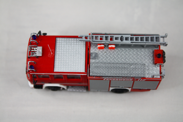 Vorbild). Das erste Fahrzeug war allerdings noch ganz anders konzipiert. Insofern musste hier auf dem Dach komplett Hand angelegt werden. Das Dach wurde um 180 Grad gedreht, sodass die Dachbox auf die Fahrerseite wanderte. Drei Sätze Steckleitern von Rietze wurden vorbildgetreu und unter massivem Schnittverlusten zerlegt und dann alle vier Teile versetzt übereinander verlastet. Der Wasserwerfer stammt aus dem 3D-Drucker von MMH, die Saugschläuche waren vorhanden. Mit Hilfe einer Kiste von Busch, die farblich angepasst wurde, wird die Kiste für die Schlauchbrücken angedeutet. Mit Resten von Spritzlingen wdrden die Entlüftungsöffnungen und Befüllstutzen für die beiden Schaummitteltanks angedeutet. Am Heck tauschen Heckleiter und Lichtmast den Platz. Bereits im Original wurde ein falscher Lichtmast verbaut. Dieser wurde etwas angepasst und weiter verwendet. Mit Decals wurden die Heckblitzer, sowie Funkkenner angebracht. Unter der Kabine habe ich mit dem Rohr eines Rietze Lichtmastes die Bodensprühdüsen angedeutet. Zum Schluss wurden die falschen Blaulichter vorn noch gekürzt und so dem Original näher gebracht. Am Heck verschwanden sowohl die blauen Aufdrucke für das Heckblaulicht als auch die Kennleuchte und wurden durch Decals ersetzt.