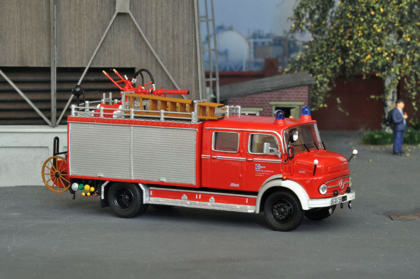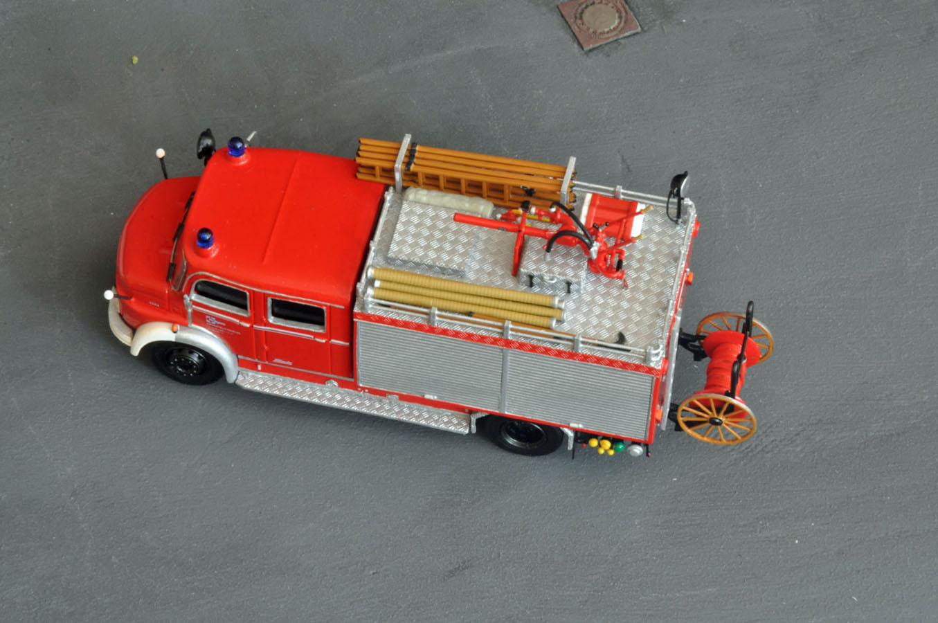 Basis für die beiden Metz-Fahrzeuge sind natürlich die Brekina-LF bzw. TLF. An den Kabinen musste der Kühlergrill gegen einen vom Brekina Kurzhauber-LKW getauscht werden. Die Seitenfenster der Brekina-Fahrzeuge sind außerdem zu klein (Unterkante beachten), wurden daher vergrößert sowie mit Rahmen versehen. Neue Blaulichtsockel, Peilstangen und Kleinteile wurden außerdem ergänzt. Die Fahrgestelle wurden etwas tiefer gelegt (Straßenantrieb), Reifen gegen DS-Design Reifen getauscht. Sehr gut gefallen mir dagegen die Trittbrettkästen.