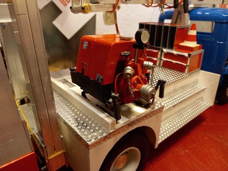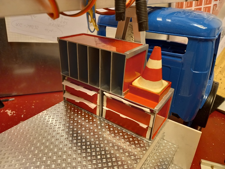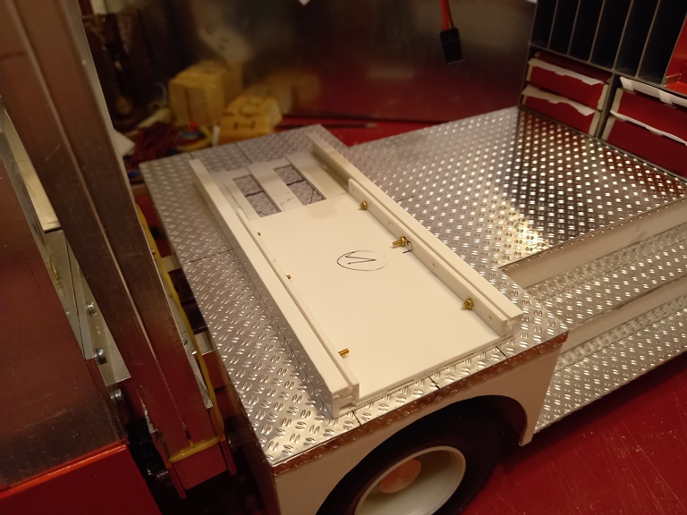 Der provisorische Aufbau aus Pappe ist mittlerweile durch den endgültigen Aufbau aus Polystyrol ersetzt worden. Dieser wurde schon mit 0,5mm starkem Alu-Riffelblech beplankt. Damit die Plattform nicht so leer aussieht gab es noch ein schickes Regal für Schläuche und Schlauchbrücken.