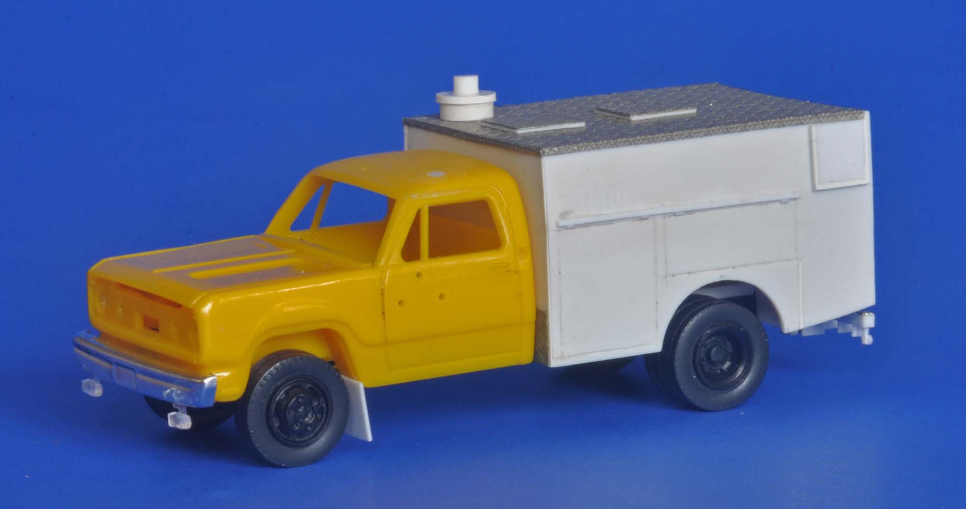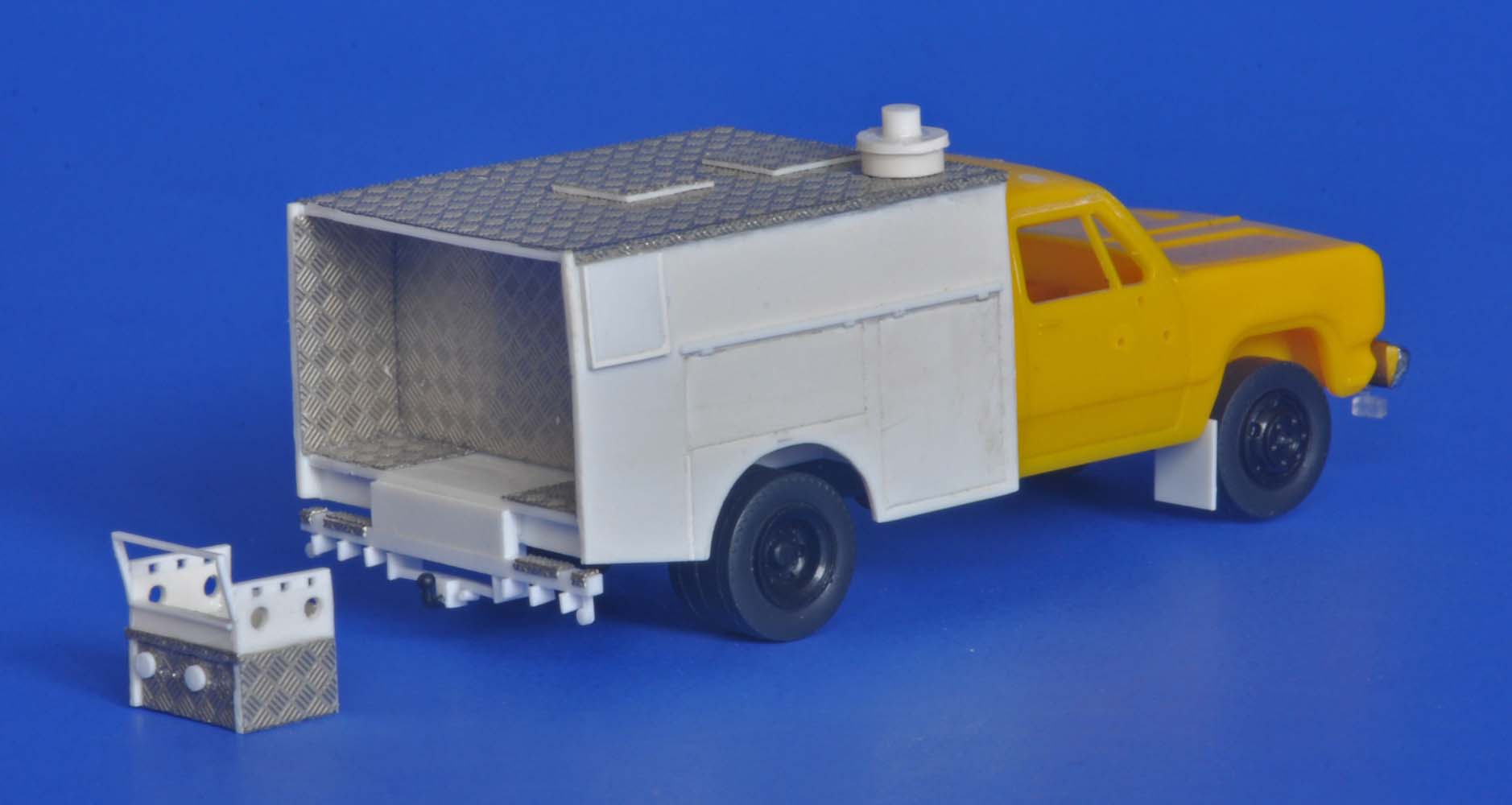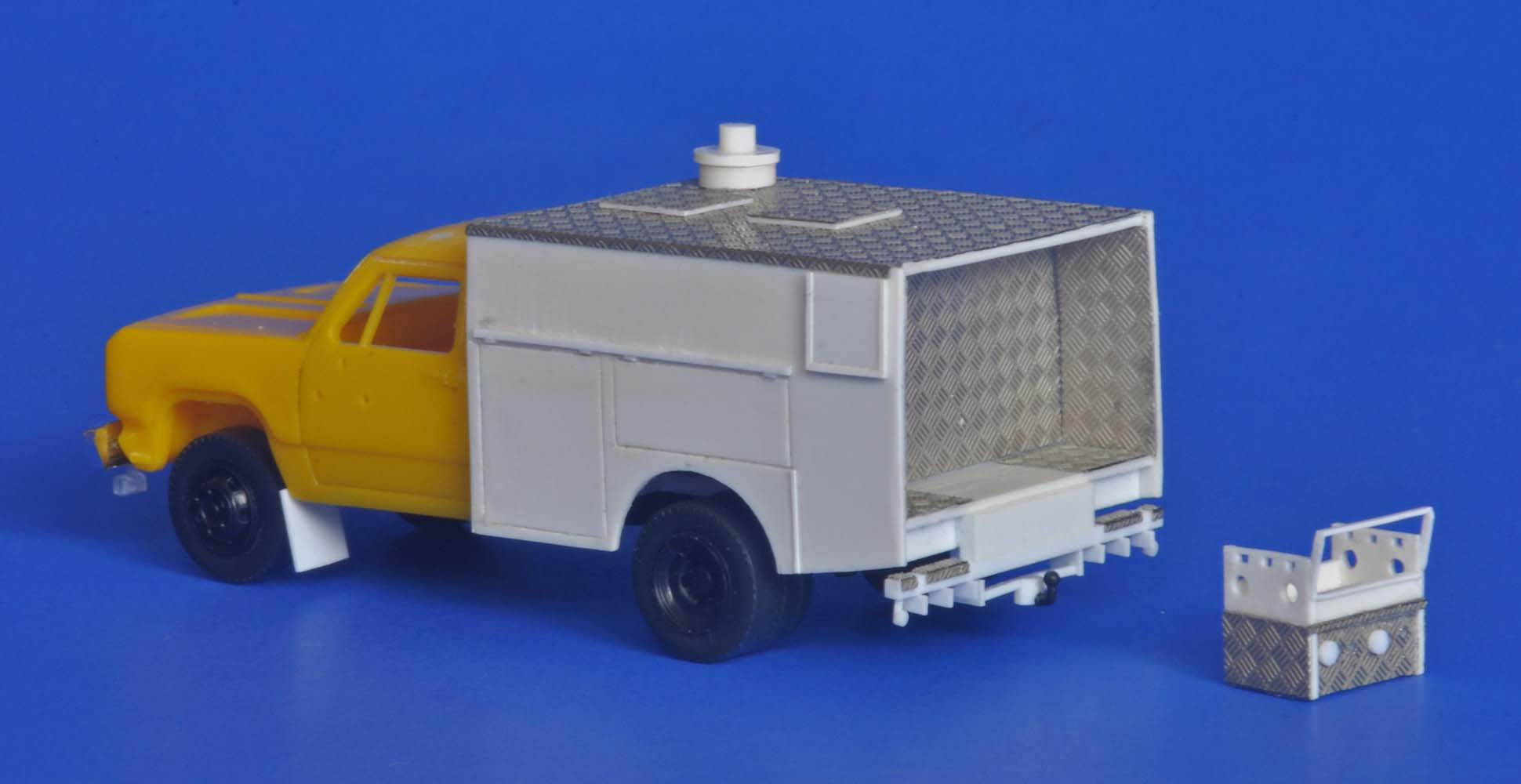 Die Kabine wurde natürlich auch hier wieder einen mm höher gesetzt, aber sonst nur wenig verändert. Räder von Roskopf. Der Aufbau entstand aus P&P mit FKS-Blechen. Der aufwendigste Punkt war das Heck mit der auch von Kronenburg verwendeten US-Haspel (siehe Cheetah Berlin). Die beiden rollbaren Feuerlöscher daneben entstanden aus Rundprofilen mit oben einem Bügel, darunter zwei kleinen Rädern ebenfalls Profilen und dem Schlauch. Dieser wurde aus 0,4 mm Profilen gebogen. Das Schwierigste hierbei waren aber die Schlauchfächer aufgrund der runden Formen. Dafür habe ich eine 0,3 mm Platte rund gebogen, zusammen geklebt, dann von innen mit Klebstoff eingeschmiert und in der Schieblehre eingespannt bis das Teil die Form beibehalten hat. Nicht einfach, hat aber zwei Mal geklappt.