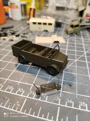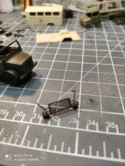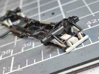 Die hinten, von unten offene Karosserie wollte ich so auch nicht lassen und habe sie mit einem zurechtgefeilten Sheetplättchen verschlossen... ebenso habe ich die vorderen Plattformen für Scheinwerfer und Tarnlicht ergänzt, da diese ja am original Kühlergittermodellteil mit angegossen sind....