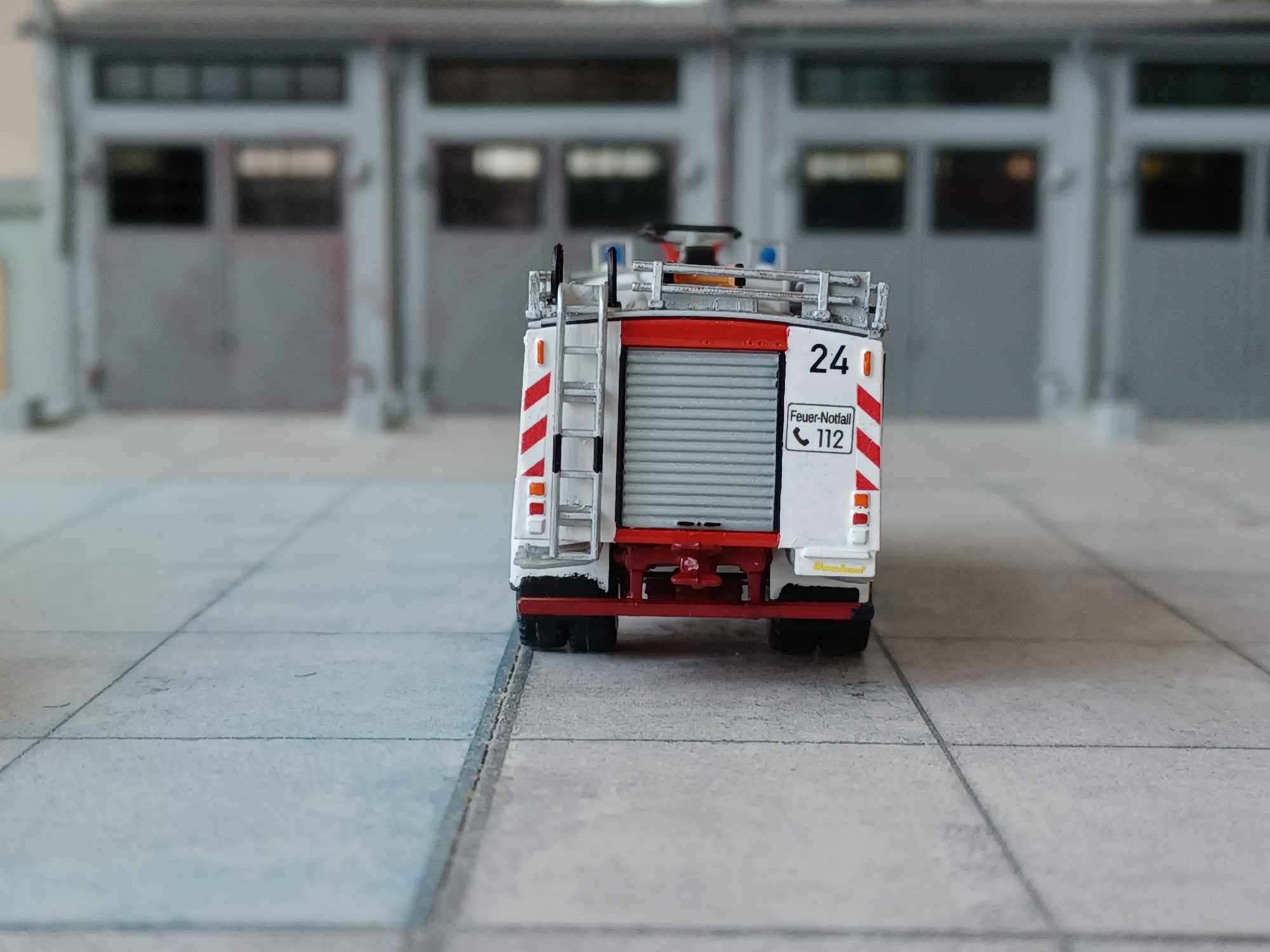 Das Modell entstand aus einem Preiser WAF Bausatz und dem Aufbau vom TLF 24/50. Vorne entsprechend gekürzt und mit Riffelblechplatte verschlossen. Dazu Kleinteile und Decals