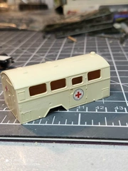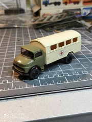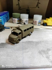 Der Mercedes bekommt, nach einer Teilgrundierung zur Kontrolle der Spachtel-/Schleifstellen sowie zum Egalisieren des Gesamtbildes, weiter Details wie z.B. Staukästen, Ersatzkanister, Bremsklötze, etc....