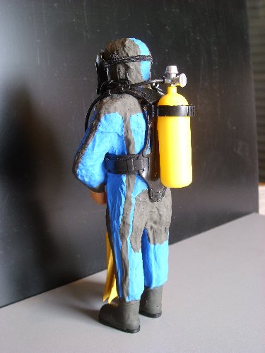 der Taucheranzug ist aus 8-10 Schichten Küchenkreppapier hergestellt, das direkt mit wasserverdünntem Holzleim auf die Figur geklebt wurde.