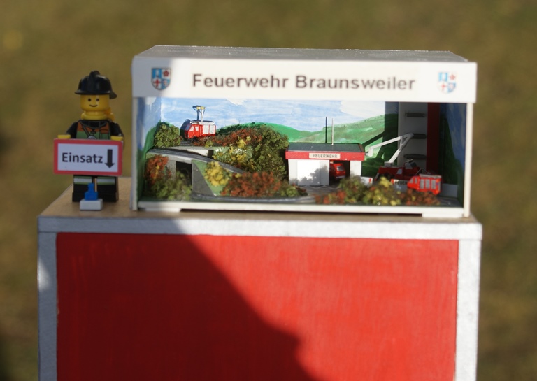 Das Ausstellungsdiorama der Feuerwehr Modellbaugruppe Braunsweiler ist bereit für die neue Ausstellungssaison. Neben den beiden beleuchteten Fahrzeuge mit je zwei Blaulichtern ist auch noch eines der Fahrzeuge mit einem Flutlichtmast ausgestattet. Weiterhin ziehen zwei weitere Einsatzfahrzeuge unermüdlich ihre Kreis rund um die Feuerwache.