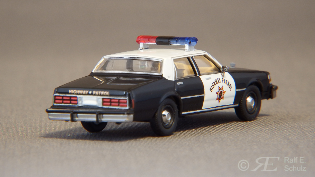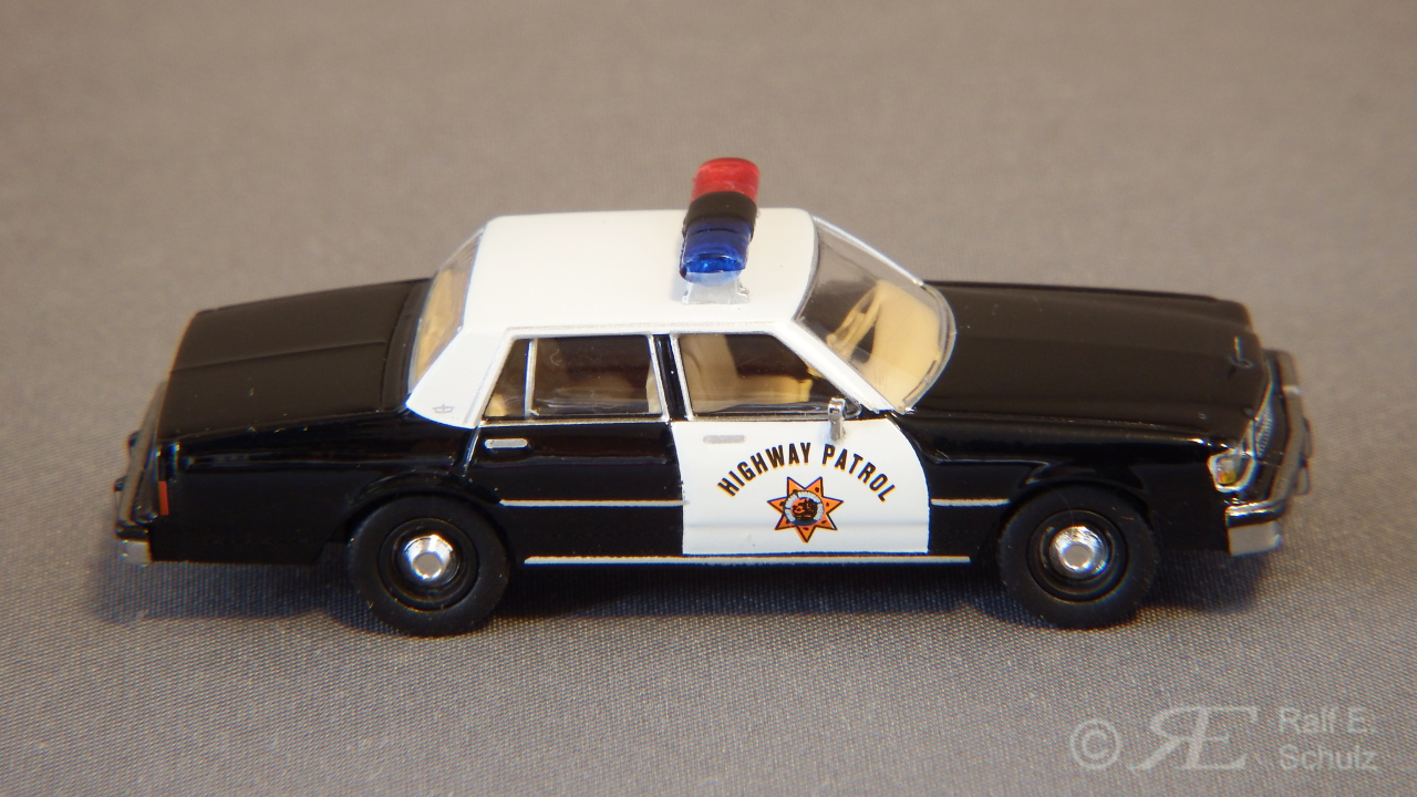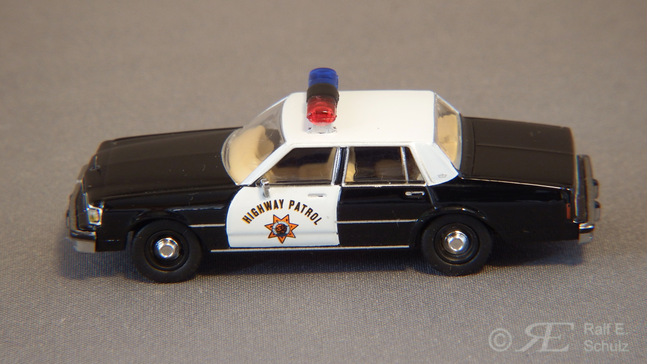 Übrigens könnte man beim CHP Caprice den Schriftzug "Safety and Service" an den Seiten hinten vermissen, den viele CHP Fahrzeuge auch seinerzeit hatten. Aber die Vorbildrecherche ergab hier kein eindeutiges Ergebnis, die meisten Wagen (auch Caprice '87) hatten diesen Schriftzug, aber längst nicht alle; zudem war er wohl auf der Beifahrerseite nicht vorhanden, wenn dort hinten an der Seite eine Antenne verbaut war. Dass dieser Schriftzug hier also fehlt, ist schade, aber offenbar nicht grundsätzlich falsch.