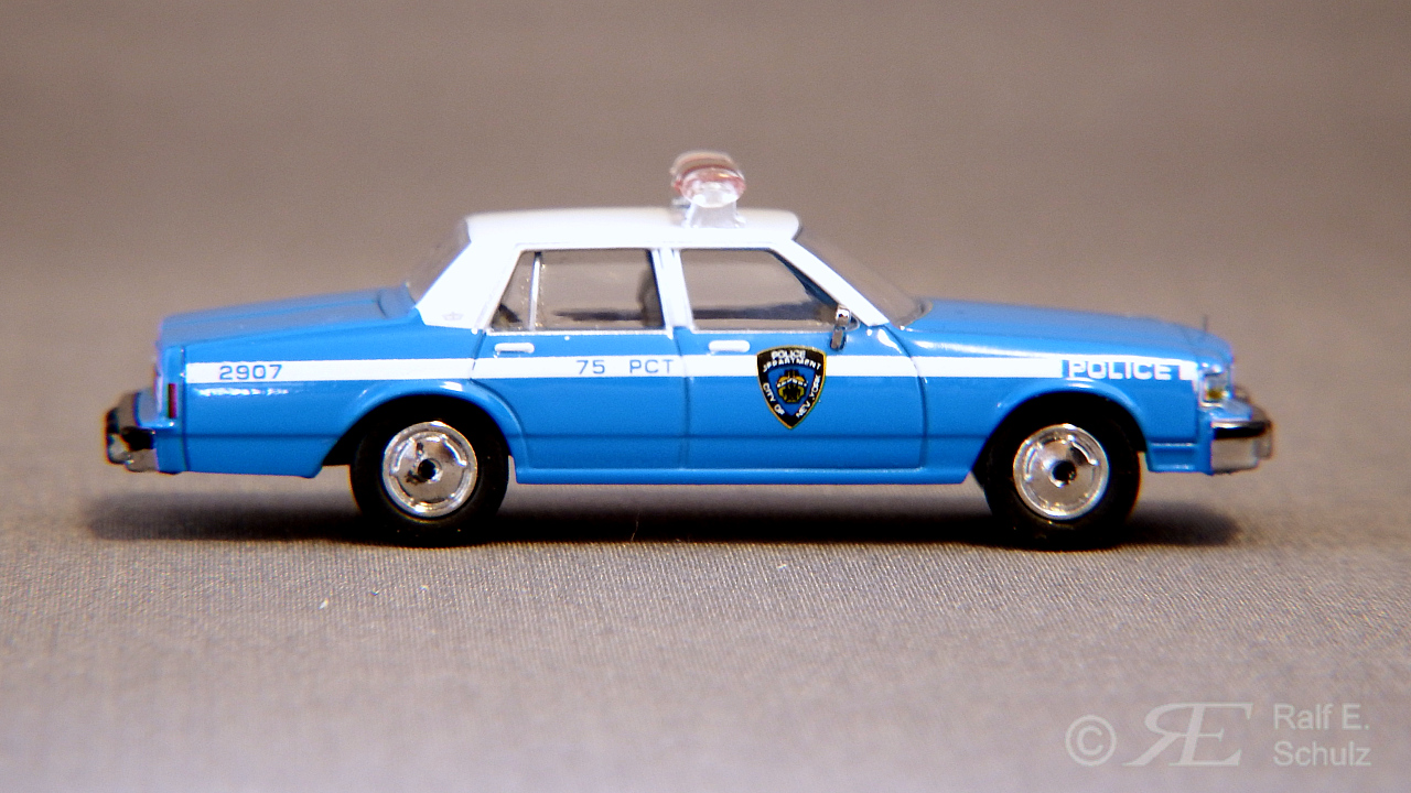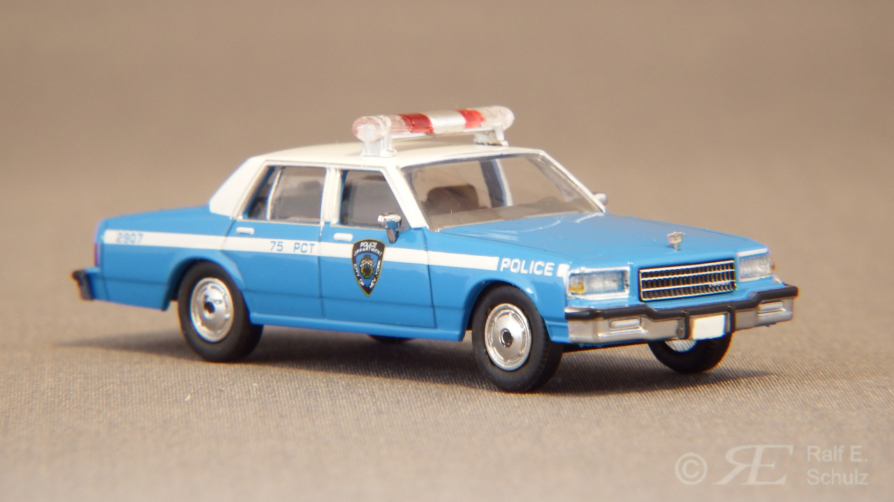 Brekina hat insgesamt fünf Versionen des Caprice aufgelegt, zwei zivile Caprice Classic (Schwarz und Weinrot-Metallic, Speichenfelgen), ein gelbes Taxi nach New Yorker Vorbild (mit Caprice Felgen/Radkappen), ein Streifenwagen des NYPD und einen Wagen nach Vorbild der CHP (California Highway Patrol) - für dieses Modellforum werde ich auch nur die beiden "Blaulicht"-Versionen direkt vorstellen.