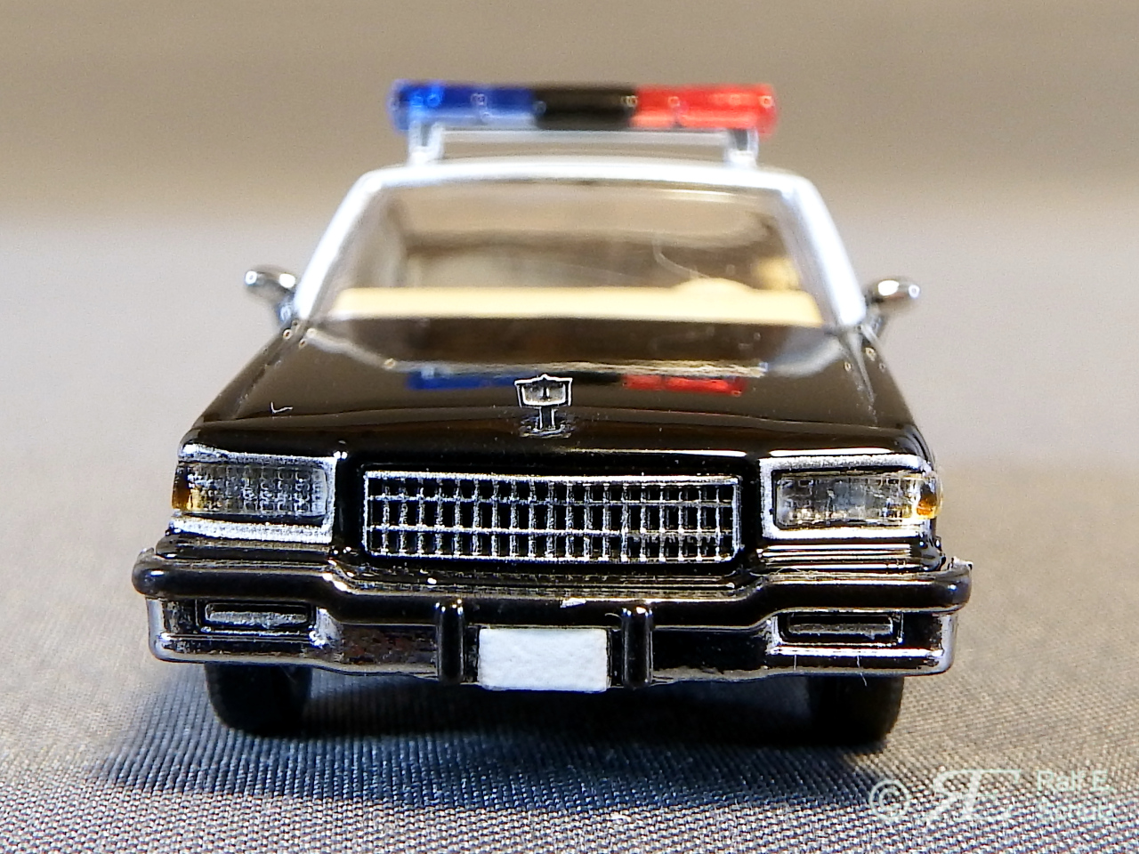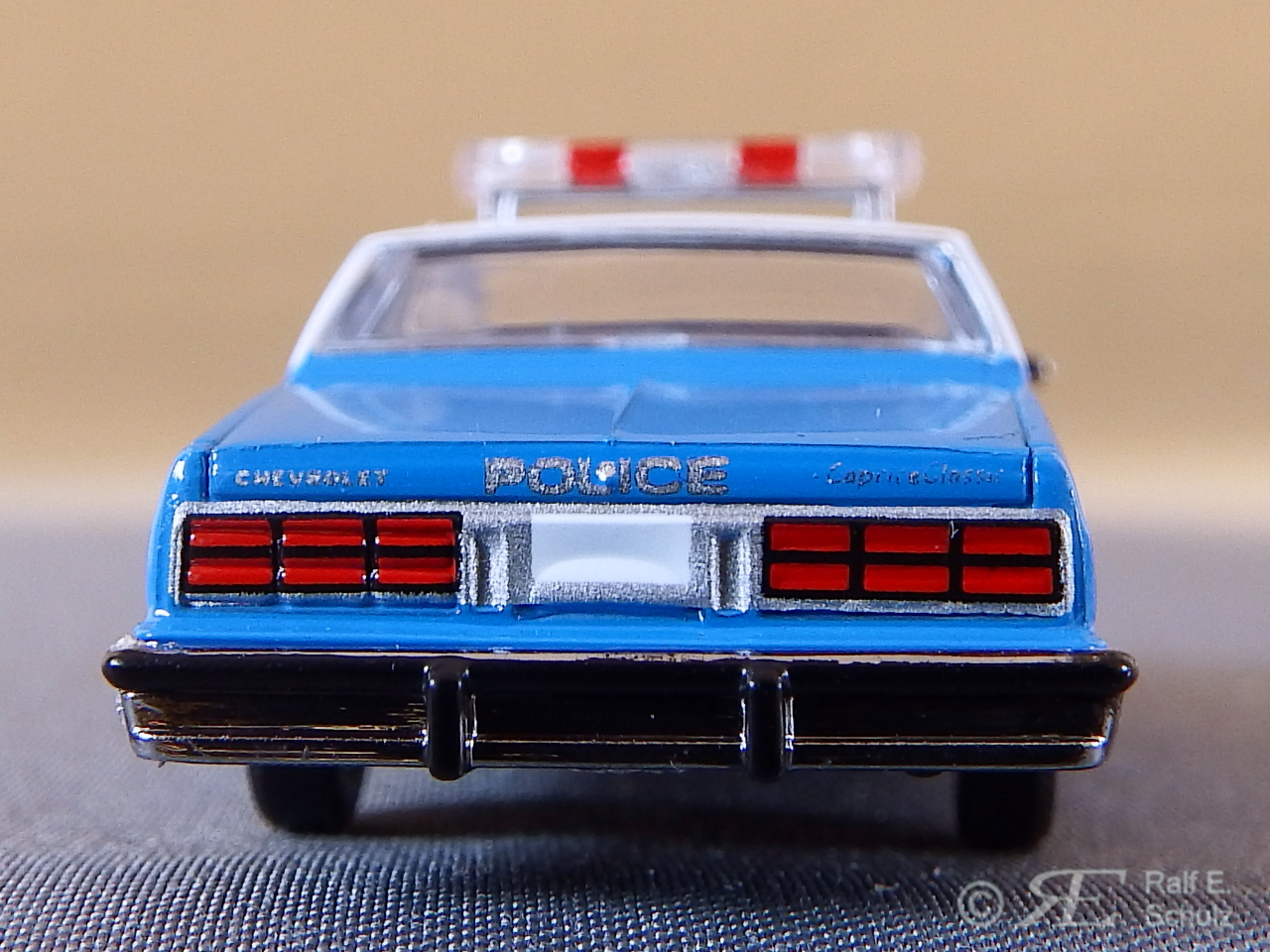Leider können die Brekina Modelle bei der Bedruckung auch nicht so richtig punkten, die scheint bei der Qualität reine Glückssache zu sein: Die Beifahrerseite hat in der Regel noch einen qualitativ guten Druck (das ist die Sichtseite in der Schachtel, ein Schelm, wer böses dabei denkt), die Fahrerseite fällt bei vielen Modellen auffallend ab - bei einem CHP Modell ist der Silberdruck um die Fenster mit Türgriffen und Caprice-Krone doppelt, weil der vermutlich erste Versuch im wahrsten Sinne des Wortes völlig schief ging; manche Händlerfotos zeigen, das ist nicht nur bei mir so passiert. Auch sonst sind ein paar Silberdrucke nicht wirklich sauber, z.B. die Scheinwerferrahmen. Schön ist wiederum, dass die Front Marker Lights in der verchromten Stoßstange mit Silber farblich abgesetzt sind, auch die Gummileisten sind schwarz aufgedruckt, stimmig sind auch die roten Side Marker Lights hinten. Ebenso in Ordnung ist der Druck auf der Kofferraumklappe des NYPD.