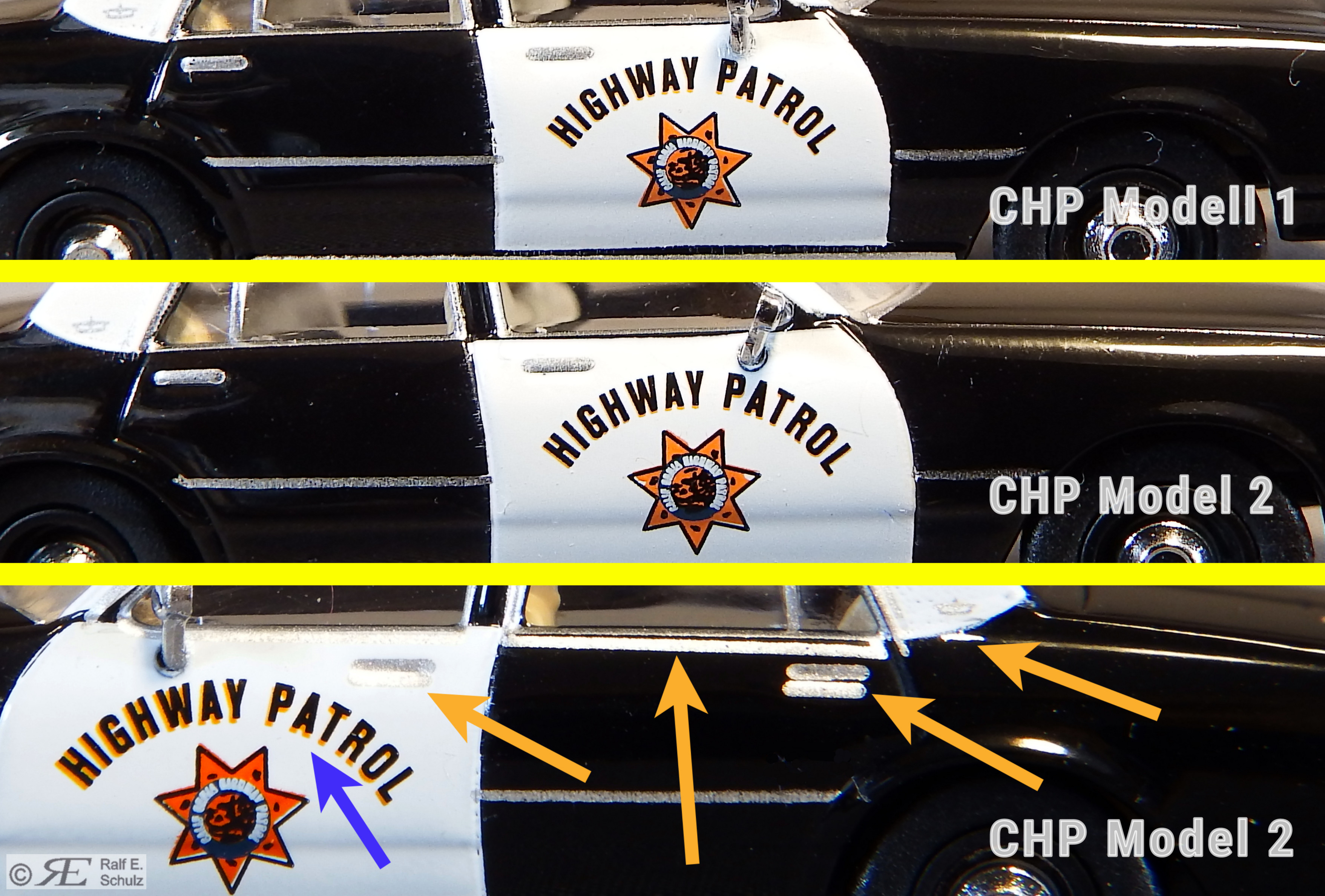Völlig "daneben" ist aber nun der Türaufdruck des CHP: Ist der Schriftzug auf der Kofferraumklappe noch richtig in Goldfarbe aufgedruckt, ist der Türaufdruck unverständlicherweise lediglich in Orange statt Gold gehalten! Dabei hat sich zudem ein grober Fehler in der Reihenfolge des mehrfarbigen Drucks eingeschlichen: Der Schriftzug auf den Türen müsste Gold (hier zumindest Orange) mit schwarzem "Schatten" sein, die Druckreihenfolge aufgrund des (eigentlich sogar recht schönen) Sterns ergibt aber genau das Gegenteil, schwarze Schrift mit farbigem Schatten.
