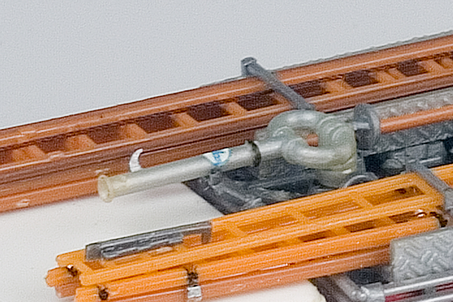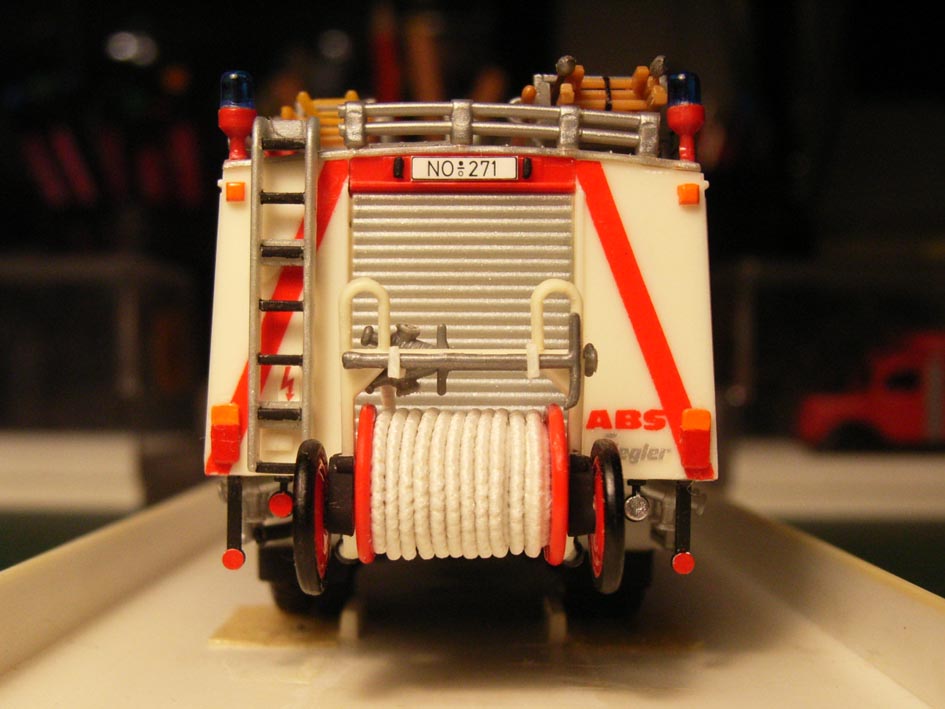 Das mit Abstand meistgenutzte Fahrzeug des rot-weißen Löschzug 6 war das Hilfeleistungslöschfahrzeug, sein Modell besteht im Wesentlichen aus den bewährten Serienteilen der Ziegler-Produktion (Preiser-Nr.1128). Wie bei fast allen Nordstadt-Modellen, so wurden auch beim HLF 6 viel Zeit und noch mehr graue Zellen in die Umgestaltung der Dachfläche investiert; ganz abgesehen vom benötigten Vorrat an Klein- und Zurüstteilen! Der geneigte Leser möge sein Augenmerk bitte auf solche Kleinigkeiten wie den im Aufbau integrierten Flutlichtmast, die geänderten Druckabgänge und den umfangreichen Bestand an tragbaren Leitern lenken. Ein bei der Firma Alco gefertigter, tragbarer Monitor krönt die Dachfläche; er entstand aus einem Roco-Werfergestell und dem Schaum-Wasser-Werfer des TLF 24/50 von Preiser. Ergänzt durch eine fahrbare Schlauchhaspel, Einreißhaken, Abgasschlauch und Roco-Saugschläuche verließ das neue rot-weiße Hilfeleistungslöschfahrzeug das Werksgelände von Ziegler.
