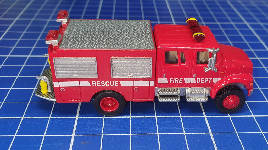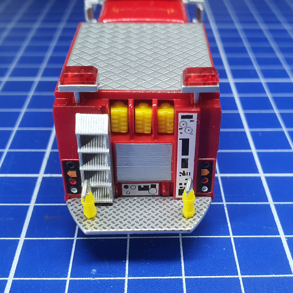 Dasselbe gilt für den Fire Rescue, bei dem nicht mal klar ist, was der genau darstellen soll. Er läuft mal unter "First Responder" (gewissermaßen ein "Vorausrüst-Löschwagen mit Sanitätsausrüstung"), mal wird er auch der Waldbrandbekämpfung zugeordnet... Jedenfalls der Überstand am Heck zeigt, dass das ein älteres Vorbild ist, heutzutage sind solche Standflächen eher out, wenn man sich die moderneren Fahrzeuge so anschaut.
