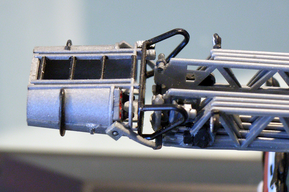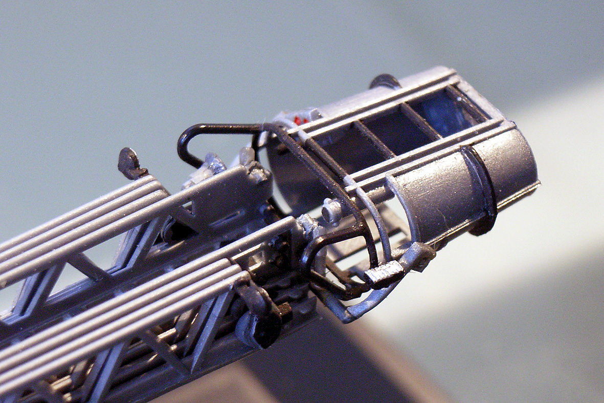 Der vierteilige Leiterpark wurde in den Werkstätten der Branddirektion Nordstadt (d. h. auf meinem Basteltisch) wieder zur Vario-Leiter umgerüstet. Blickfang außer dem vorgehängten Rettungskorb ist sicher auch der in Eigenarbeit erstellte Generator. Wie auch ihre „Schwester“-DLK 1 bekam die Drehleiter des LZ 6 einen Lüfterschlauch und eine Schleifkorbtrage; zusätzlich wurden noch drei Feuerlöscher verladen und ordentlich verzurrt.