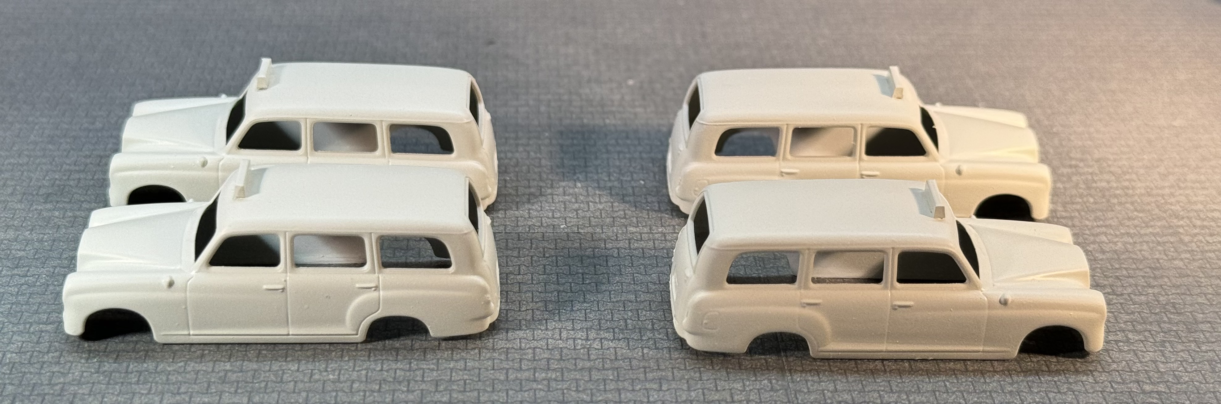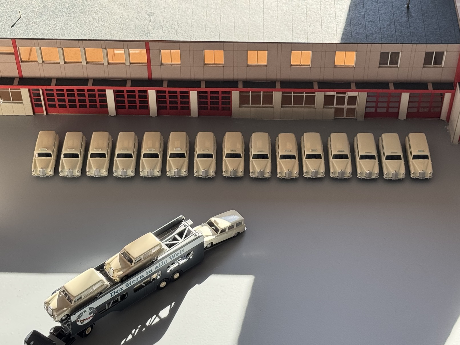Auf der Aufnahme rechts kann man die acht Fahrzeuge des Typs erkennen, welche nachweislich auf der Wache neben einem Leichenwagen auf MB L319, sowie einem KTW auf MB L 319 und dem GrKW auf Büssing TU im Einsatz waren. Davon haben mich momentan fünfzig Prozent erreicht und wurden bereits demontiert und nach Grundierung mittels Vallejo Ivory (hellelfenbein) in ihrer Ursprungsfarbe lackiert.